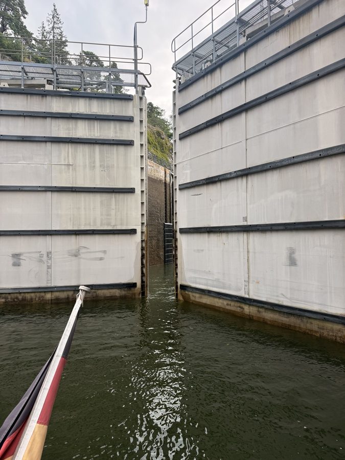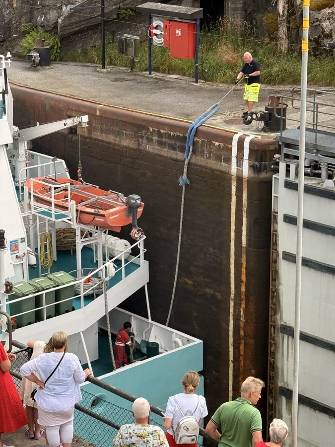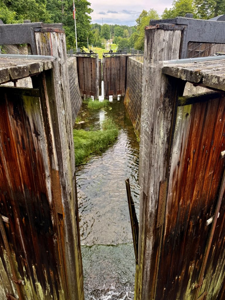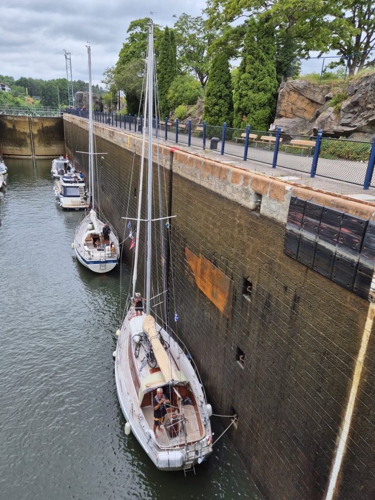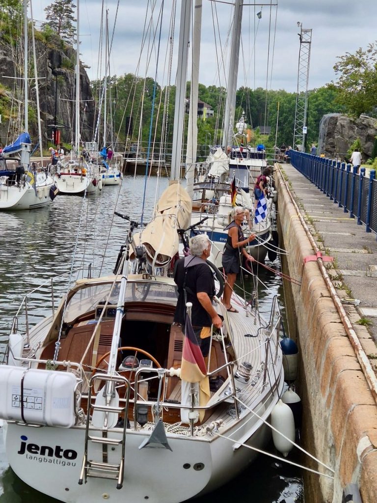Nach einer ruhigen Nacht – dank der Notverbände gab es keine Schmerzbeschwerden an den Wunden – legen wir schon vor neun Uhr ab, um in jedem Fall die erste Schleusung zu erwischen. Der Plan geht auf, auch wenn wir als letztes von sieben Schiffen in die Schleuse einfahren. Alle anderen haben „aktiv angestanden“ – eigentlich Barbaras Spezialdisziplin. In der ersten Schleuse sind wir so gezwungen, auf der rechten Seite festzumachen. Das ist hier noch kein Problem, in den kommenden schon. Denn bei den nächsten drei Schleusen ist wieder nur die linke Seite gemauert, rechts findet sich überwiegend Naturfels und wenig Befestigungsmöglichkeit. So bitten wir in der zweiten Schleuse das vor uns liegende norwegische Motorboot zu seinem „Vorboot“ aufzuschließen. Der Eigner ist von dieser Idee wenig begeistert, sieht aber ein, dass die Lücke vor ihm zu groß ist. In dieser Konstellation bewältigen wir dann auch die nächsten zwei Schleusen ohne Probleme. Barbara ist zwar etwas gehandicapt, aber der Schleusungsprozess ist viel einfacher, als aufwärts im Göta Kanal. Die Herausforderung sind hier lediglich die Höhen und die wenigen Befestigungspunkte.