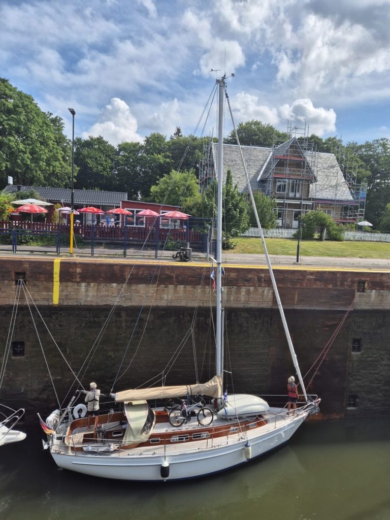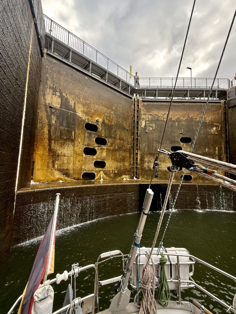 Währenddessen erkundet Werner ausgiebig das Areal der alten Schleusentreppen, beobachtet die Schleusung großer Schiffe und genießt „ausgestreckt“ das Cockpit.