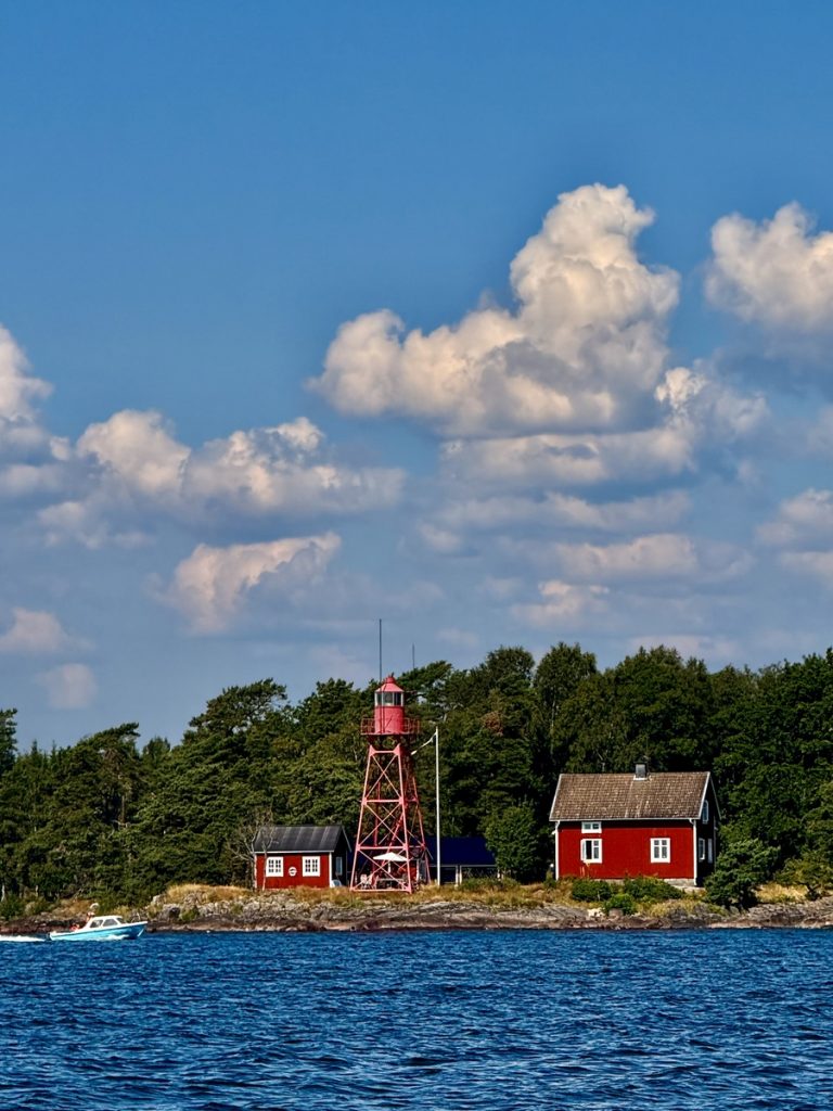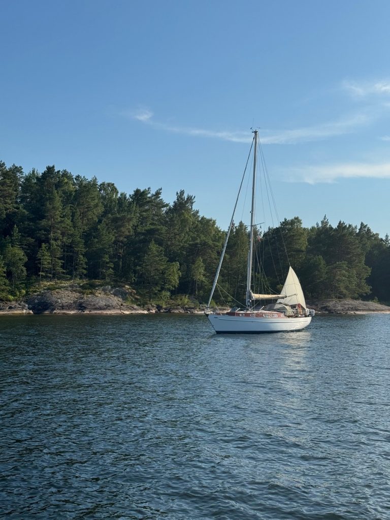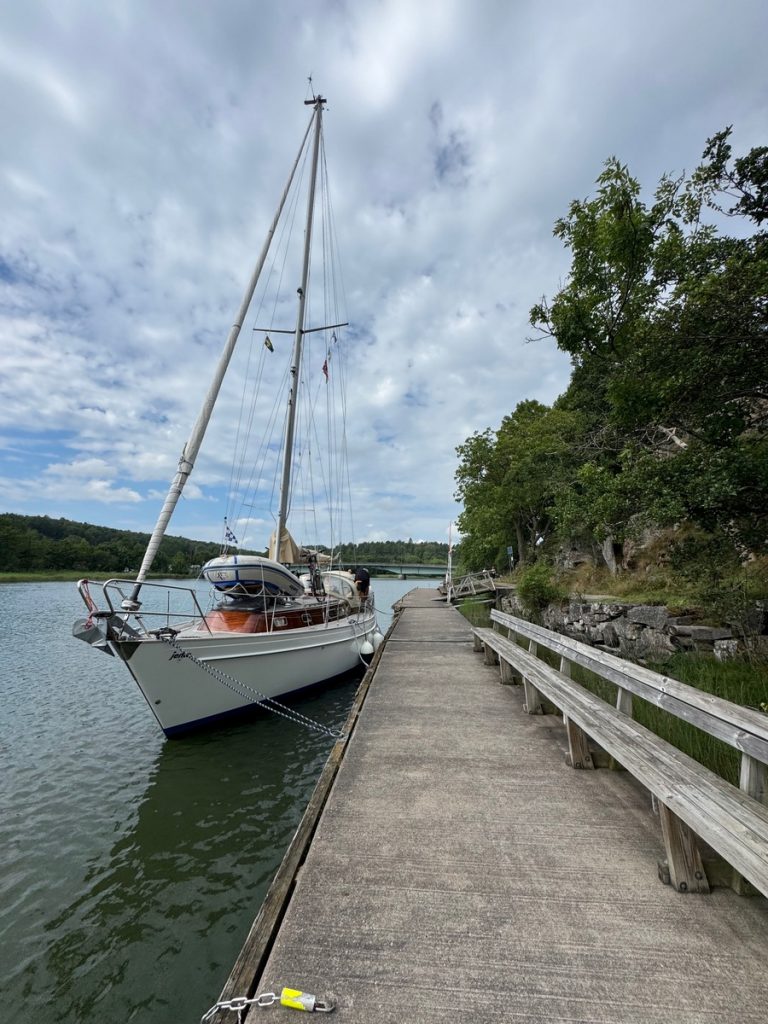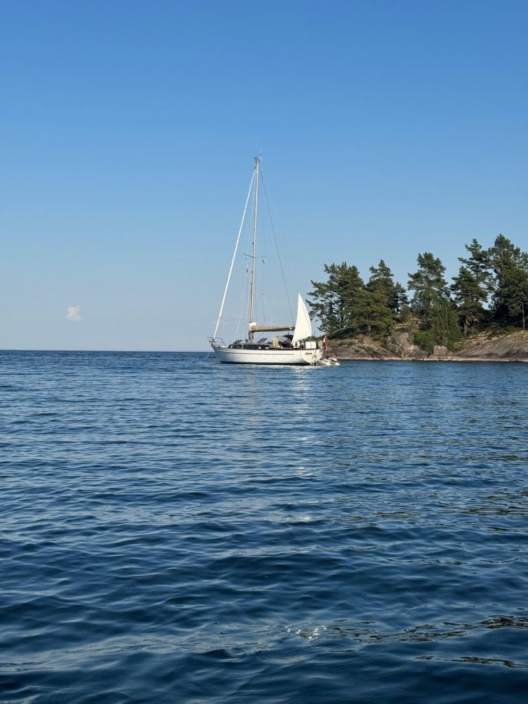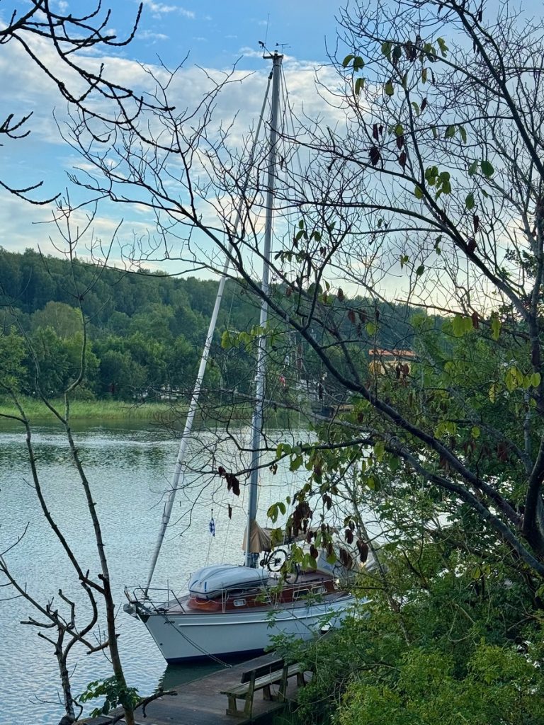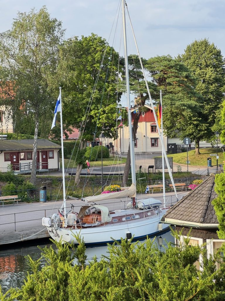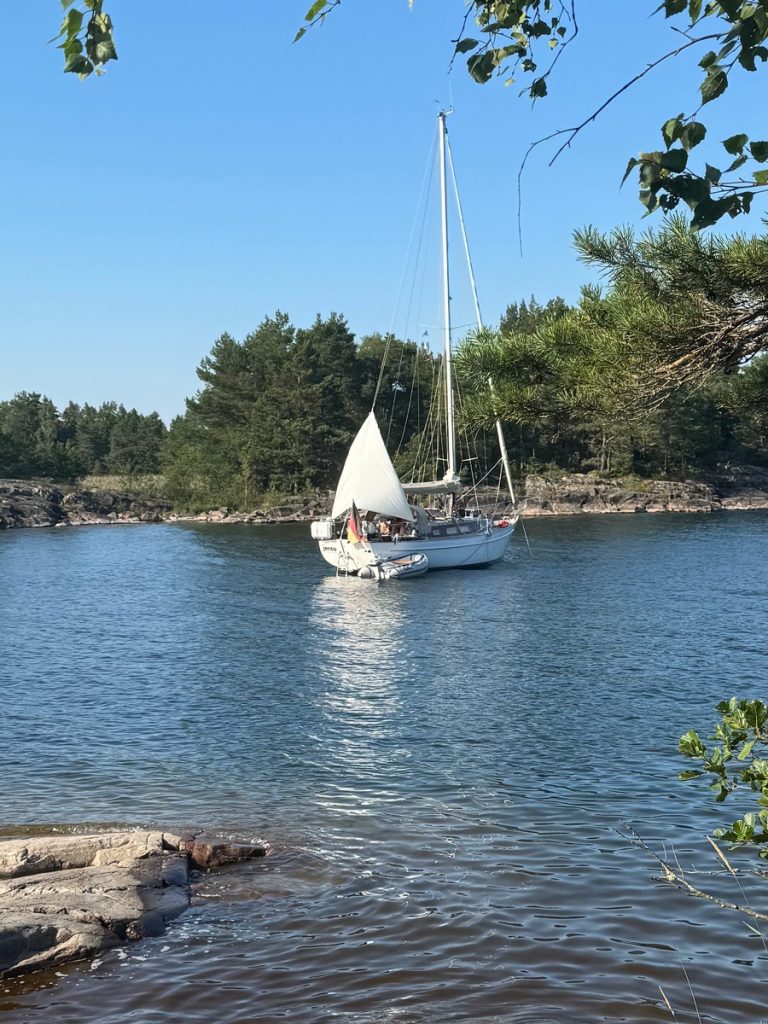 Schon morgens begrüßt uns ein weiterer Hochsommertag und es zieht uns in eine nahegelegene Ankerbucht. Da wir allerdings dort sehr schlechte Internetverbindung befürchten, arbeiten wir vormittags im schattigen Salon am Bericht und laden ihn zur Sicherheit auch schon hoch. Dann laufen wir bei absoluter Flaute unter Maschine in die nur vier Seemeilen entfernte Bucht. Penelope ist uns bereits vorausgefahren und ankert im hinteren Bereich. Wir legen uns in die Buchteinfahrt und hoffen, hier etwas erfrischenden Wind abzubekommen. Die sehr leichte Brise weht in die Bucht, sodass wir auf „Legerwall“, also mit auflandigem Wind ankern – etwas, was man „eigentlich“ als Segler vermeidet. Aber die Windvorhersage für Tag und Nacht ist so schwach, dass wir uns darum keine Sorgen machen – den Ankeralarm setzen wir natürlich trotzdem. Werner pumpt das SUP auf und so kann Barbara erstmals auf dieser Tour eine kleine Fitnessrunde damit absolvieren. Es geht aus der Bucht heraus auf das „große Wasser“ und einmal um die benachbarte Schäre herum. Wir baden mehrfach und genießen die Erfrischung im Süßwasser – mit der richtigen (umweltfreundlichen) Seife ersetzt das sogar die Dusche! Barbara begibt sich für den Dessert zur Blaubeerernte an Land und den Abend verbringen wir leicht bekleidet bei Buch bzw. Hörbuch im Cockpit.