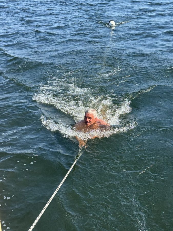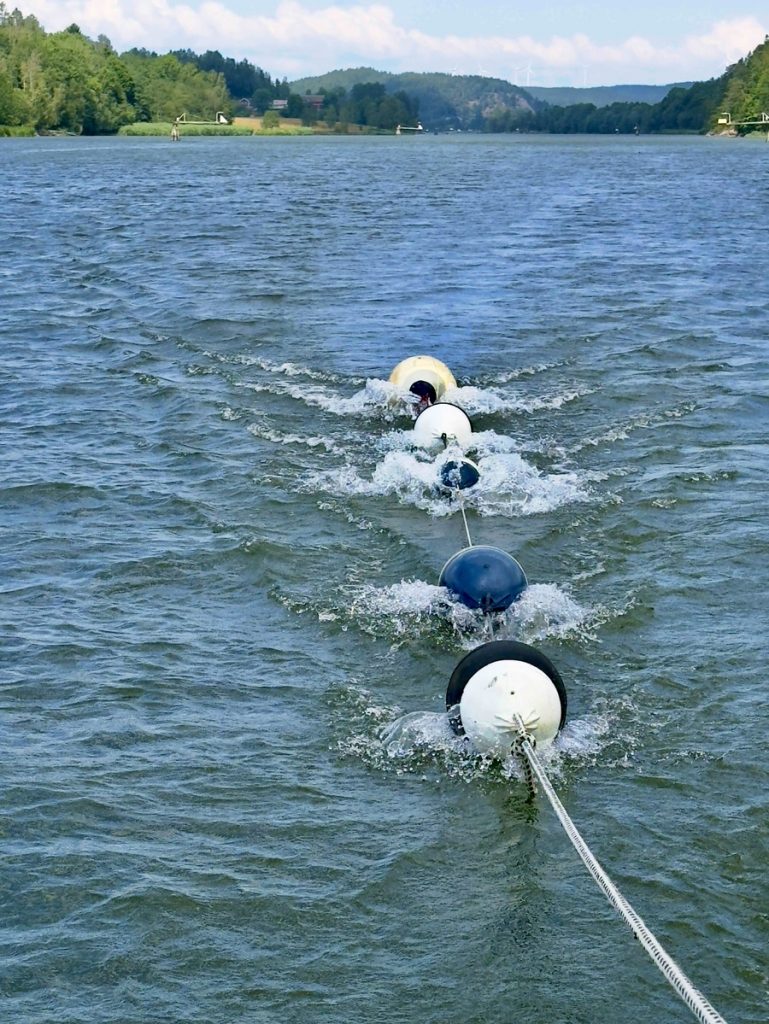 Die Windvorhersage lässt uns eine Motorfahrt nach Vänersborg befürchten, aber als wir die Bucht verlassen, weht doch ein Lüftchen und wir setzen Groß und Blister. Wieder ist es hochsommerlich warm. Jento bewegt sich dank mitsetzenden Stroms mit ca. 3 Knoten in Richtung Süden. Wir nutzen die Gelegenheit und binden einen Fender als Auftriebskörper an einen unserer langen Heckfestmacher. Dann lassen wir ihn zu Wasser und Werner springt direkt hinterher. Nach dem Auftauchen heißt es nach der Leine greifen und sich vom Boot ziehen lassen – herrlich! Natürlich bleibt immer einer von uns an Bord! Kaum sitzt man nach dem erfrischenden Bad eine halbe Stunde im Cockpit, gelüstet es einen schon nach dem nächsten Sprung ins Wasser. So vertrödeln und genießen wir unseren letzten Tag auf dem Vänern.