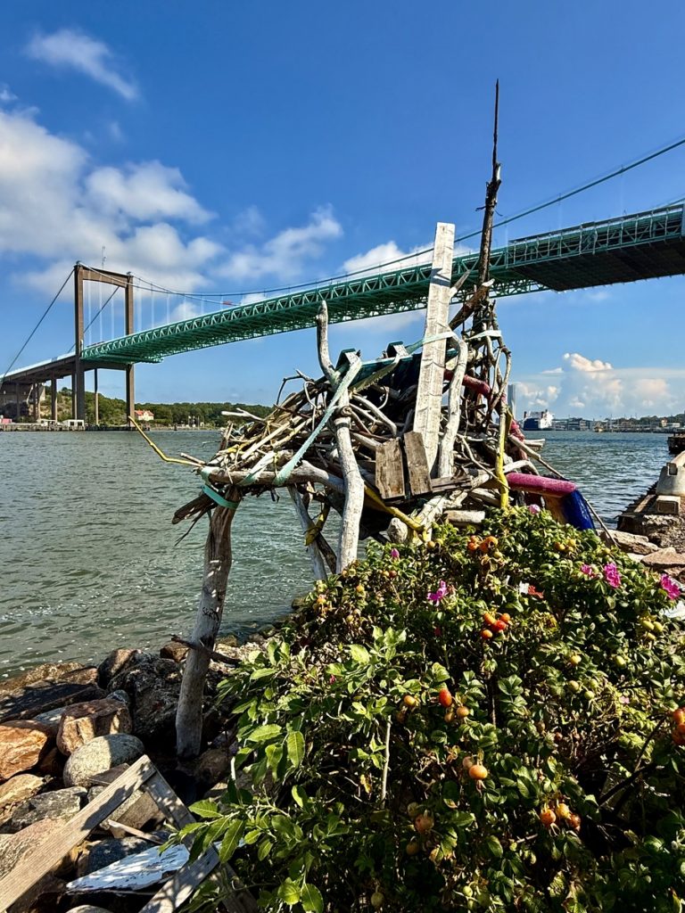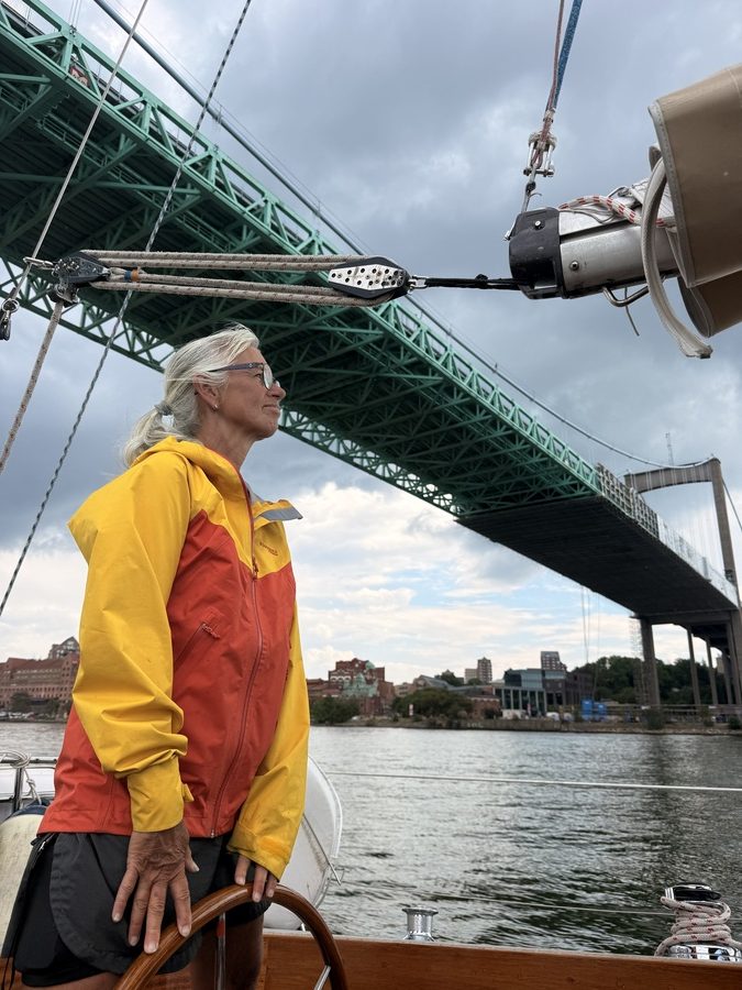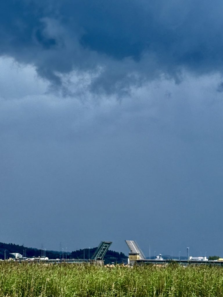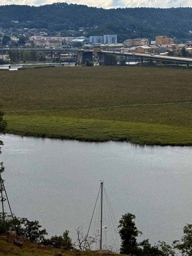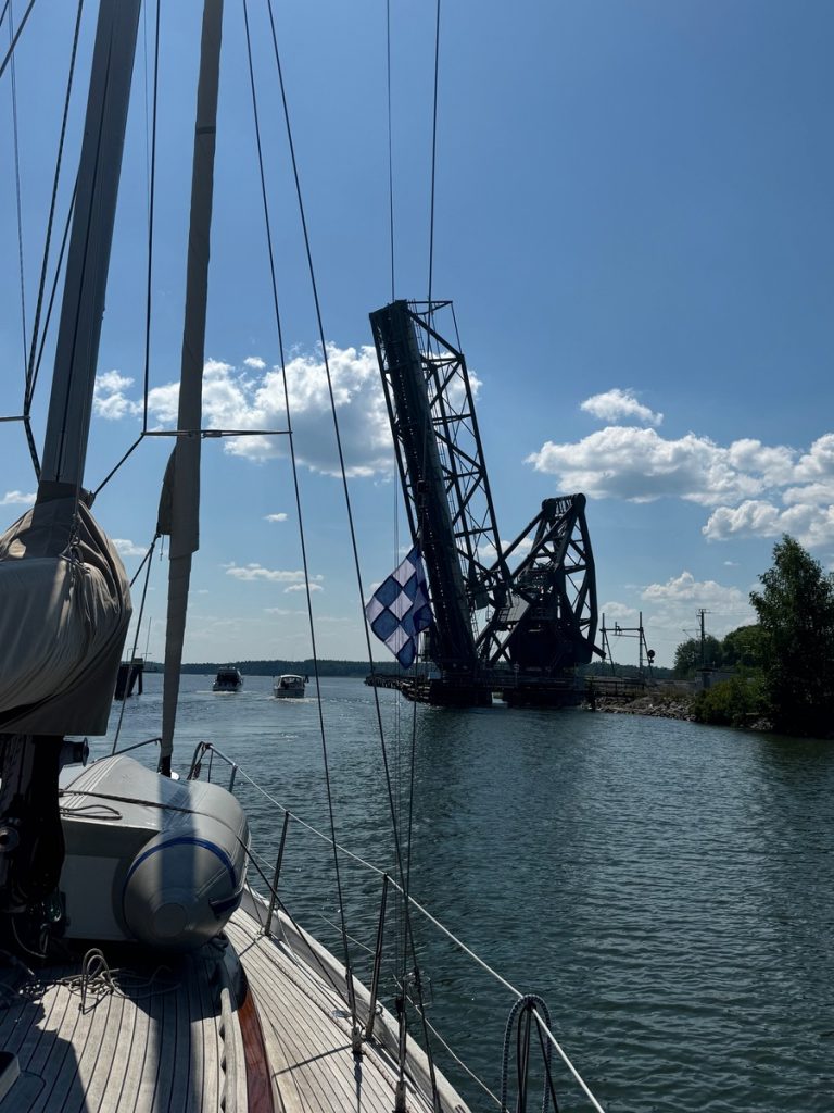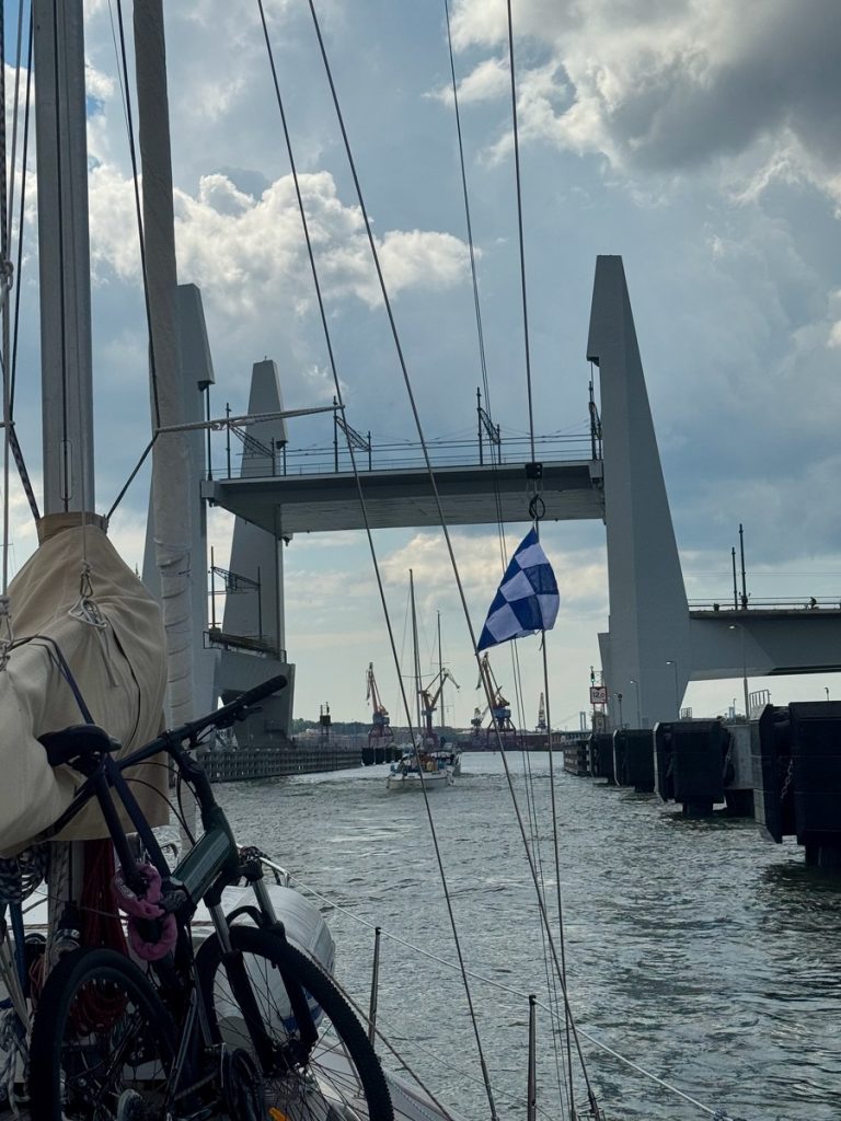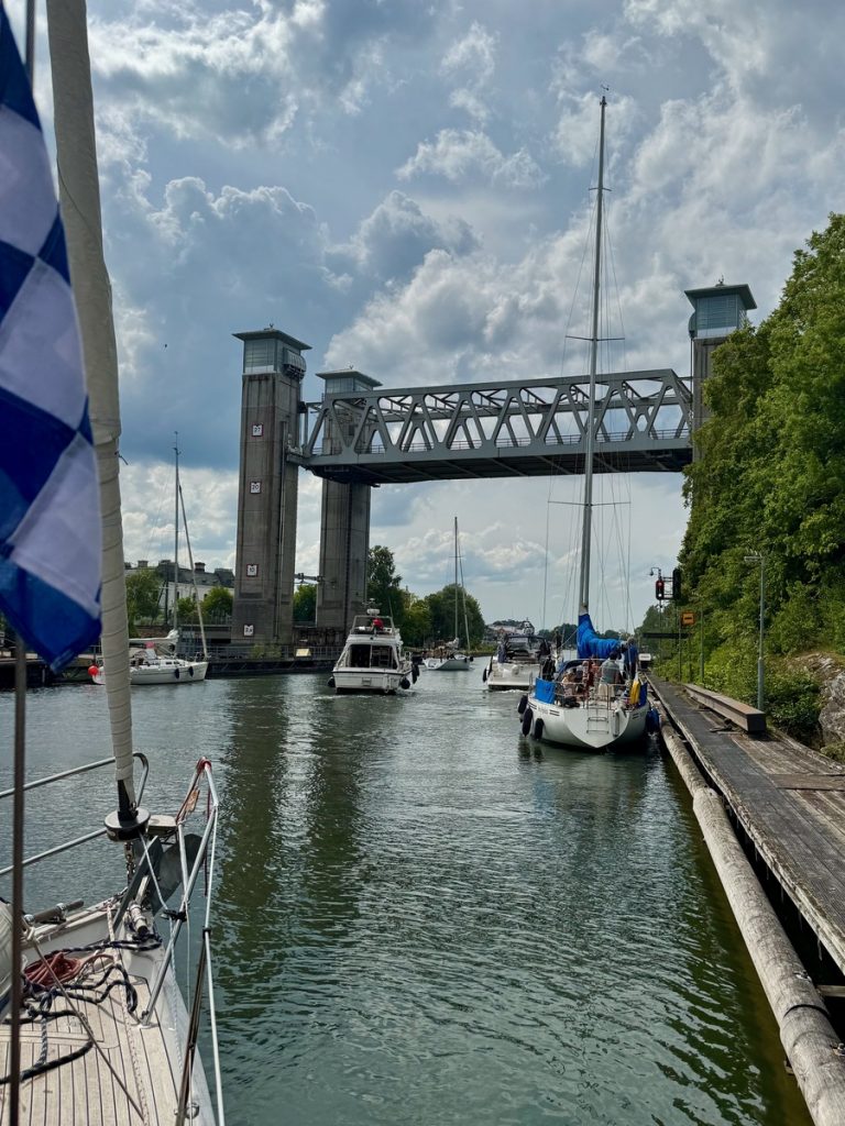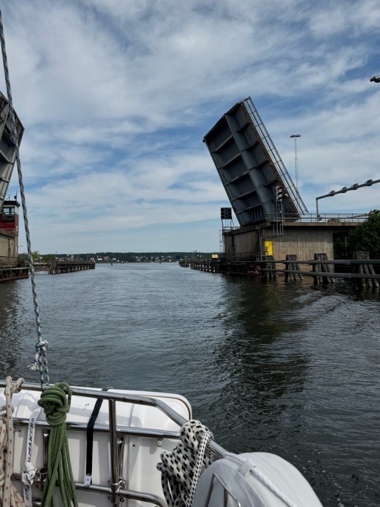 Nachdem wir uns ausgiebig Zeit für die Besichtigung von Burg und Ausstellungen mittels Audioguide genommen und den Ausblick genossen haben, kehren wir zurück zu Jento und legen ab. Bis nach Göteborg sind es nur noch 10 Seemeilen, allerdings liegen drei Brücken auf dem Weg, die öffnen müssen. Die erste können wir von unserer Anlegestelle aus sehen und sie öffnet just in dem Moment, als wir ablegen. Schade, das bedeutet nun sicher etwas Wartezeit. Wir versuchen an Steuerbord vor der Brücke an der hohen und nur mit wenigen Pollern bestückten Wartepier festzumachen, aber mit Wind und Strömung von hinten klappt das nicht. Jento vertreibt. So drehen wir einmal um und legen gegen Wind und Strömung an. Das ist deutlich einfacher. Werner kann Jento aufstoppen und Barbara wagt den Sprung auf das hohe Bollwerk – Spaß macht das nicht! Wir versuchen per Funk herauszubekommen, wann die Brücke öffnen wird, aber es wird nur auf schwedisch geantwortet. Wir verstehen nur so viel, dass zwei weitere Segelboote im Anmarsch sind. Die Wartezeit nutzen wir für das Frühstück und können schon bald zwei Masten ausmachen, die sich der Brücke nähern. Aber auch jetzt regt sich nichts an der Anzeige. Letztlich braucht es noch einen Segler von der anderen Seite, dann öffnet die Brücke. Nun geht es flussabwärts weiter Richtung Göteborg. Der Fluß wird von Schnellstraßen und Bahnlinien flankiert, immer mehr Gewerbe taucht am Flussufer auf.