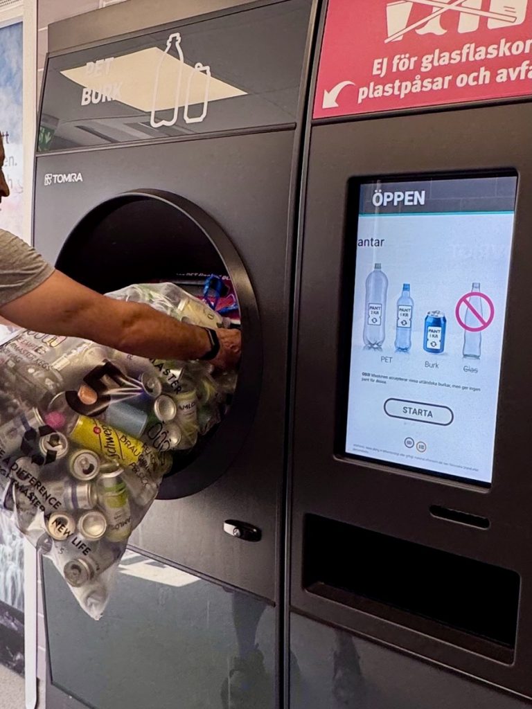In Vänersborg legen wir uns außen an die Gästebrücke, um zumindest etwas Wind zur Erfrischung zu erhaschen – der restliche Hafen liegt im Windschatten mehrstöckiger Häuser. Das Sonnensegel wird aufgezogen, die Fahrräder auf die Brücke gehoben und aufgebaut – unser Kühlschrank ist nahezu leer. Die „Vorratsmilch“ ist aufgebraucht und auch an frischem Gemüse, Fleisch und Nudeln fehlt es: ein Großeinkauf bei Lidl steht an. Doch zuvor fahren wir zum ICA und geben unsere schwedischen Pfandflaschen und -dosen zurück. Der dortige Pfandautomat versetzt uns ins Staunen: Das Leergut wird wie in eine Mülltonne entleert und der Automat sortiert und errechnet den Pfandgutschein – genial! Der Supermarkt ist klimatisiert und wir genießen es, einmal heruntergekühlt zu werden. Wir kaufen die Restbestände an großen Selterflaschen auf und bringen diese schon mal an Bord.