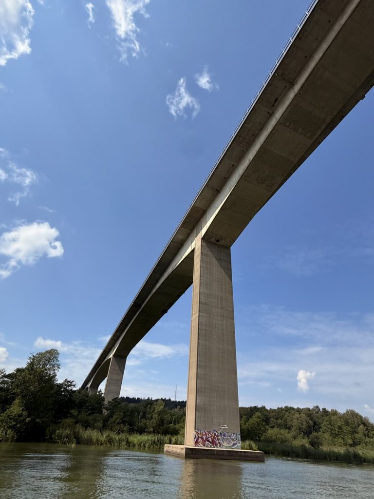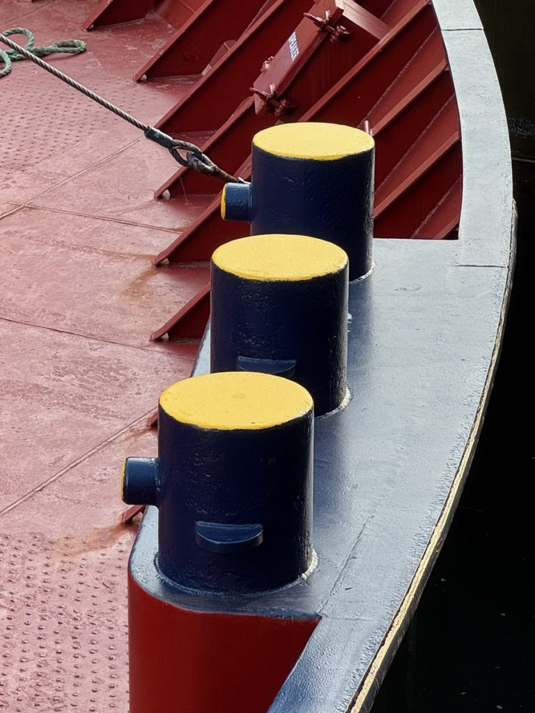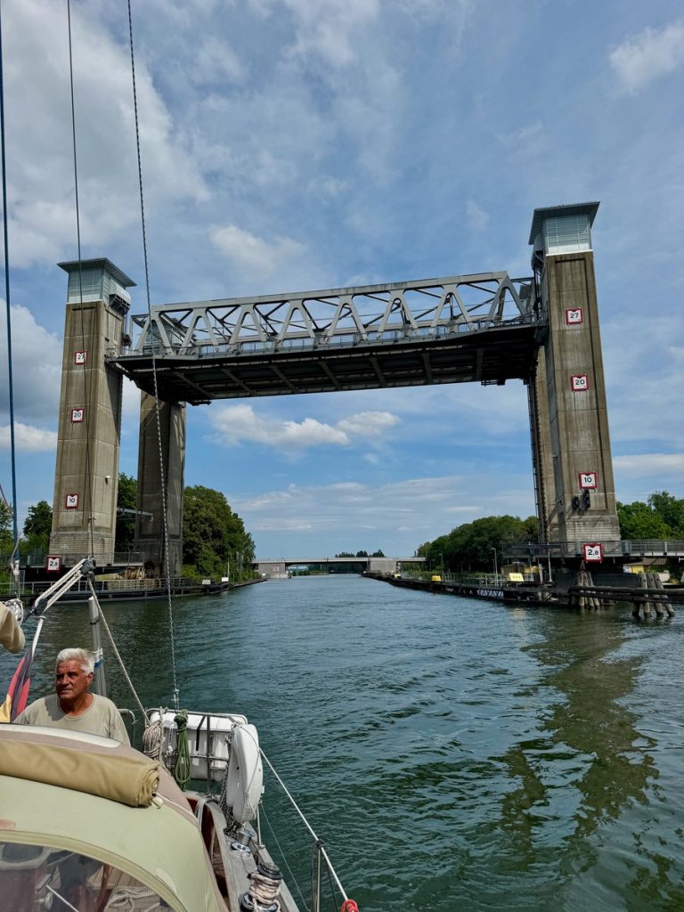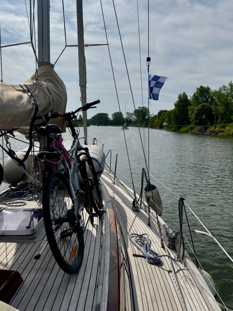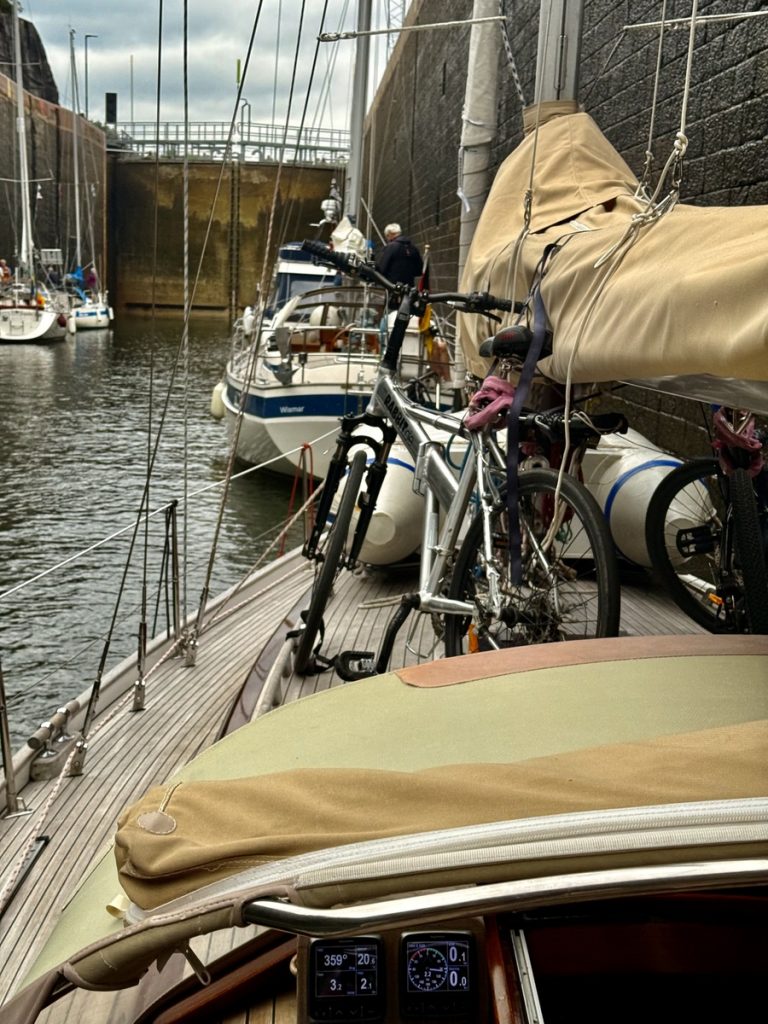 Nach dem Morgenkaffee verstauen wir die Räder an Deck – Jento sieht langsam aus wie ein Lastenkahn. Seit der letzten Ankerbucht fahren wir das Dinghi auf dem Vordeck und nun schnallen wir die Räder an den Großbaum. Wenn das Barbaras Vater „Klaus“ sehen würde! Bevor es zur ersten Brücke geht, ist noch ein Stopp an der Servicebrücke angesagt – Schmutzwasser abpumpen!