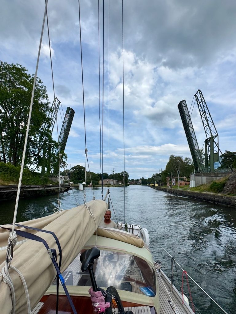 Nach der Schleuse müssen die 4 Segler vor der nächsten Brücke warten, während die Motorboote schon mal die Fahrt fortsetzen können – sie passen alle auch unter der geschlossenen Brücke hindurch.