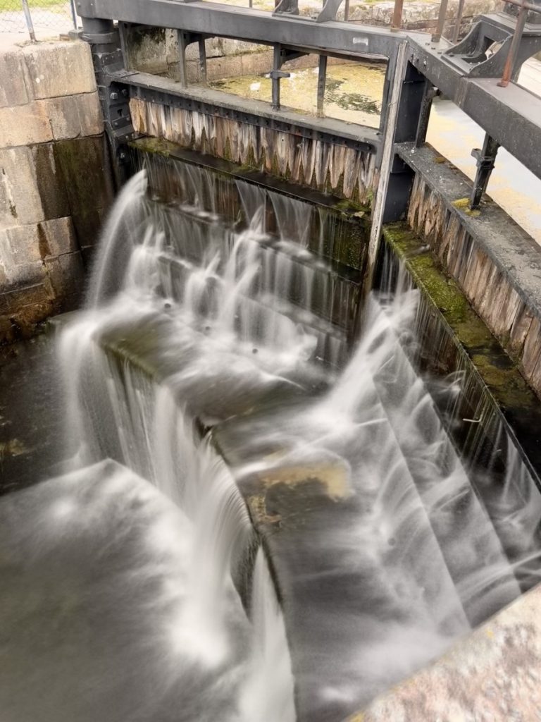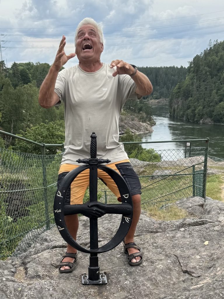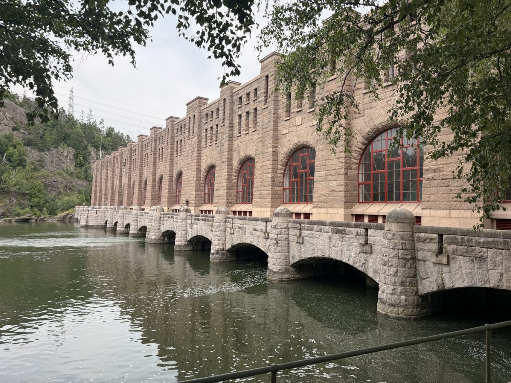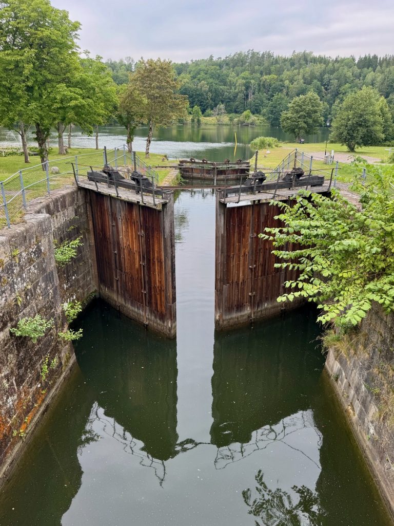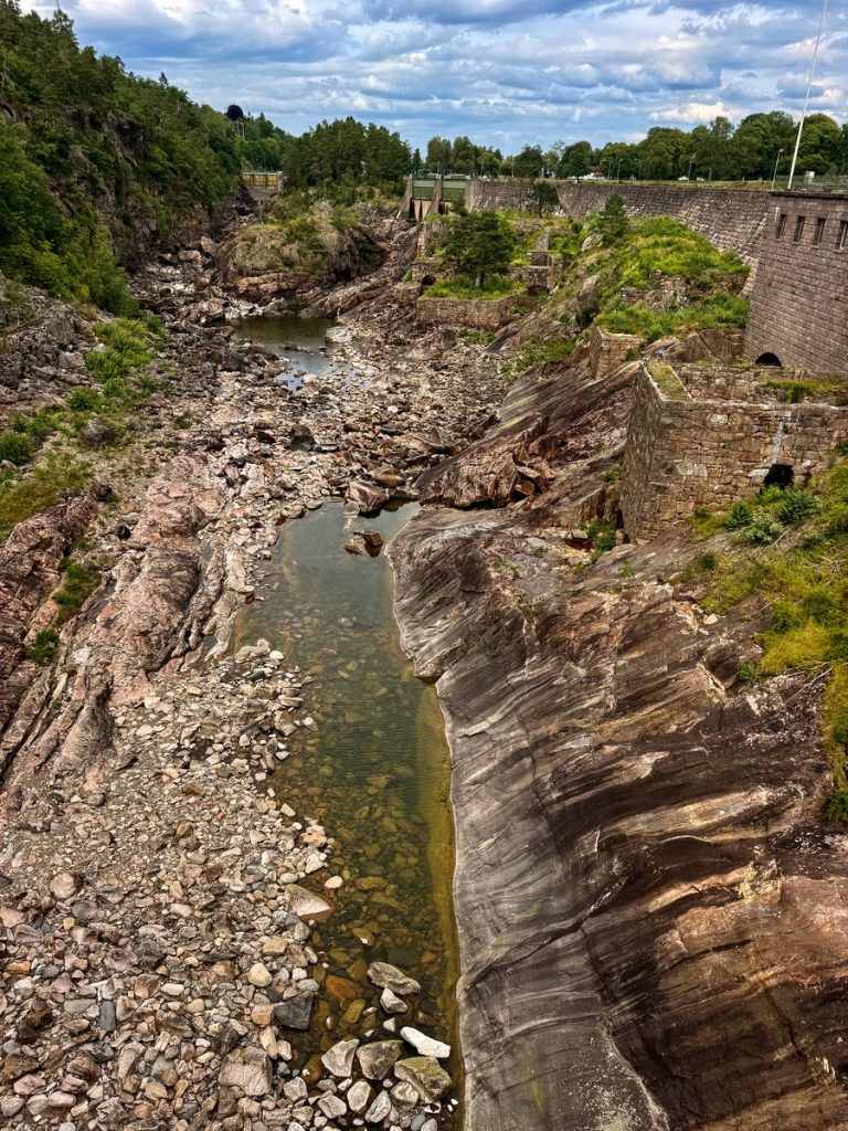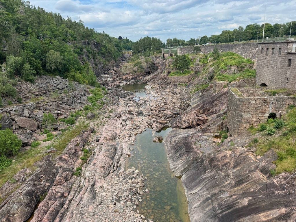 Mit einem Eis in der Hand machen wir uns auf zu einem Spaziergang zur „Oskarsbroen“. Wir haben gelesen, dass man von dort den besten Blick auf die Trollhättan Wasserfälle haben soll, wenn sie täglich um 15:00 Uhr geöffnet werden. Als wir dort ankommen, stehen bereits einige Menschen erwartungsvoll auf der Brücke. Es ist kurz vor drei, als die Nachricht die Runde macht, dass die Fälle heute nicht geöffnet werden. Werner recherchiert und findet auf der Seite von Vattenfall den Hinweis, dass in diesem Jahr keine weiteren Öffnungen vorgesehen sind. Die letzten Öffnungen erfolgten im Rahmen der „Wasserfalltage“ am letzten Wochenende, also gestern… So schade! Hätten wir das gewusst, wären wir einen Tag früher hergekommen! So nutzen wir den Nachmittag für einen Spaziergang entlang der Wasserkraftwerke am Ufer des Götaälv und zu den verschiedenen Schleusentreppen von Trollhättan.