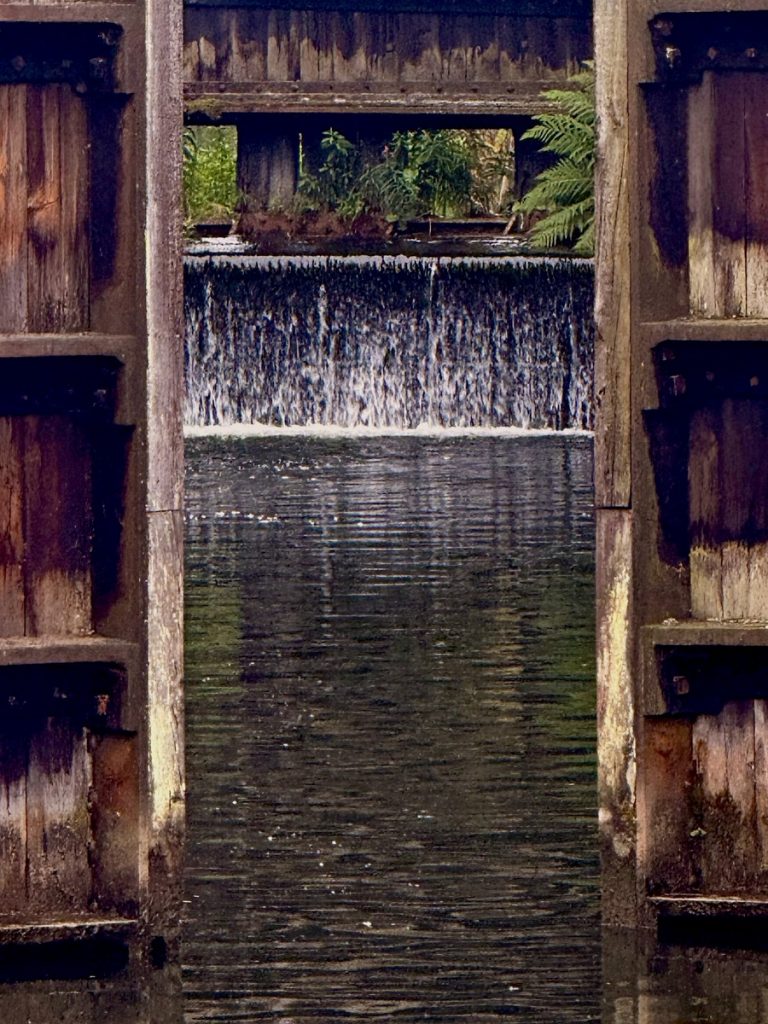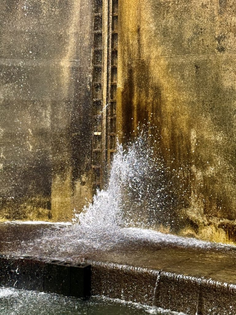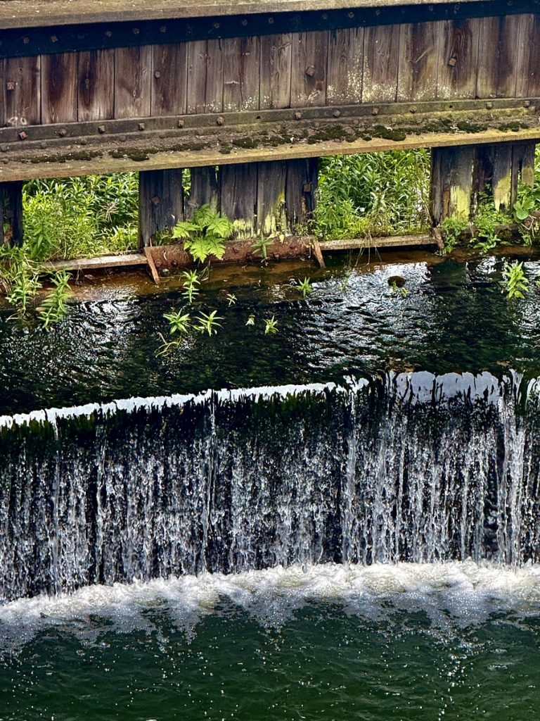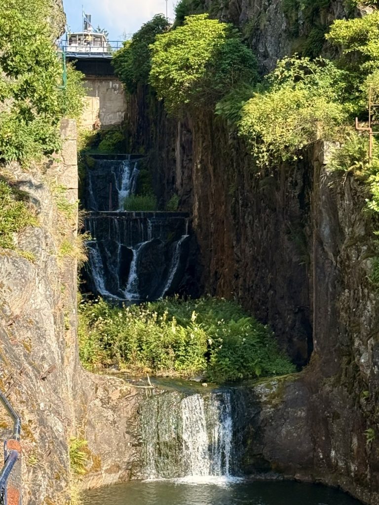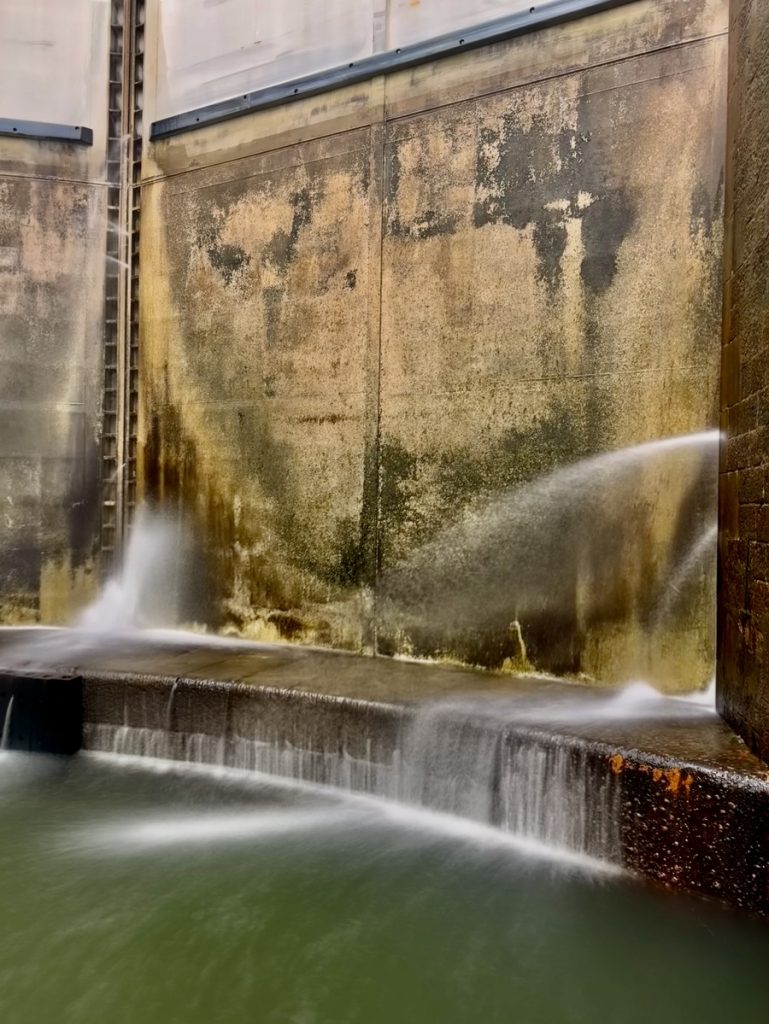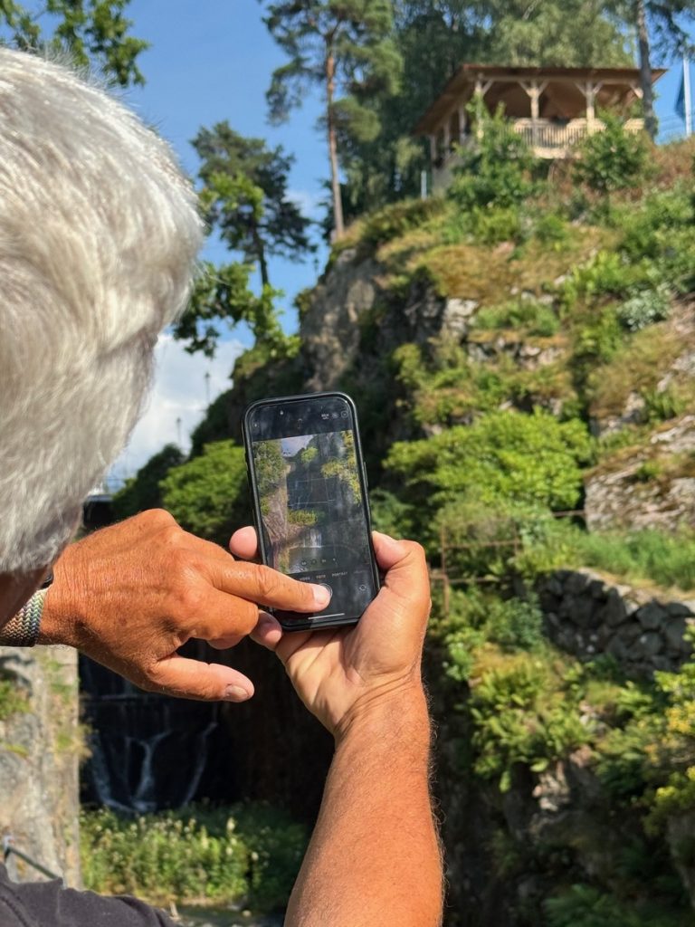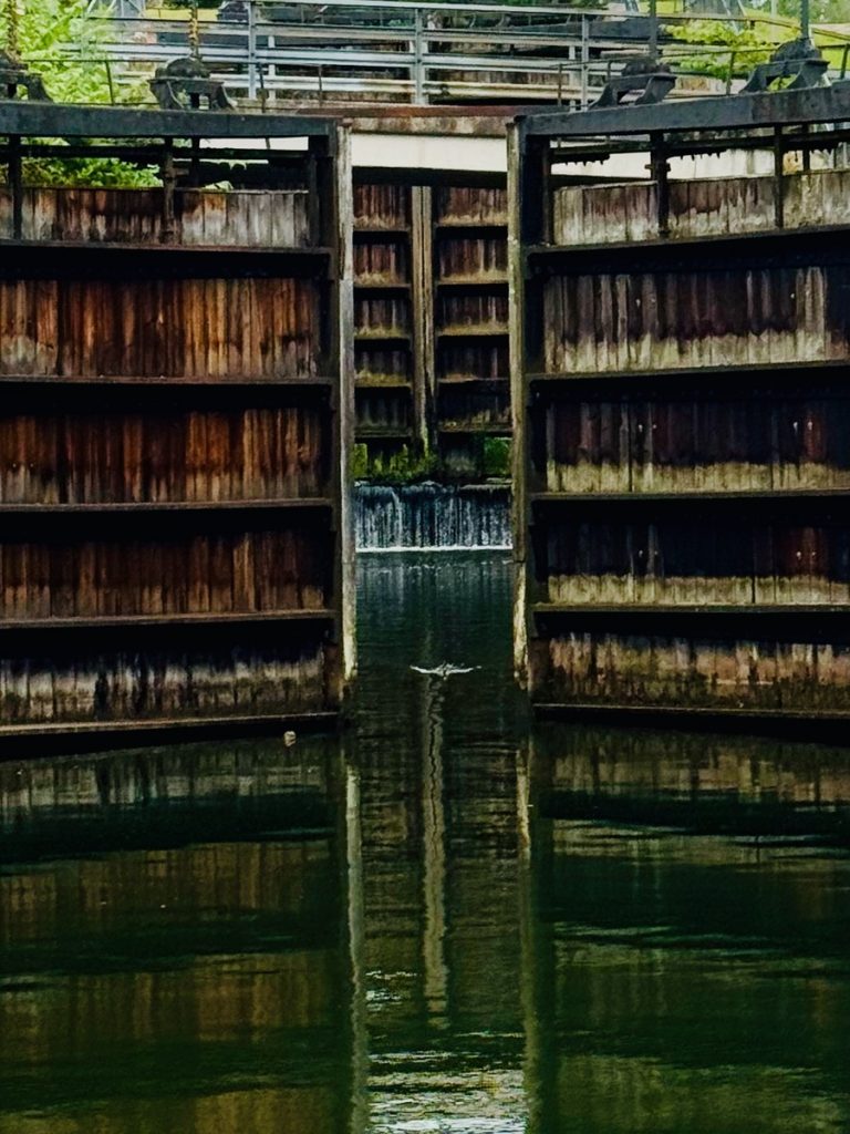 Mit einem Eis in der Hand machen wir uns auf zu einem Spaziergang zur „Oskarsbroen“. Wir haben gelesen, dass man von dort den besten Blick auf die Trollhättan Wasserfälle haben soll, wenn sie täglich um 15:00 Uhr geöffnet werden. Als wir dort ankommen, stehen bereits einige Menschen erwartungsvoll auf der Brücke. Es ist kurz vor drei, als die Nachricht die Runde macht, dass die Fälle heute nicht geöffnet werden. Werner recherchiert und findet auf der Seite von Vattenfall den Hinweis, dass in diesem Jahr keine weiteren Öffnungen vorgesehen sind. Die letzten Öffnungen erfolgten im Rahmen der „Wasserfalltage“ am letzten Wochenende, also gestern… So schade! Hätten wir das gewusst, wären wir einen Tag früher hergekommen! So nutzen wir den Nachmittag für einen Spaziergang entlang der Wasserkraftwerke am Ufer des Götaälv und zu den verschiedenen Schleusentreppen von Trollhättan.