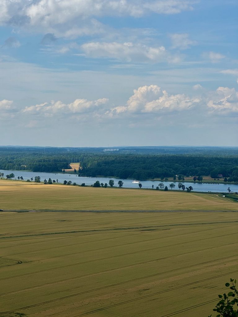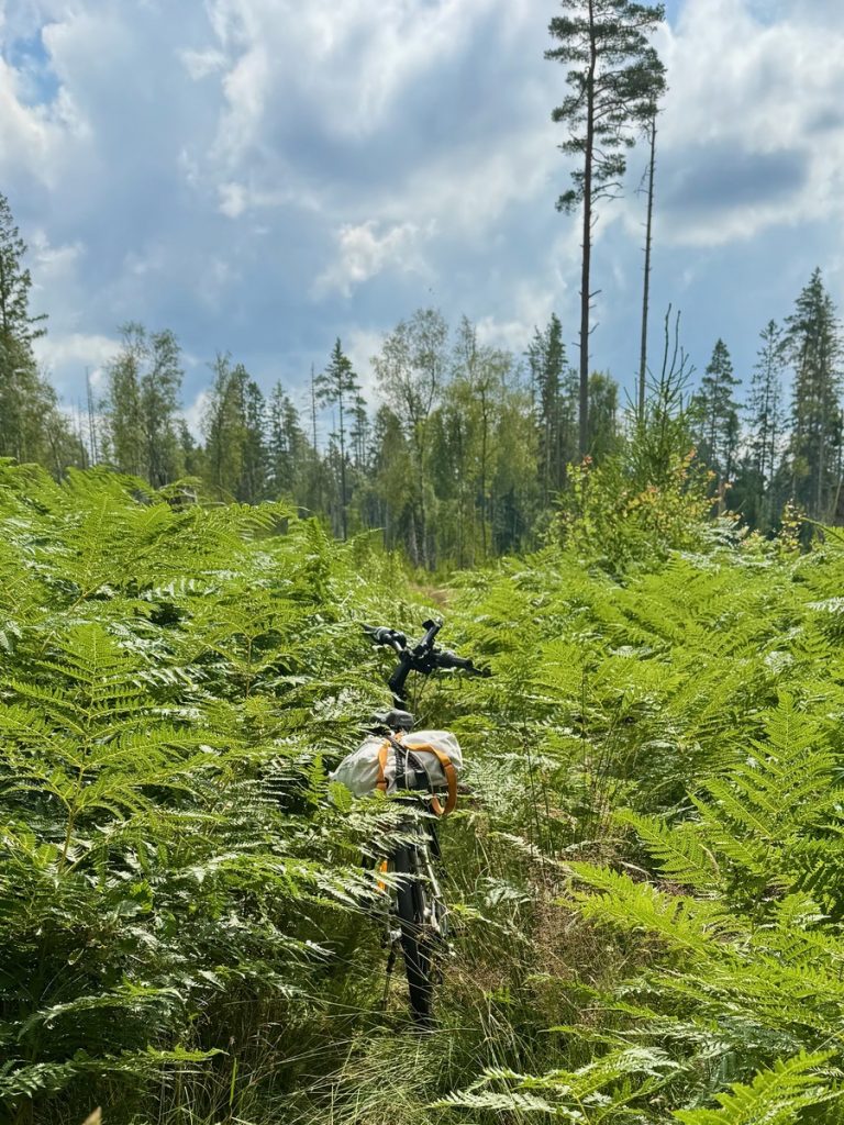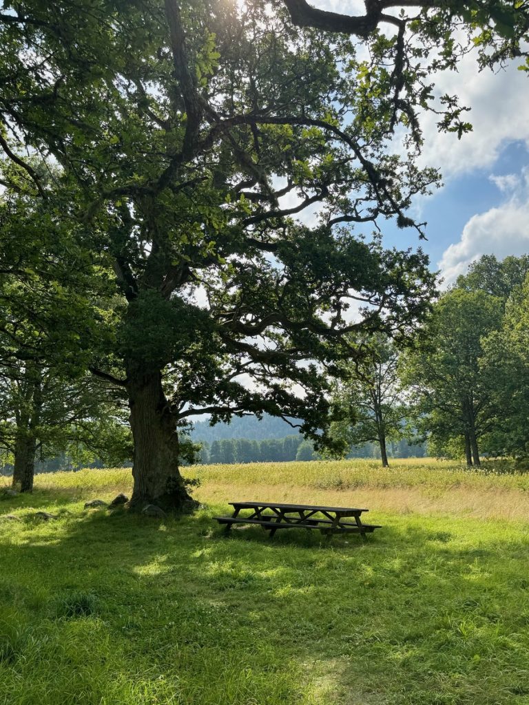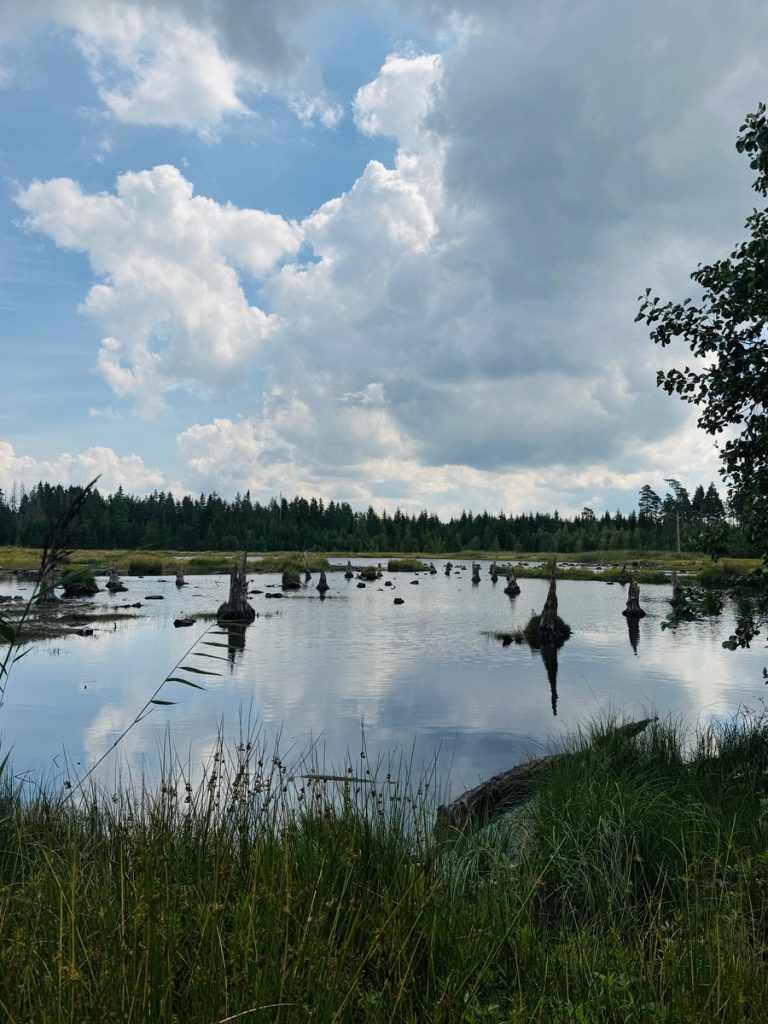 Auf ihre Frage, wie die Oberflächenbeschaffenheit der Fahrradwege sei, bekommt Barbara die Information, dass sie überwiegend gut mit einem Tourenrad zu befahren sind. Von einer Benutzung mit dem Rennrad wird abgeraten. Am besten sei die Straße, die auch für den Autoverkehr freigegeben ist. Das erste Ziel ist eine Waldlichtung mit der ältesten Eiche des Gebietes. Dahin führt die „Autostraße“. Anfangs asphaltiert, dann als Schotterpiste. Beim Blick in die Landschaft ist Barbara kurz unaufmerksam, der Vorderreifen gerät im losen Schotter am Fahrbahnrand ins Rutschen und Barbara findet sich der Länge nach auf der Straße wieder. Der Schreck ist groß: ein paar Prellungen, Schürfwunden und in die Höhe schießendes Adrenalin. Zum Glück kommt just in diesem Moment eine nette Schwedin im Auto vorbei, hält an und unterstützt bei der ersten Wundversorgung mit ihrer Wasserflasche. Bei der Reinigung einer kleinen Gesichtswunde, legt Barbara sich kurz schlafen, was dazu führt, dass die nette Schwedin sie nicht allein lassen möchte. Gemeinsam werden ein paar Momente im Schatten eines Baumes verbracht und ein freundliches Gespräch geführt an dessen Ende Barbara mit dem Auto zu ihrem ersten Ziel gefahren wird. Dort angekommen, stärkt sie sich mit Wasser Brot und „Baumenergie“, um dann den Rückweg zum Fahrrad zu Fuß anzutreten. Die Bewegung tut gut und so beschließt sie, die geplante Runde wieder aufzunehmen. Der weitere Weg führt durch Feuchtgebiete und moosige Wälder, vorbei an in der Sonne tanzenden Schmetterlingen, einem neu angelegten See mit skurrilen Baumskeletten und zu einem Aussichtspunkt über die Ebene. Leider versagt irgendwann der Akku von Handy und Powerbank, sodass der Rückweg auf bekannter Strecke erfolgen muss.