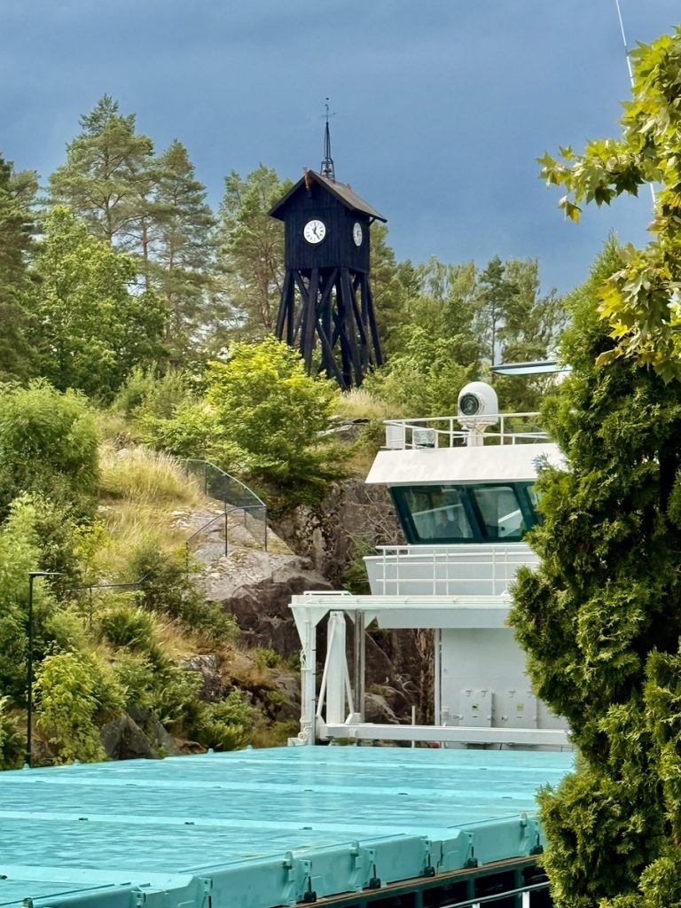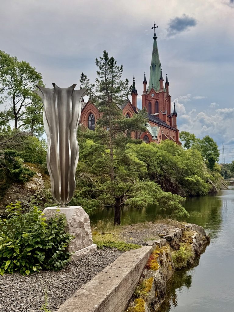 Auf dem Rückweg machen wir dann noch einen Abstecher zum zentralen Gasthafen, in dem die Penelope liegt – von der Crew ist aber leider weit und breit nichts zu sehen. Dann erklimmen wir radelnd und schiebend die nächste städtischen Anhöhe mit der sehr fotogenen Oscar Fredriks Kyrka, die leider geschlossen ist. Die nachträgliche Googlerecherche zweigt nämlich, dass sowohl die Rosettenfenster als auch die Inneneinrichtung wunderschön sind.