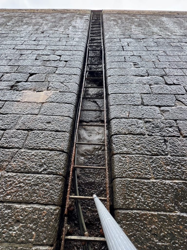 Vor der ersten Brücke wartet bereits ein Segler. Wir machen uns ebenfalls an der hohen Wartebrücke fest. Als sich insgesamt vier Boote eingefunden haben, wird die Brückenöffnung angezeigt. Bis zur einzigen Schleuse heute sind es ca. zwei Seemeilen. Dort müssen wir etwas warten, bis aufwärts schleusende Boote ausfahren. Die linke Seite der Schleuse ist gemauert, während auf der rechten Seite sich schmale Mauerstücke mit großen Flächen von Naturfels abwechseln. Aus diesem Grunde war uns empfohlen worden, an der linken Seite festzumachen. Wir haben sehr lange Leinen vorbereitet, die wir über den oberen, in die Mauer eingelassenen Poller legen. Unter Wasser senkrecht darunter befinden sich weitere Poller, auf die man mit der Leine wechseln kann, wenn der Wasserspiegel sinkt. Das ersparen wir uns durch unsere langen Leinen. Es funktioniert bestens. Man muss nur beim Durchholen der Leinen am Ende des Schleusungsvorgangs vorsichtig sein und nicht zu heftig ziehen, damit sich das Leinenende nicht irgendwo verknotet.