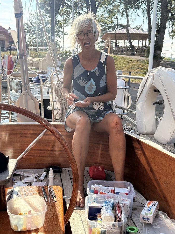 Zurück am Boot wird Barbara direkt mit Eis belohnt – hilft bei schlechter Laune genauso, wie bei kleinen Wehwehchen! Dann geht es Baden – die Wunden sind voll mit grauem Staub und müssen erstmal eingeweicht werden. Im Anschluss Desinfektion, Betaisadona Salbe und notdürftige „Verpflasterung“ für die Nacht. Erst als Barbara in Werners Gesellschaft zur Ruhe kommt, merkt sie, wie sehr der Sturz sie mitgenommen hat…
