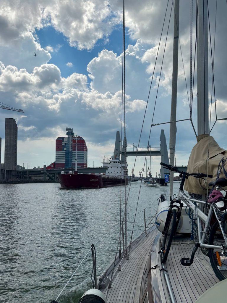 Auch vor der nächsten Brücke, einer Eisenbahnbrücke müssen wir kurz warten – natürlich hat hier der Bahnverkehr Vorfahrt. Dann fehlt nur noch die letzte Brücke kurz vor der Göteborger City. Diese soll eigentlich erst um 14:35 Uhr aufmachen – wir sind eine halbe Stunde zu früh. Aber da gerade ein Frachtschiff die Brücke passieren will, dürfen auch wir Yachtis durch – Glück gehabt! Direkt hinter der Brücke befindet sich der zentrale Gästehafen „Lilla Brommens Hamn“. Wir drehen einige unentschlossene Runden im Hafenbecken. Ein Hafenmitarbeiter ruft uns zu, welche Plätze nicht reserviert sind, wir fragen nach dem Preis und entscheiden uns weiterzufahren. Es ist uns einfach zu laut und unruhig hier. Nach all den beschaulichen kleinen Häfen, Ankerbuchten und Naturhäfen, überfordert uns Göteborg gerade. Wir fahren weiter bis nach Långedrag, dem etwas außerhalb gelegenen zweiten Göteborger Gästehafen. Hier finden wir Ruhe, alle gewünschten Serviceeinrichtungen und können mit Fahrrad, Straßenbahn oder Fähre ins Zentrum fahren, wenn uns danach ist. Wir wollen die Stadt ja schon erkunden und aufgrund der Wettervorhersage, könnte der Aufenthalt hier sogar etwas länger ausfallen, denn ab übermorgen ist Starkwind aus West-Süd-West vorhergesagt.