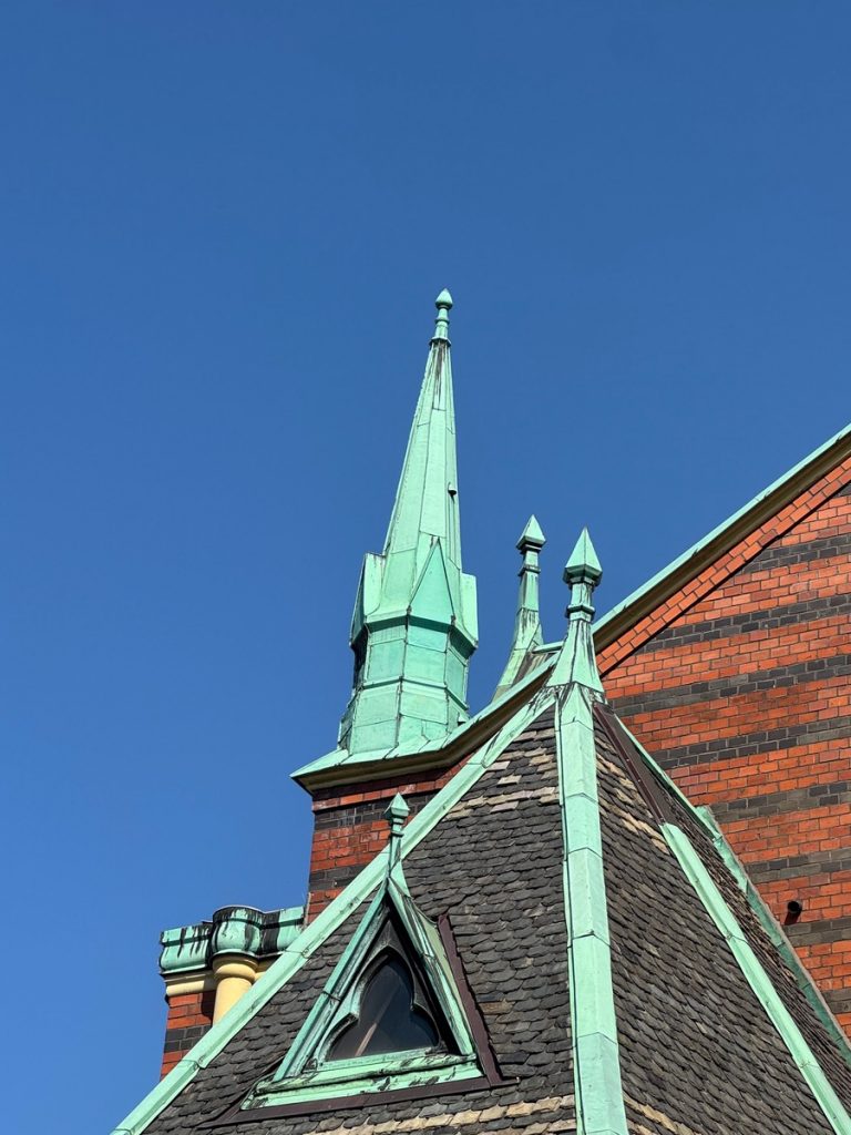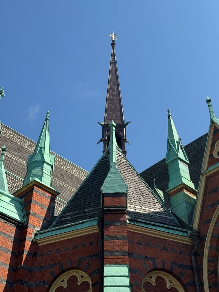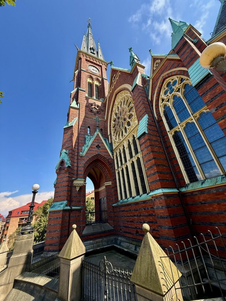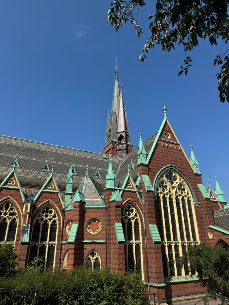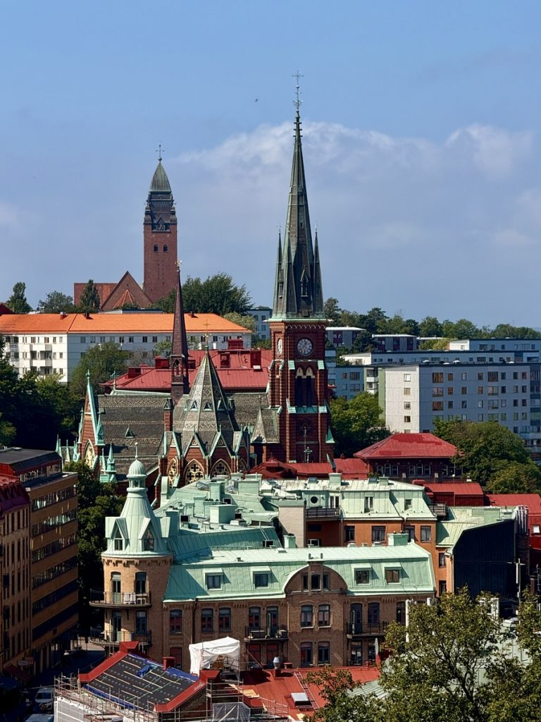 Der Weg führt uns weiter bergan bis ganz hinauf auf den Stigberget, wo die Masthuggkyrkan steht. Die Anstrengung wird mit einem erneuten tollen Ausblick über die Stadt belohnt.