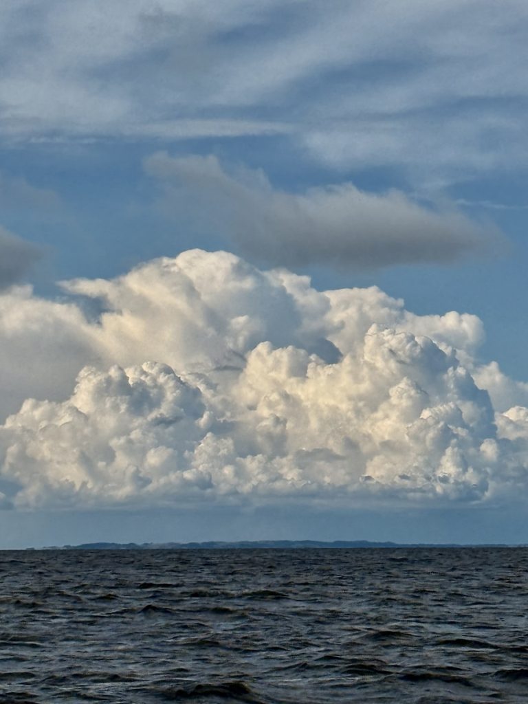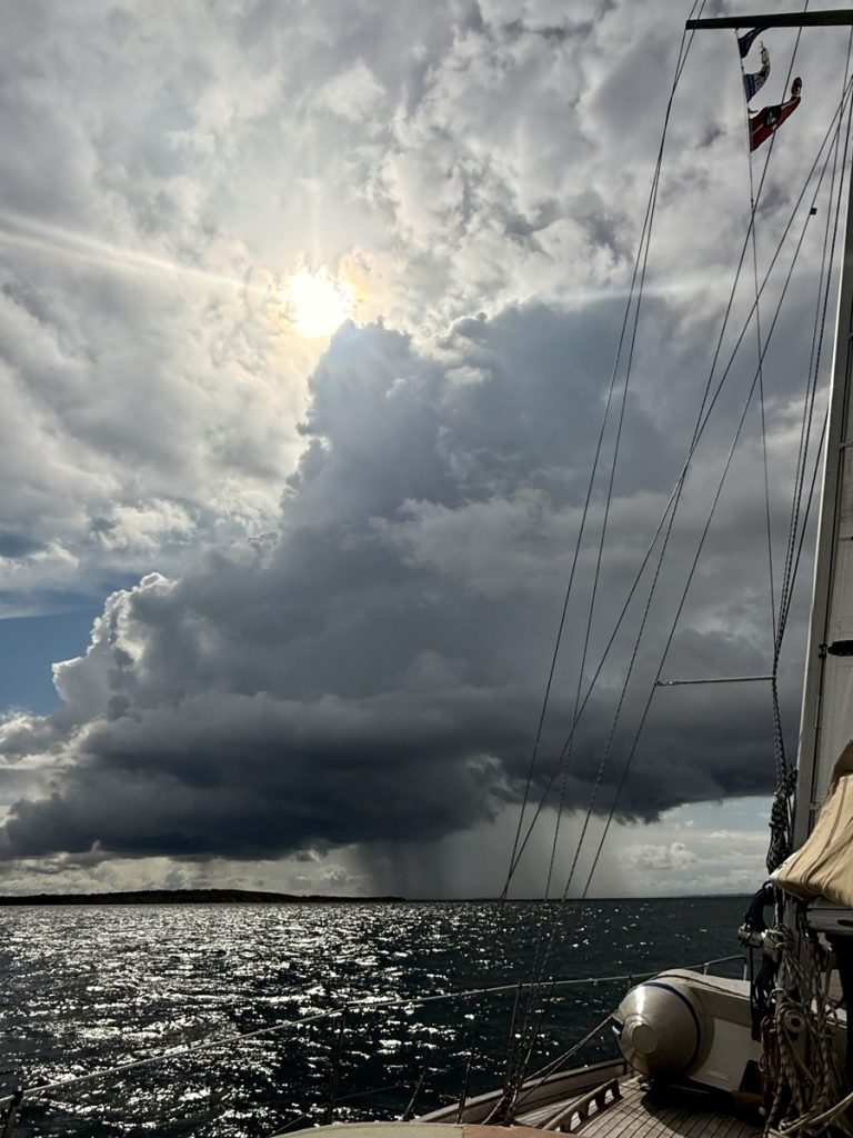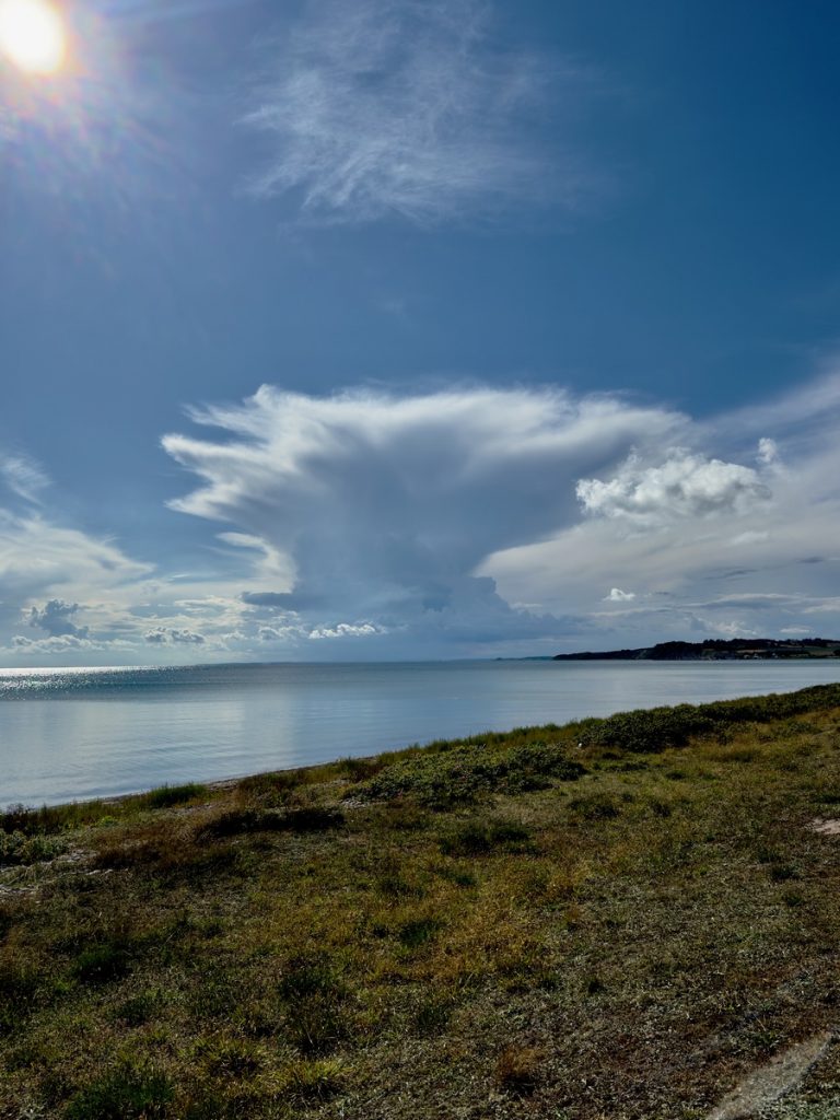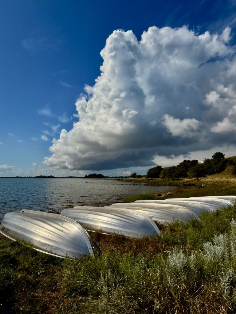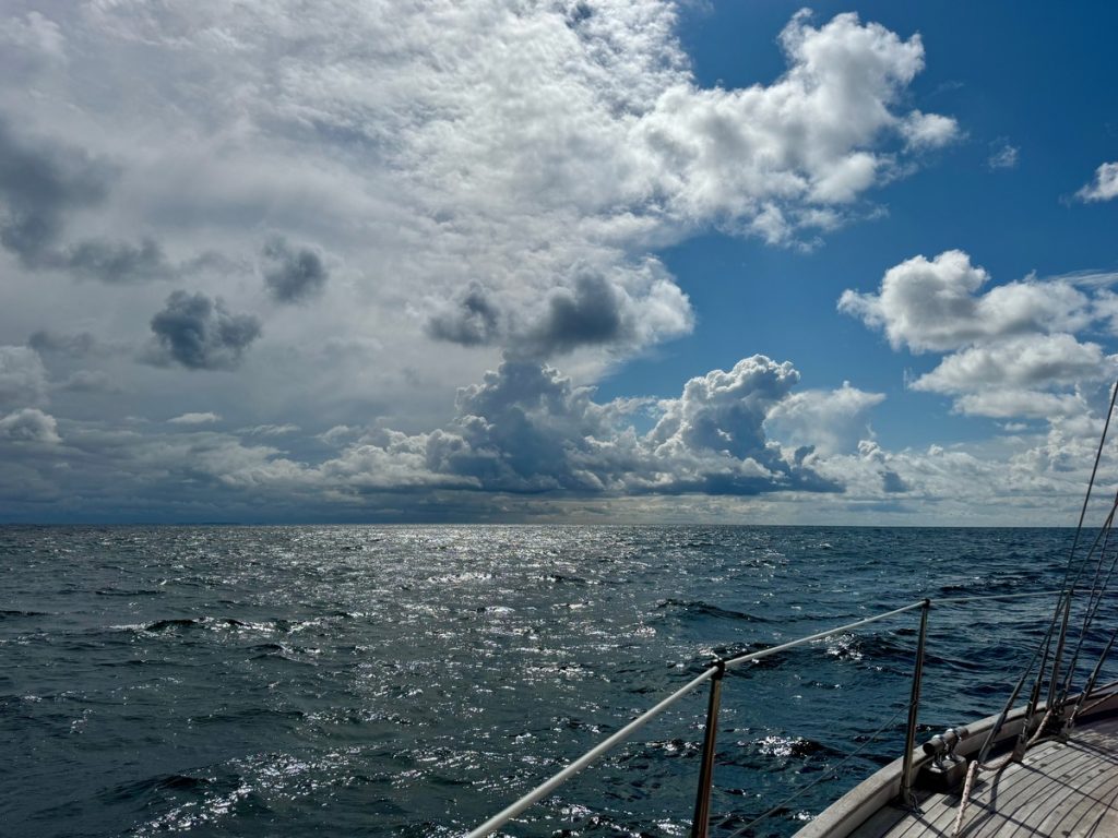Gestern dachten wir beim Blick auf die Windvorhersage, dass wir den heutigen Tag im Hafen verbringen. Nun sieht es nach dem Aufstehen ganz anders aus. Statt der vorhergesagten 20 Knoten Wind aus südlichen Richtungen, wehen nur 12 Knoten. Auch der Blick in die Wetterapp zeigt ein deutlich entspannteres Bild. Wir beschließen, die Gelegenheit zu nutzen und machen uns und das Boot seeklar. Kurz noch bei der Tankstelle vorbei und volltanken, dann geht es los. Auf einem entspannten Halbwindkurs mit wenig Welle aufgrund der Landabdeckung geht es Richtung Westen. Auch viele andere Segler nutzen das Wetterfenster – es strömt in beide Richtungen. An Seelandsodde zieht sich ein Flach weit in Richtung Nordwesten, aber es gibt einen betonten Durchgang. Den steuern wir an. Nach Norden sieht der Himmel ansprechend aus: blau mit weißen Schäfchenwolken. Im Süden steht eine graue Wand. Ein großes Regengebiet dreht sich in der Ferne – Flensburg hat es voll erwischt! Wir haben Glück und entgehen dieser Front und segeln fast durchgängig bei Sonnenschein. Gegen Mittag erreichen wir den Durchgang an Seelandsodde. Danach müssen wir anluven (höher an den Wind) und bekommen nun auch die Welle zu spüren, die im Großen Belt genug Platz hatte sich aufzubauen. Das bremst uns etwas aus, aber Jento läuft trotzdem meist mit 6 Knoten. Wir passieren das Fahrwasser der Berufsschifffahrt und ein großes Kreuzfahrtschiff zieht an uns vorbei. Auch die Route der Schnellfähren von Seeland nach Aarhus kreuzen wir und haben Glück, dass gerade keine Fähren in der Nähe sind. Der Himmel ist heute beeindrucken – immer wieder entdecken wir Figuren in den Wolken.