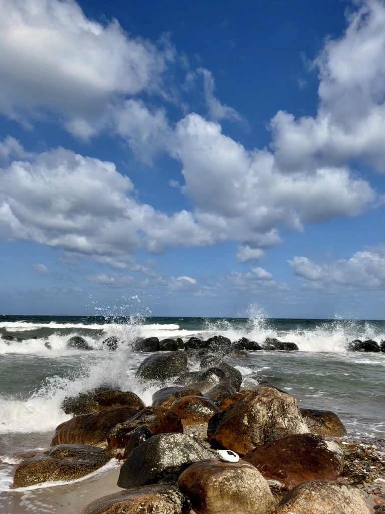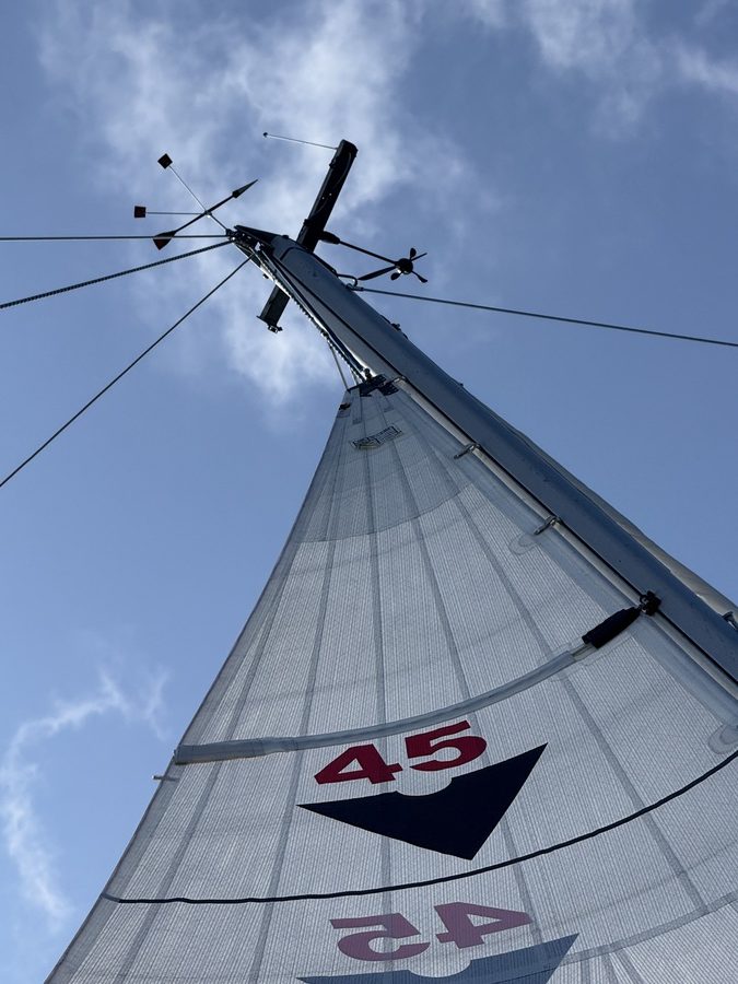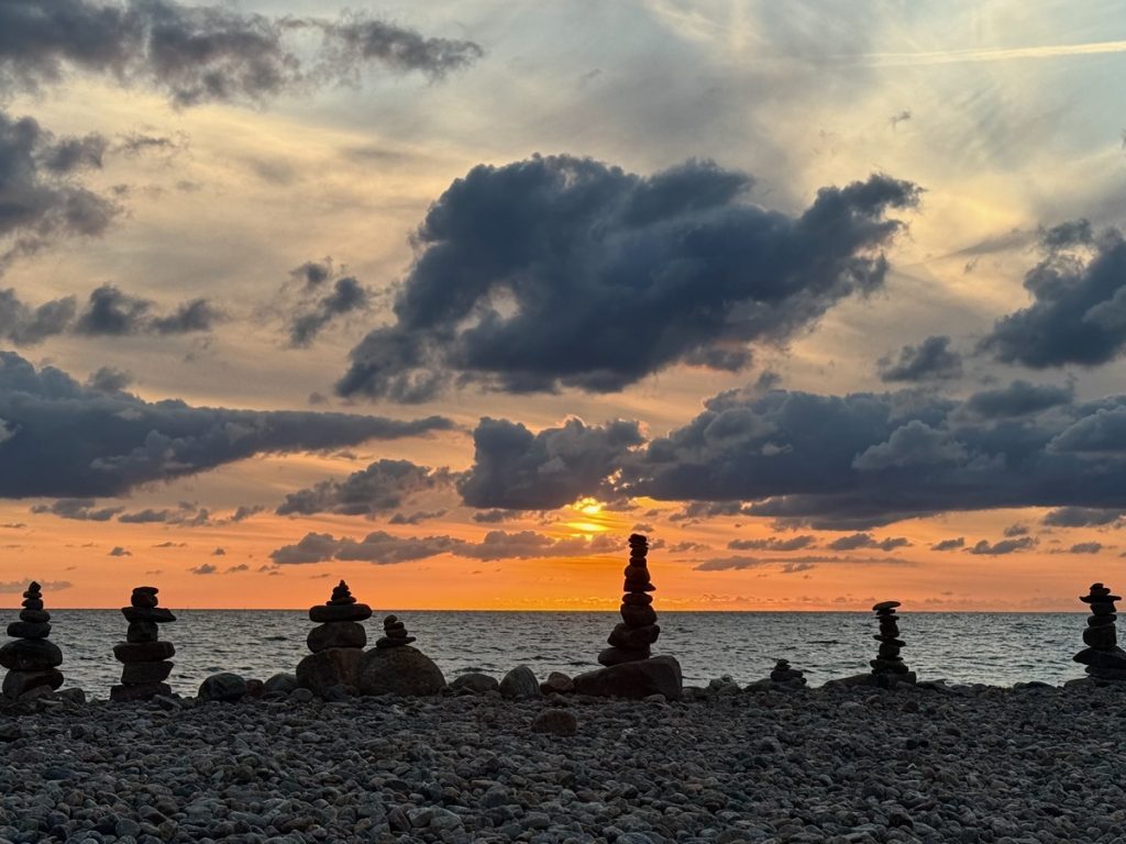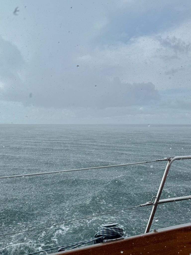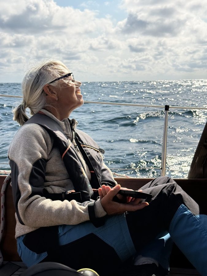Gestern dachten wir beim Blick auf die Windvorhersage, dass wir den heutigen Tag im Hafen verbringen. Nun sieht es nach dem Aufstehen ganz anders aus. Statt der vorhergesagten 20 Knoten Wind aus südlichen Richtungen, wehen nur 12 Knoten. Auch der Blick in die Wetterapp zeigt ein deutlich entspannteres Bild. Wir beschließen, die Gelegenheit zu nutzen und machen uns und das Boot seeklar. Kurz noch bei der Tankstelle vorbei und volltanken, dann geht es los. Auf einem entspannten Halbwindkurs mit wenig Welle aufgrund der Landabdeckung geht es Richtung Westen. Auch viele andere Segler nutzen das Wetterfenster – es strömt in beide Richtungen. An Seelandsodde zieht sich ein Flach weit in Richtung Nordwesten, aber es gibt einen betonten Durchgang. Den steuern wir an. Nach Norden sieht der Himmel ansprechend aus: blau mit weißen Schäfchenwolken. Im Süden steht eine graue Wand. Ein großes Regengebiet dreht sich in der Ferne – Flensburg hat es voll erwischt! Wir haben Glück und entgehen dieser Front und segeln fast durchgängig bei Sonnenschein. Gegen Mittag erreichen wir den Durchgang an Seelandsodde. Danach müssen wir anluven (höher an den Wind) und bekommen nun auch die Welle zu spüren, die im Großen Belt genug Platz hatte sich aufzubauen. Das bremst uns etwas aus, aber Jento läuft trotzdem meist mit 6 Knoten. Wir passieren das Fahrwasser der Berufsschifffahrt und ein großes Kreuzfahrtschiff zieht an uns vorbei. Auch die Route der Schnellfähren von Seeland nach Aarhus kreuzen wir und haben Glück, dass gerade keine Fähren in der Nähe sind. Der Himmel ist heute beeindrucken – immer wieder entdecken wir Figuren in den Wolken.