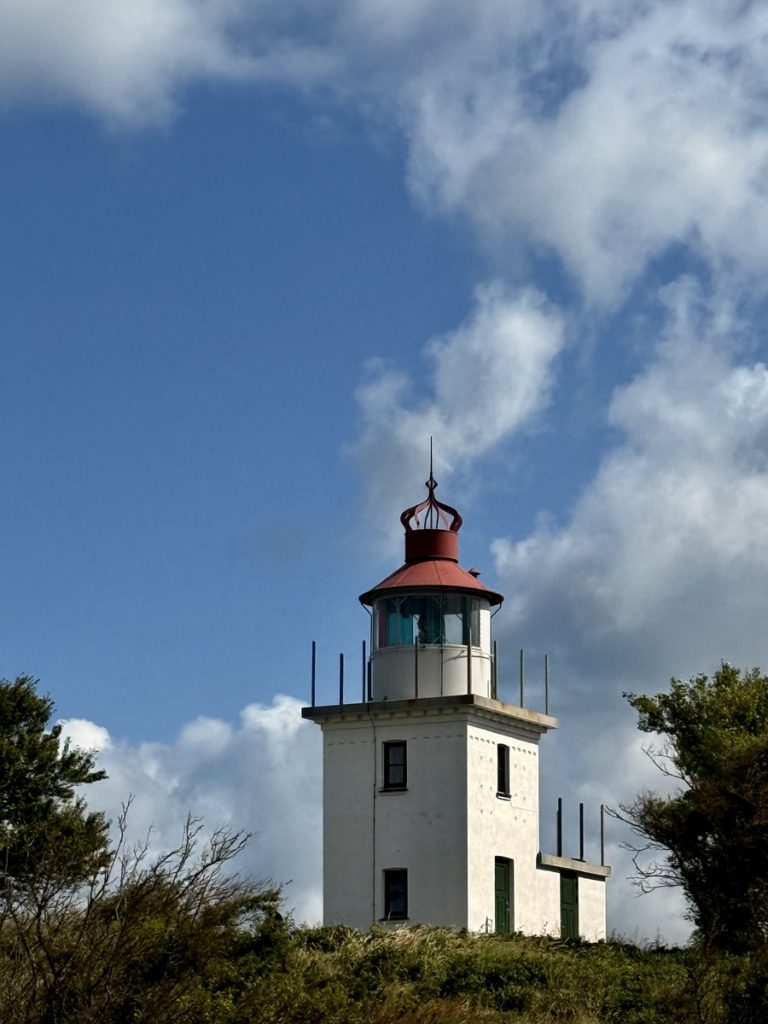 Wir sind eingeweht – es bläst mit 22-28 Knoten aus West, der Richtung, in die wir wollen. Abgesehen vom Wind, ist es aber ein schöner sonniger Tag und so brechen wir nach dem Morgenkaffee mal wieder zu einer Wanderung auf. Wir „ersteigen“ das Spodsbjerg Kliff bis zum Leuchtturm.