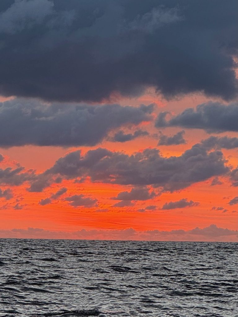 Zum Sonnenuntergang reißen die Wolken am Horizont nochmals auf und wir werden mit Kitsch pur beschenkt.
