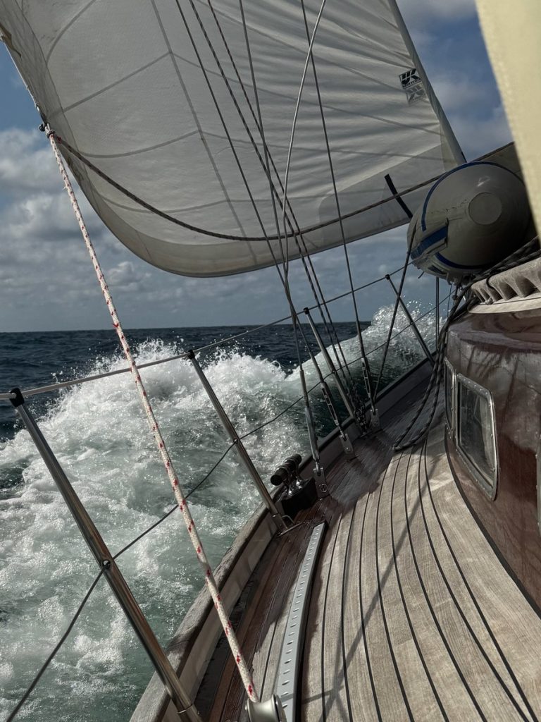 Mit dem morgendlichen Kaffeepott in der Hand entscheiden wir beim Blick in den aktuellen Wetter- und Windbericht, dass wir segeln wollen. Der Wind weht aus Südwest. Der anfängliche Kurs durch die Schären führt ca. 2 Seemeilen ziemlich direkt in diese Richtung, aber dann biegt das Fahrwasser etwas nach Südosten, so dass wir hoffen, mit einem Kurs hoch am Wind segeln zu können. Also heißt es das Dinghi wieder ordentlich verzurren, noch einmal zur Servicestation zum Abpumpen des Schmutzwassers und zum Einladen der Fahrräder verlegen. Wir verstauen unter Deck alles seefest und schließen die Seeventile. Dann noch die Schwimmwesten anlegen und los geht‘s. Unser Plan geht auf. Wir setzen das Groß im ersten Reff bereits auf den ersten Seemeilen mit Gegenwind. Dann können wir abfallen, nehmen bei jeder Bö die Gelegenheit wahr, etwas Höhe zu gewinnen und können so ohne einen Kreuzschlag den Schärengürtel verlassen. Die schwedische Festlandsküste verläuft südlich von Göteborg in südöstlicher Richtung und der Wind dreht im Laufe des Tages etwas westlicher. So laufen wir mit einem 60° Kurs, später sogar mit einem Halbwindkurs bei mäßigen Wellen (geschätzt 1-1,5 Meter) in Rauschfahrt Richtung Süden. Es macht Spaß und tut gut, endlich mal wieder zu segeln! Nach einigen Stunden findet Barbara durch Zufall einen Ringsplint an der Süllkante. Sogleich beginnt die Suche, wo dieser wohl herkommen könnte. Wir kontrollieren die Terminals an den Wanten und tatsächlich fehlt an Backbord am hinteren Unterwant der Splint. Zum Glück ist der Bolzen noch nicht ganz herausgerutscht. Nach ein paar Schlägen mit dem Holzhammer sitzt er wieder da, wo er hingehört und ein neuer Ringsplint kann eingesetzt werden, um ihn zu sichern. Natürlich werden sogleich alle anderen Splinte ebenfalls kontrolliert und auch der am vorderen Unterwand ist bereits dabei, herauszurutschen. Auch hier wird getauscht und nun sind wir wieder safe! Wie gut, dass der Splint an der Süllkante hängen geblieben und nicht direkt über Bord gegangen ist! Das hätte sonst unangenehm werden können. Wir segeln zwar heute den ganzen Tag auf Backbordbug und auf dem Unterwant ist wenig Spannung, aber ein freifliegendes Unterwant hätte uns einen ordentlichen Schrecken eingejagt!