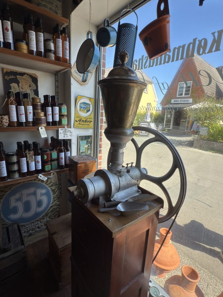 Über kleine Nebenstraßen und Schotterpisten geht es weiter durch kleine Inseldörfer, vorbei an diversen Straßenverkaufsständen, dem Weingut „Chateau Alstrup“ bis ins Dörfchen Besser. Hier treffen wir auf eine Galerie und ein Café im alten „Købmand“, in dem wir uns bei Kuchen und leckeren Kaltgetränken (Samsø Rhabarber- und Apfelsaft) eine kleine Pause gönnen.