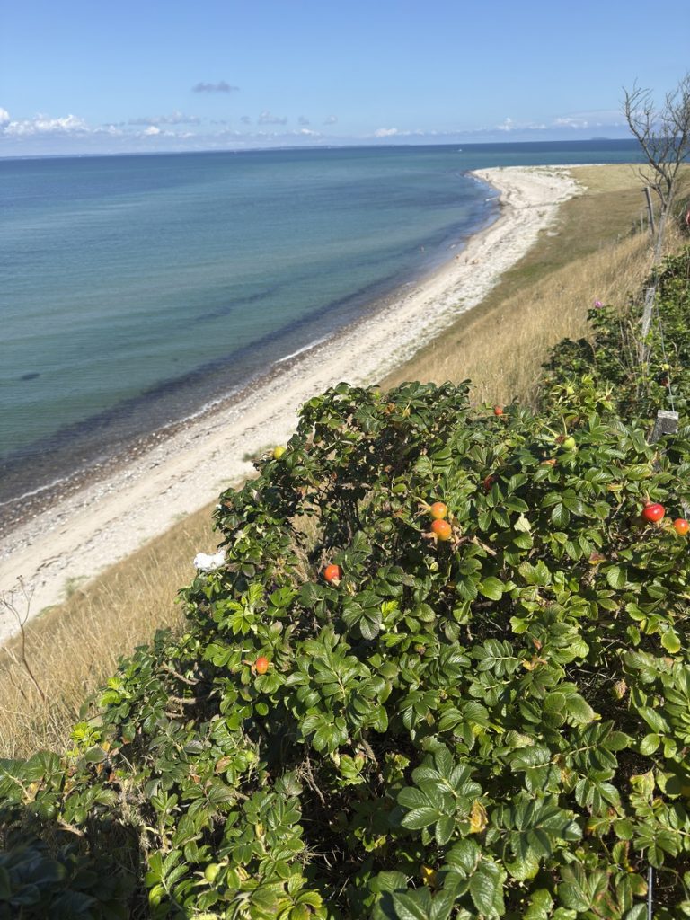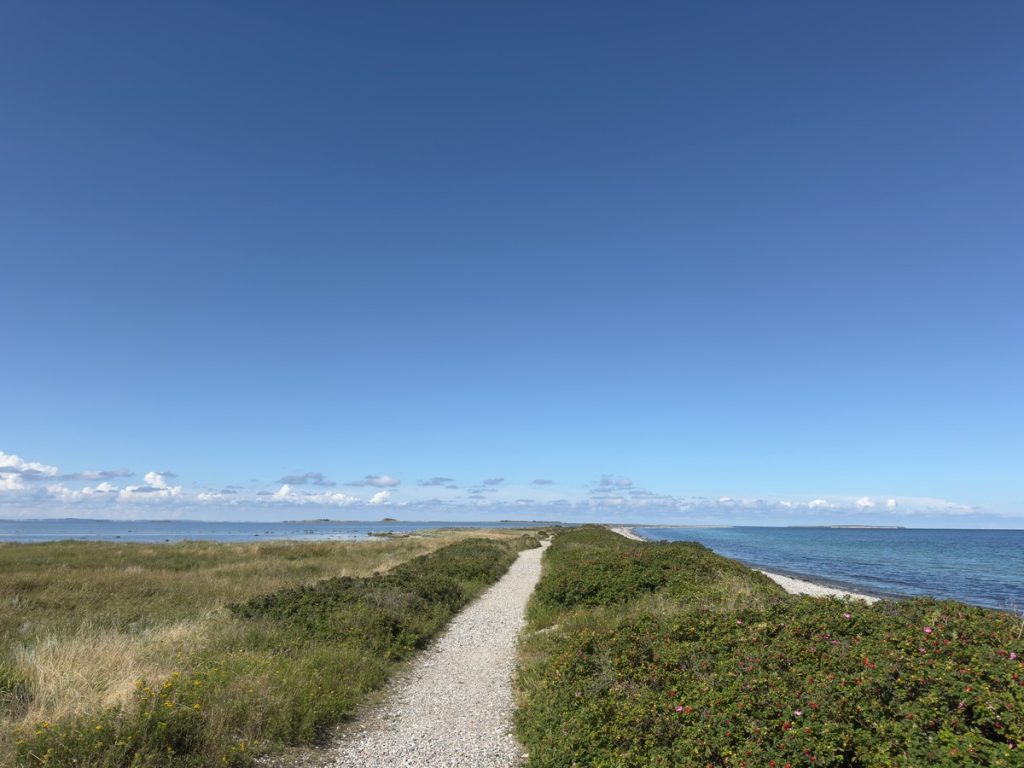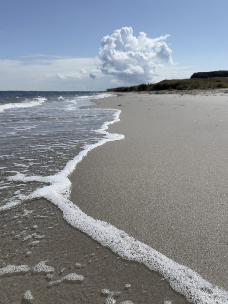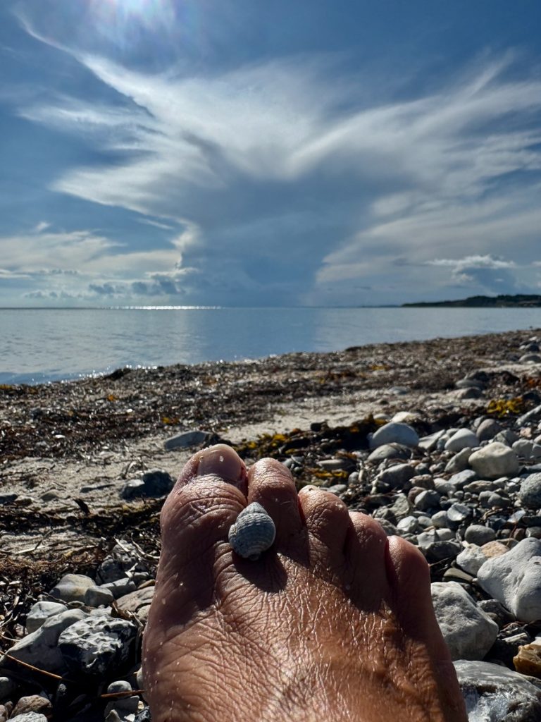 So gestärkt, schwingen wir uns wieder auf die Räder und radeln bis zum nördlichsten Parkplatz. Von dort geht es zu Fuß entlang der Westküste weiter durch die Hügel von Isehoved bis zur flachen Strandnase. Heute weht es aus östlicher Richtung und so suchen wir uns einen windgeschützten Platz am Strandgras. Nach einem erfrischenden Bad (eindeutig unter 20°), lassen wir uns von der Sonne trocknen und geben dem Körper Zeit, Smørrebrød und Bier zu verarbeiten. Später umrunden wir die Nordspitze am Spülsaum. Vor Jahren hat uns auf der Westseite mal ein kleiner Tsunami überrascht, der alle paar Stunden von den vorbeifahrenden Schnellfähren verursacht wird. Heute haben wir Glück und erwischen eine Tsunamipause.