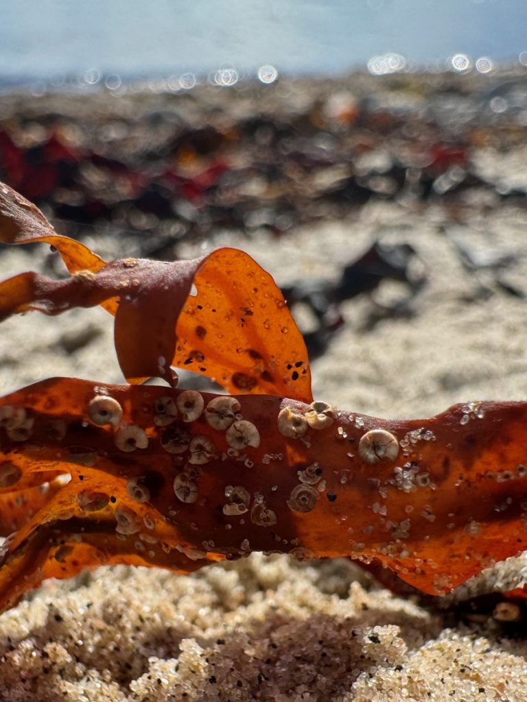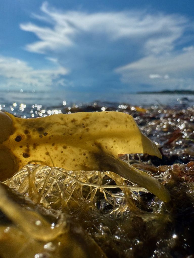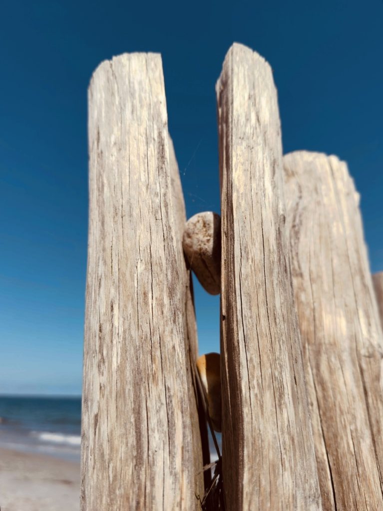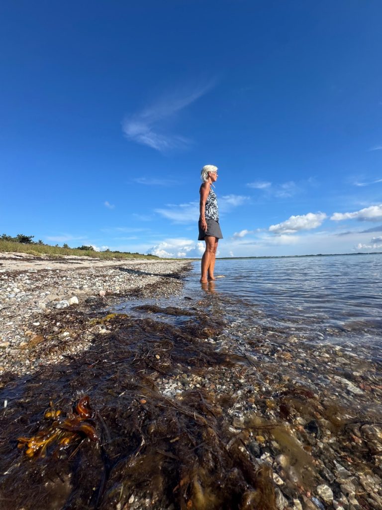 So gestärkt, schwingen wir uns wieder auf die Räder und radeln bis zum nördlichsten Parkplatz. Von dort geht es zu Fuß entlang der Westküste weiter durch die Hügel von Isehoved bis zur flachen Strandnase. Heute weht es aus östlicher Richtung und so suchen wir uns einen windgeschützten Platz am Strandgras. Nach einem erfrischenden Bad (eindeutig unter 20°), lassen wir uns von der Sonne trocknen und geben dem Körper Zeit, Smørrebrød und Bier zu verarbeiten. Später umrunden wir die Nordspitze am Spülsaum. Vor Jahren hat uns auf der Westseite mal ein kleiner Tsunami überrascht, der alle paar Stunden von den vorbeifahrenden Schnellfähren verursacht wird. Heute haben wir Glück und erwischen eine Tsunamipause.