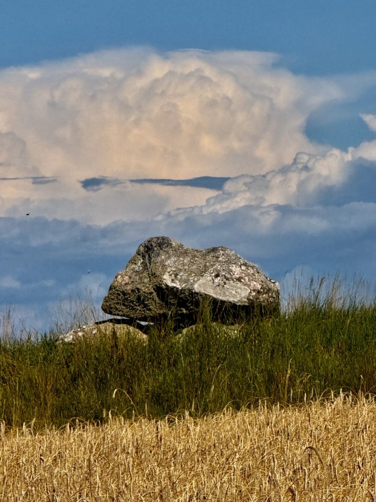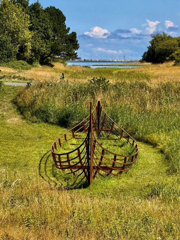 Heute gibt es keinen Wind, deshalb beschließen wir, die Fahrräder an Deck zu fahren – geht einfach schneller. Wir fahren im Sonnenschein los, umrunden die Nordspitze von Samsø, sehen unsere gestrige Badestelle und haben nun südlich voraus Höhe Tunø eine dicke Regenwolke vor uns. Genau wie vorgestern, erwischt es uns kurz vor dem Hafen, aber das Ganze dauert weniger lange. Wir finden einen Liegeplatz im alten Hafen neben einer Vindö 32. Hier in Mårup findet an diesem Wochenende das dänische Vindötreffem statt, bei dem wir wieder viele Bekannte treffen. Der Platz unter der Sprayhood ist trocken geblieben, so können wir im Cockpit frühstücken. Wenig später trudeln die nächsten Vindös ein. Ein Blick in die Wetterapp zeigt uns, dass es für den Rest des Tages trocken bleiben soll. So machen wir uns mit den Rädern auf den Weg zum „Besser Rev“, einer schmalen Landzunge gegenüber von Langør, die wegen des Vogelschutzes erst ab Mitte Juli betreten werden darf. Wir wollten dort schon immer mal hin, aber waren immer zur falschen Zeit auf Samsø. Jetzt passt es. Von Maarup ist es allerdings eine Radtour von ca. 17 Kilometern hin und wieder zurück. Der Weg führt uns vorbei am Kanhave Kanal an der schmalsten Stelle der Insel. Ursprünglich bestand Samsø aus zwei Inseln. Der schmale Durchgang zwischen den Inseln versandete um Christi Geburt allerdings mehr und mehr und die Inseln wuchsen zusammen. Allerdings war die Verbindung zwischen dem Kattegat und der Bucht von Aarhus wohl sehr wichtig, denn 726 n.Chr. wurde an der schmalsten Stelle der Kanhave Kanal angelegt. Während der Kanal nach Osten hin offen war, mussten die Schiffe das letzte Stück Richtung Westen über Rundhölzer gezogen werden (Schutz vor den Weststürmen). Der Kanal diente als Fluchtweg, Hafenanlage und bei Westwind als Ausfahrt nach Osten. Noch heute kann man den Verlauf des ehemaligen Kanals ehemaligen Kanals gut erkennen. Vom Strand an der Westseite blickt man quer durch die Insel und sieht am anderen Ende die Masten von Langør in der Ferne.