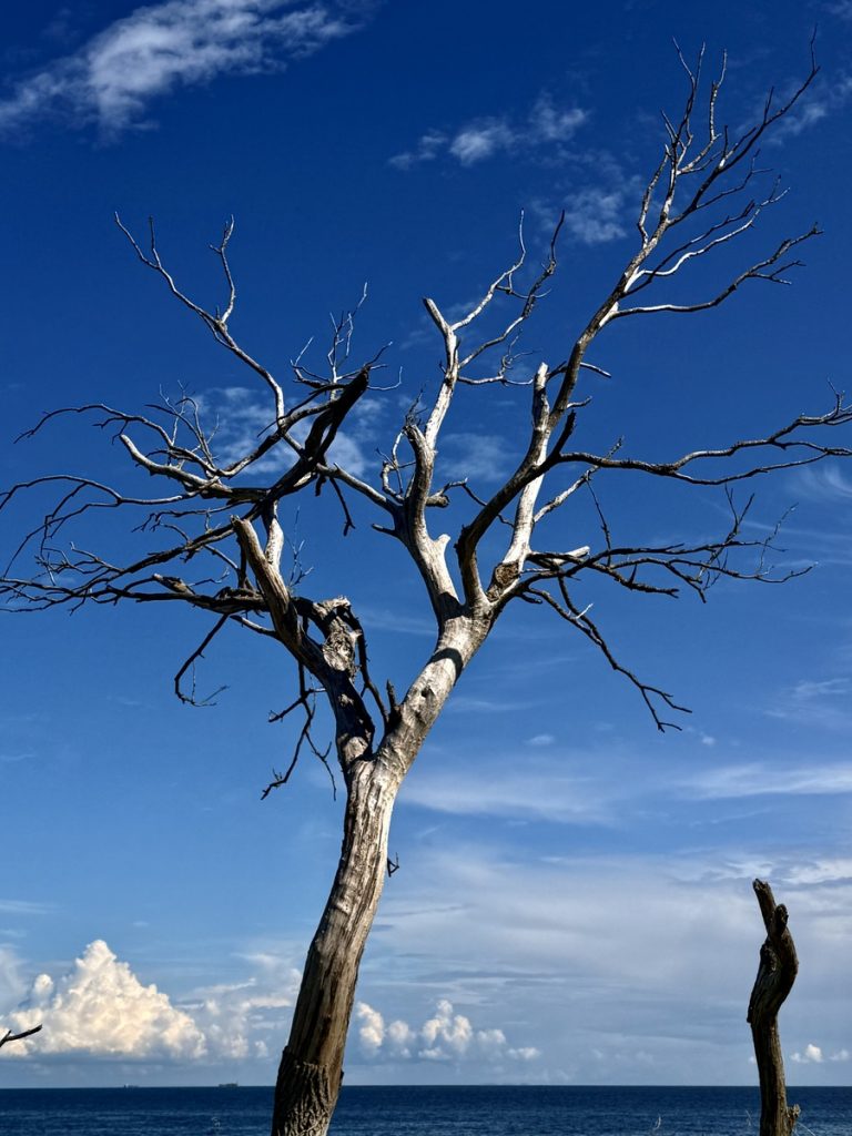 Das letzte Stück bis zum Besser Rev bewältigen wir so gestärkt ohne Problem. Am Ziel werden die Räder geparkt und wir brechen zu einer Wanderung auf. Allerdings endet diese bereits nach einem knappen Kilometer, weil die Ostsee sich durch die Landzunge gefressen hat. Es ist nicht tief und wäre auch nicht sehr weit hier durch das Wasser zu waten, aber bis zur Spitze würden wir es heute sowieso nicht schaffen, denn das Rev zieht sich gut 10 Kilometer im großen Bogen um den Stavn Fjord. Wir beschließen, den Besuch auf unsere Buketliste zu schreiben und beim nächsten Samsøbesuch im Stavn Fjord zu ankern, um mit dem Dinghi hier anzulanden.