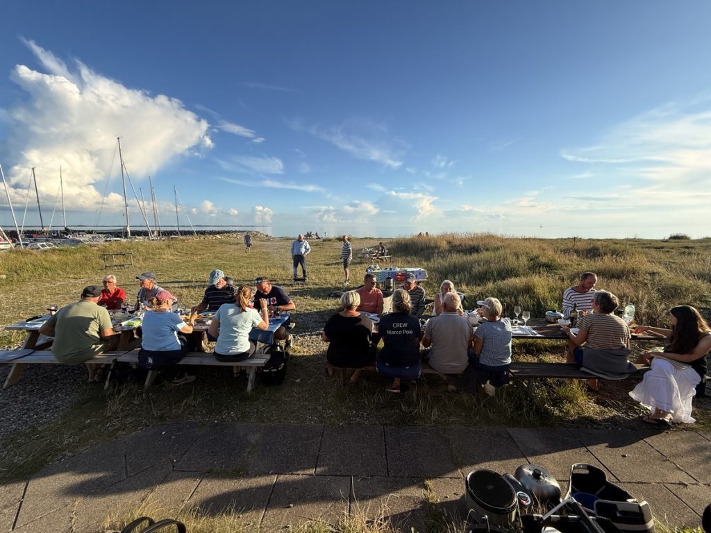 Abends wird mit der Vindøtruppe an langer Tafel am Strand gemeinsam gegessen und geklönt bis die Sonne hinter Wolken verschwindet.