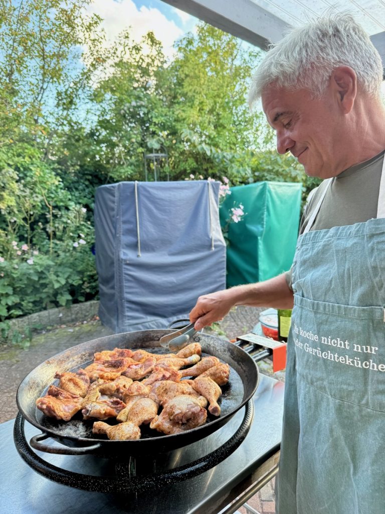 Später macht Werner sich dann zumindest noch daran, das Dinghi aufzupumpen – dank unserer neuen 12V-Pumpe kein Problem, bevor er die Pantry einweiht: Hähnchencurry mit Reis – lecker!