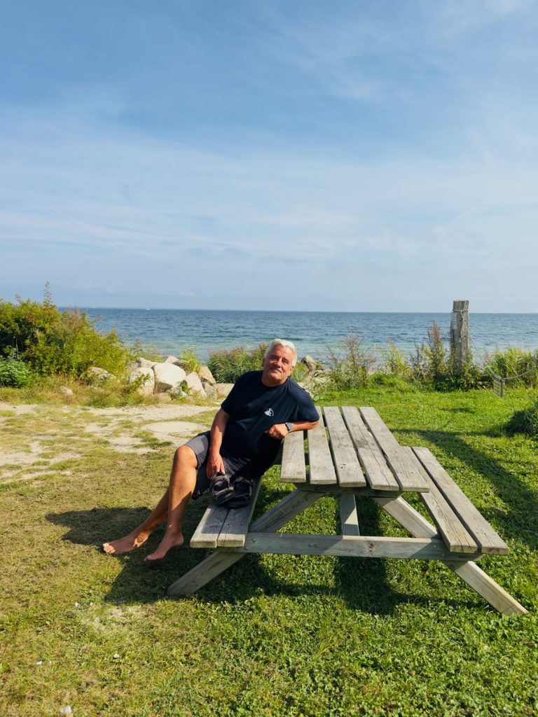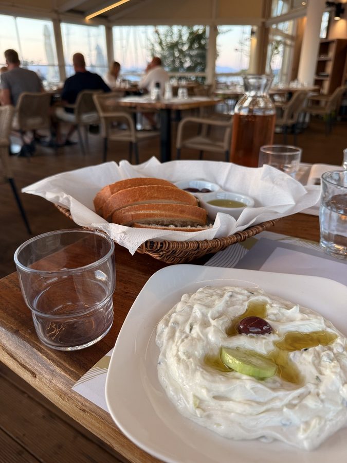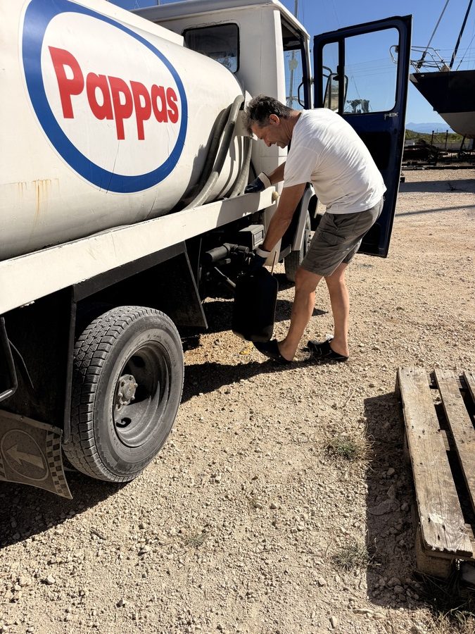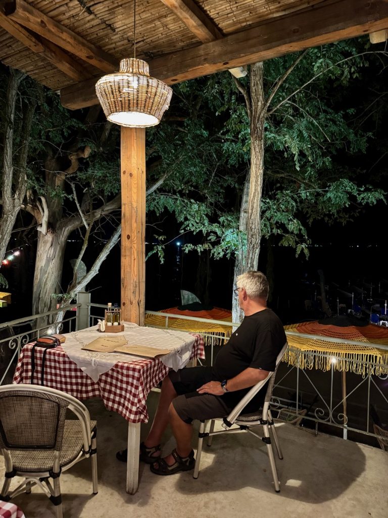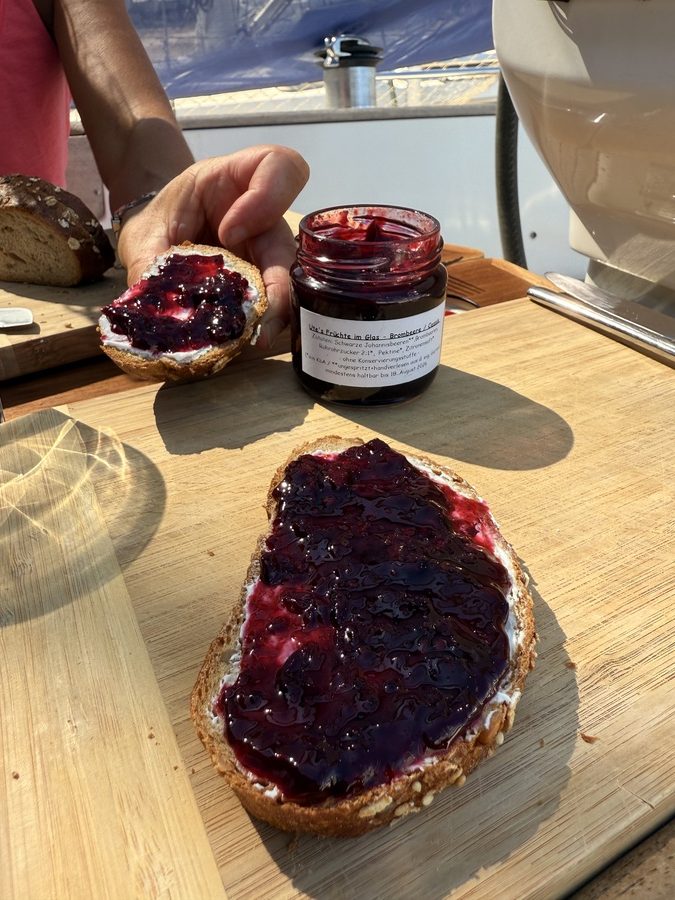 Bevor es zur Werft geht, treffen wir uns auf einen Kaffee mit unserem norwegischen Freund Per (Kalamata-Community) an der Marina. Barbara hatte ihn auf Marinetraffic „gestalkt“ und gesehen, dass er seit zwei Tagen in Preveza liegt. Am Abend will er nach Norwegen fliegen, also passt ein Treffen nur jetzt. So kommen wir erst gegen Mittag auf die Werft – zur größten Hitze und frühstücken erstmal.