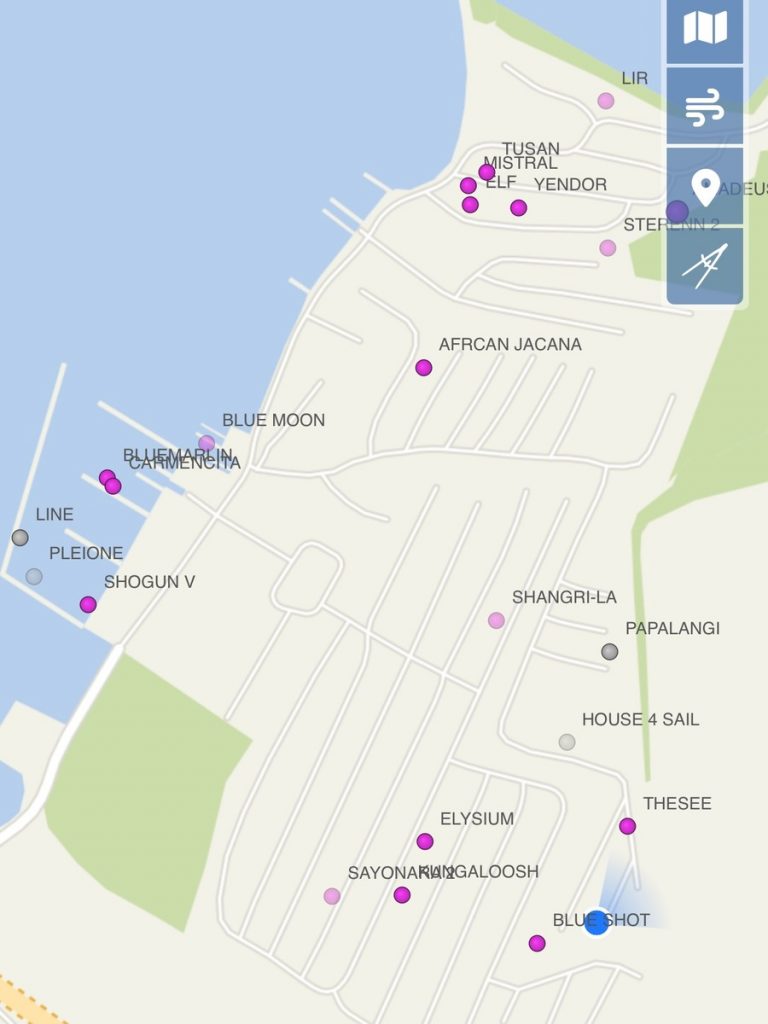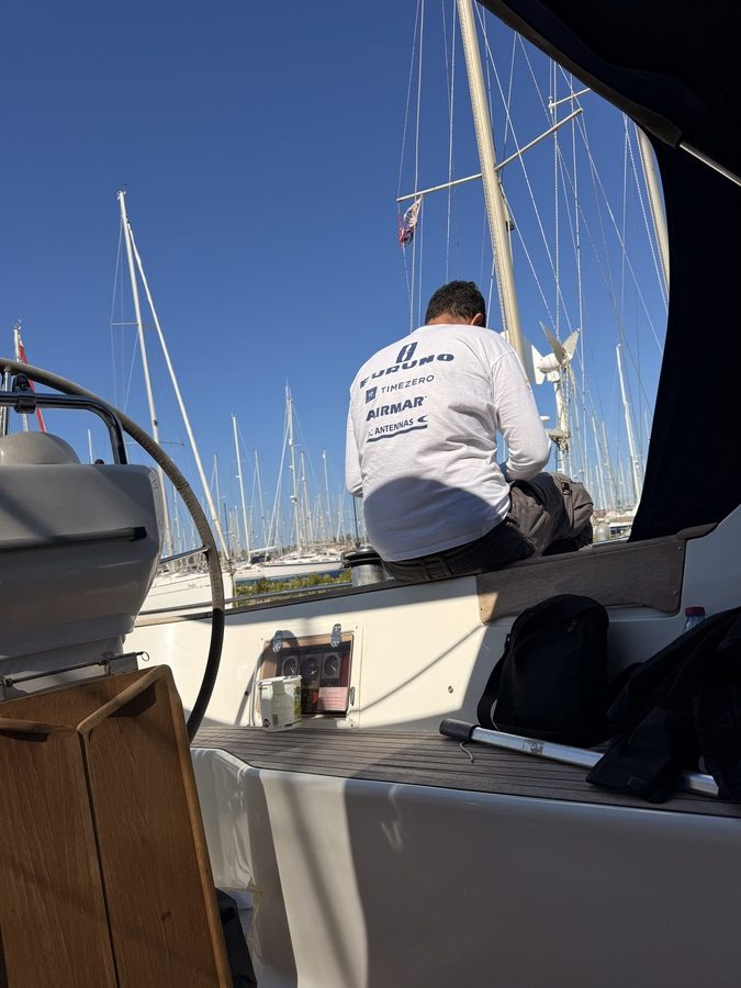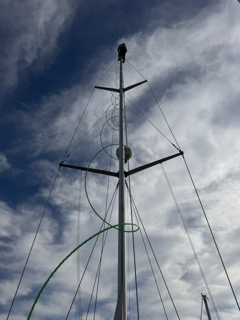 Eine Stunde später als angekündigt kommen dann auch die Techniker für unser Mastkabel. Sie schauen sich als erstes das ganze Raymarinesystem an. Unser Voreigner hatte vor ein paar Jahren ebenfalls das Problem eines defekten Kabels. Damals war es das Kabel zum Windmesser an der Mastspitze. Eine Firma zog damals ein neues Kabel in den zweiten existierenden Kabelkanal und zog es durch das Deck bis zum Anschluss an das Bordsystem ohne eine abnehmbare Kabelverbindung, was zum Problem wird, wenn man den Mast herunternehmen möchte. Den Technikern fällt dieser „Fehler“ sofort ins Auge. Nachdem Werner ihnen unsere Probleme geschildert hat, beschließen sie dieses Kabel als Supportleine zu „missbrauchen“ und darüber sowohl das neue Antennenkabel als auch eine gelbe Supportleine einzuziehen. Einer der beiden wird in seinem deutlich bequemeren Bootsmannstuhl in den Mast gezogen. Seine Ausrüstung, die er dabei mit sich führt macht deutlich, wie viel Erfahrung er damit schon hat. Long Story short: nach insgesamt 4 Stunden (2 Mann) und davon zwei Stunden im Mast sind alle Kabel und Leinen an Ort und Stelle, unser AIS hat nun eine Reichweite von mind. 36 Seemeilen (das war das am weitesten entfernte Schiff im System), das Kabel zum Windmesser ist ordnungsgemäß angeschlossen und wir haben ein neues hochwertige Kabel und eine hochwertige AIS-Antenne auf dem Mast. Der Preis ist mit 600€ zwar auch kein Spaß, aber uns in diesem Fall allemal wert. Uns war es viel zu heikel, das einzige relativ neue Kabel herauszuziehen – wir sind happy, dass das Thema nun erledigt ist!