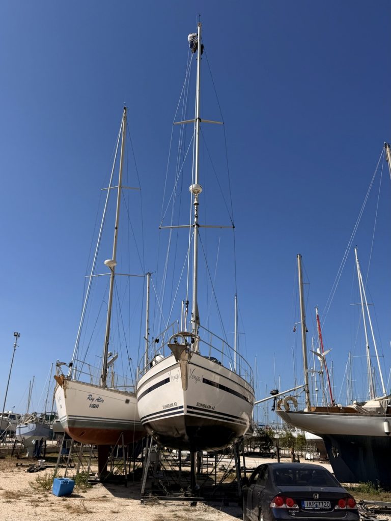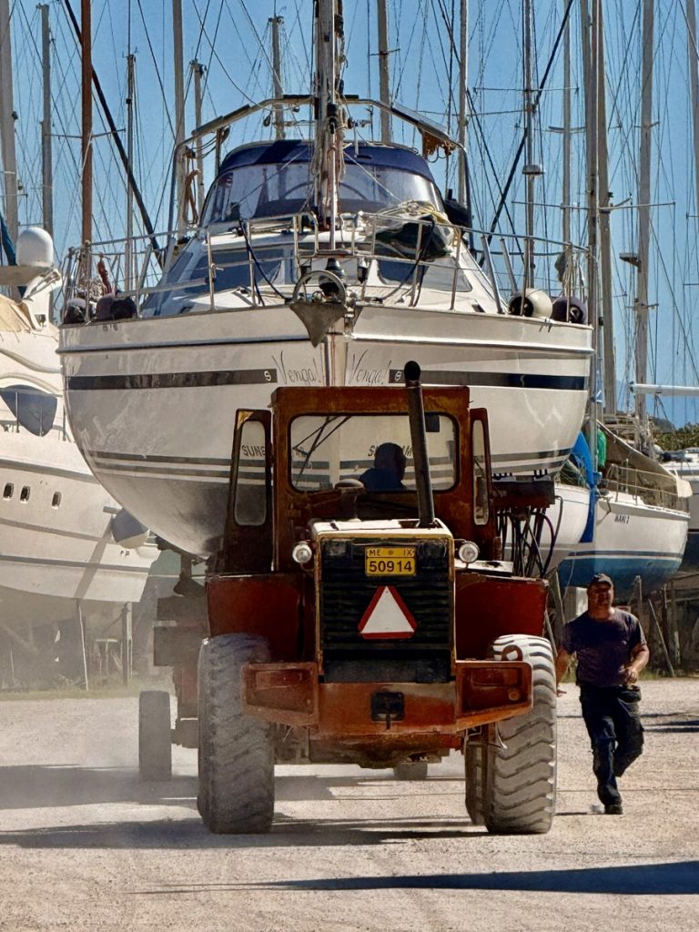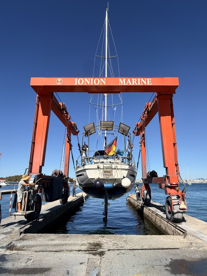 Nun heißt es wirklich Abschied nehmen von unserer schönen Unterkunft in Preveza. Die Sachen sind schnell gepackt und mit unserem allmorgendlichen Dobbleshot-Cappuchino aus dem „Fly-away-shop“ an der Straße zur Werft, erreichen wir Venga!. Als erstes werden die Stützen wieder an die ursprünglichen Plätze zurückversetzt. Wenn heute jemand in den Mast geht, muss das Boot 100% sicher stehen. Für Barbara steht heute als erstes Wäsche waschen auf dem Programm. Es ist beeindruckend, wie schnell Sonne und Wind alles trocknen!