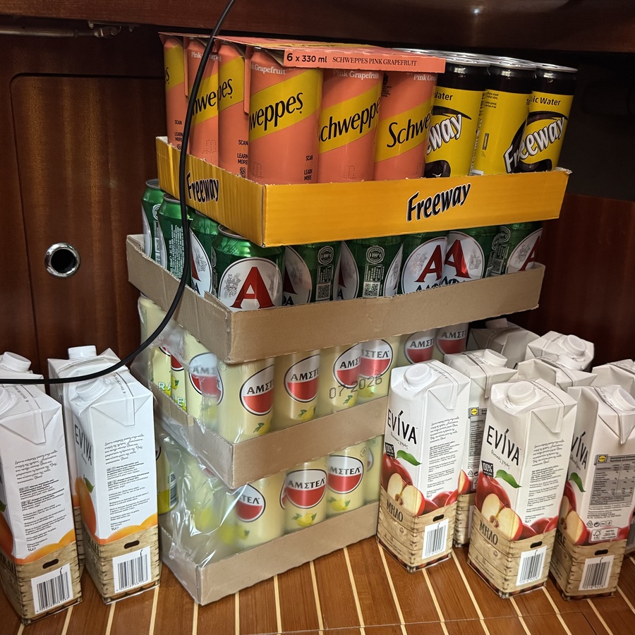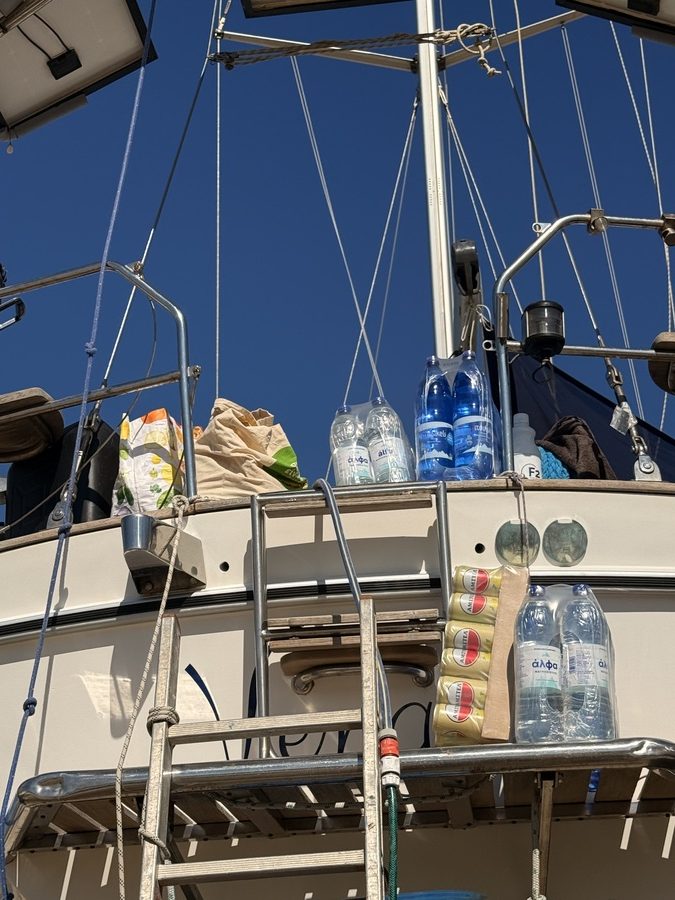 Barbara erledigt in der Zwischenzeit den Großeinkauf in Preveza bei Lidl und dem griechischen AB-Supermarkt. Das Auto wird ordentlich vollgeladen – vor allem mit Getränken und ein paar Konserven (Mais, gehackte Tomaten, Kidneybohnen, Kokosmilch, Gewürzgurke). Dazu kommen „Dauerschwarzbrot“, ganz viel Käse und Gemüse, Obst und Fleisch für ein paar Tage. Wir wollen nach dem Werftaufenthalt erstmal vor Anker liegen und uns erholen!