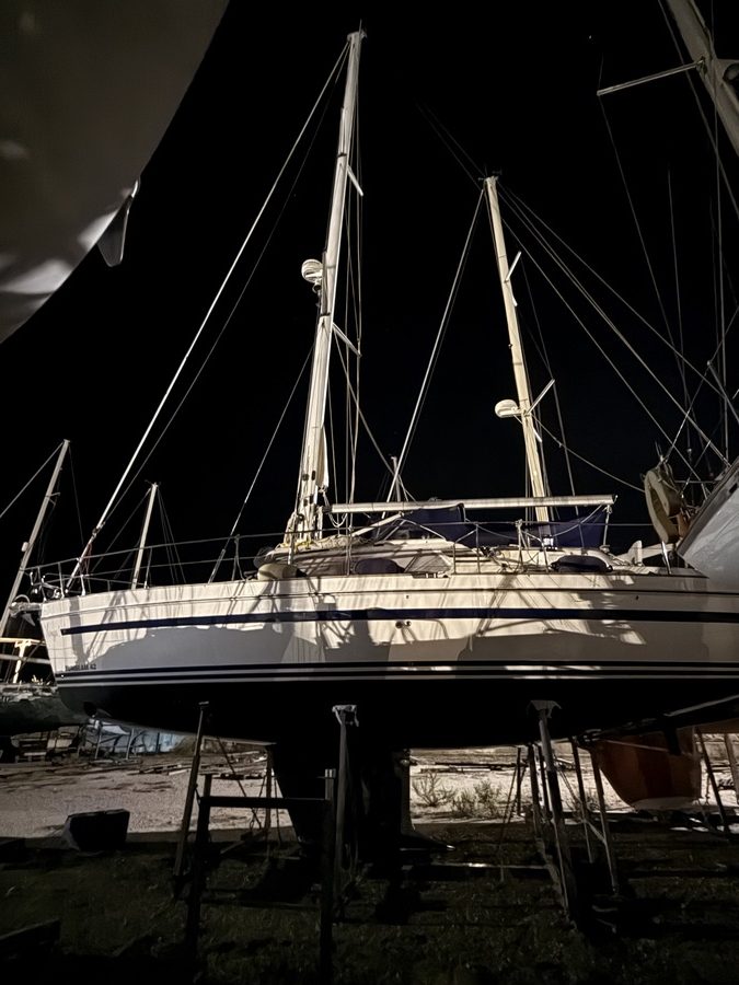 Das Unterwasserschiff sieht gut aus und ist schon ziemlich trocken. Bevor es mit dem Streichen unter den Stützen weitergeht, will Werner erstmal in den Mast. Das Projekt „Antennenkabel“ konnten wir im Frühjahr nicht abschließen – es fehlte an Equipment. Nun haben wir uns eine Spirale besorgt, mit der man einfacher durch den Mast kommen soll und wir haben eine Schlüssellochkamera dabei. Mit dieser können wir nun sehen, warum wir solche Probleme hatten, alte Kabel herauszuziehen: Der gesamte Kabelstrang ist mit Kabelbindern verschnürt. Kein Wunder, uns riss das alte Antennenkabel durch, als wir versuchten daran das neue einzuziehen! Die zweite Erkenntnis ist, dass innerhalb des Holprofils im Mast ein Kabelkanal eingelegt ist, der allerdings etwa 15cm unterhalb der Mastspitze endet. Diesen Kabelkanal mit der Spirale zu treffen klappt leider nicht. Außer frustrierendem Gestocher in schwindelerregender Höhe und bei knapp 30 Grad bringt das gar nichts. Bleibt nur noch, das Kabel außen am Mast festzukleben? Nicht schön, aber würde wahrscheinlich für die nächsten 3 Monate funktionieren, aber das Thema nur aufschieben. Wir sind frustriert und beschließen bei der Werft anzufragen, ob sie evtl. den Mast legen könnten. Dafür haben sie allerdings keine Kapazitäten, weil die Aufslipp-Saison gerade an Fahrt aufnimmt. Ja, die meisten Boote gehen hier jetzt aus dem Wasser und nicht hinein, wie wir. Aber man vermittelt uns Fachleute, die uns das Kabel in den stehenden Mast ziehen können für den Morgen. Da fackeln wir nicht lange und sagen sofort zu.