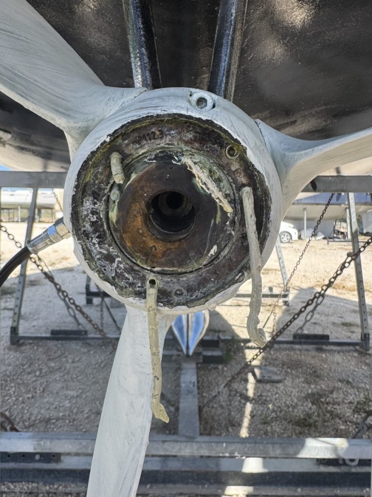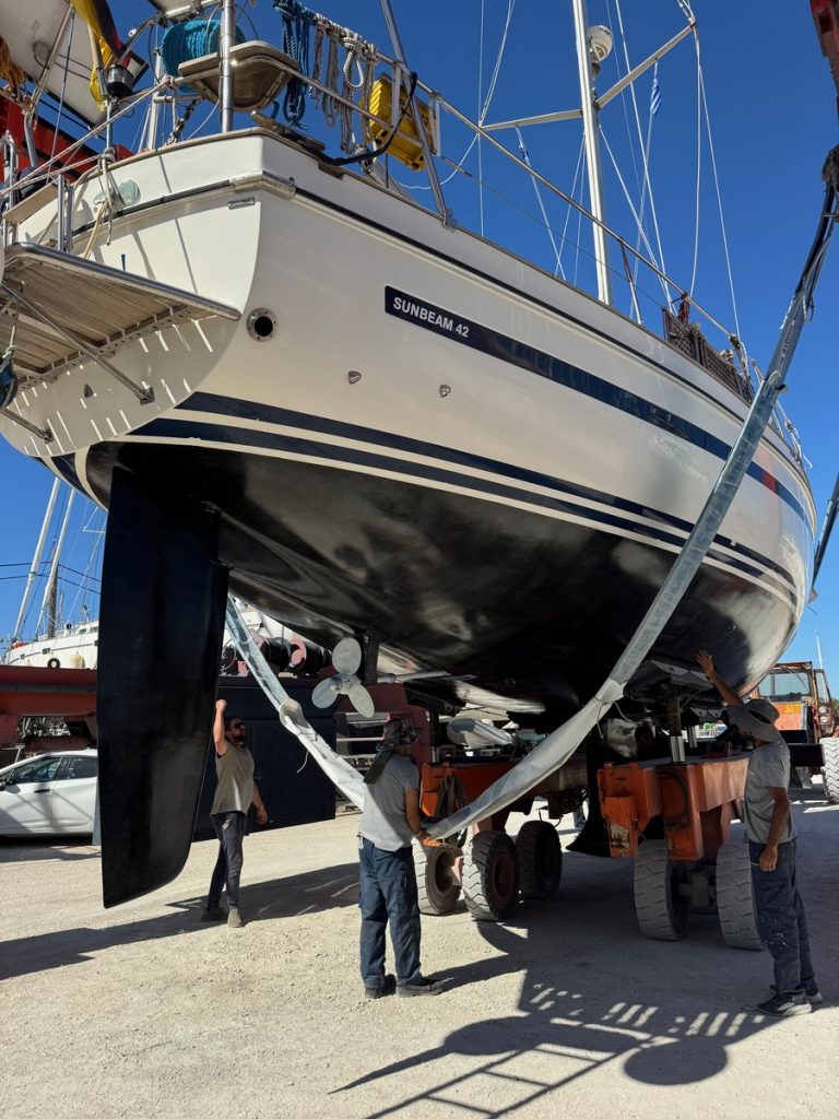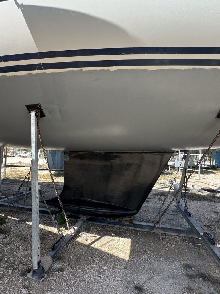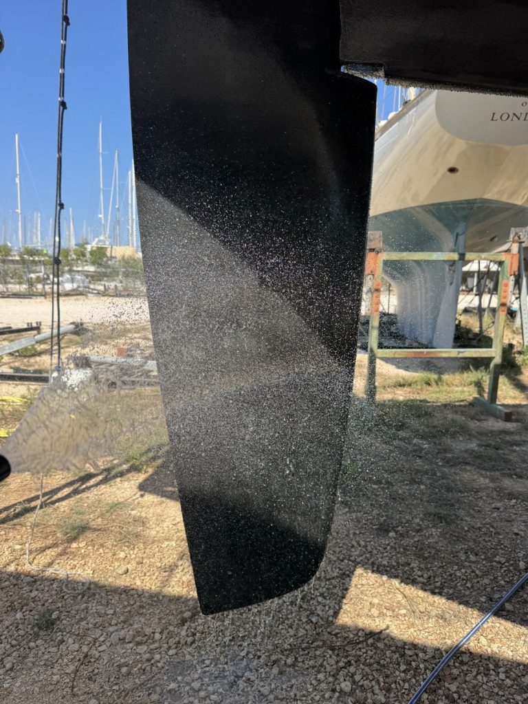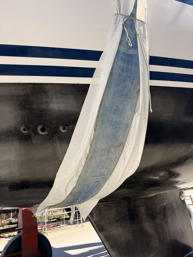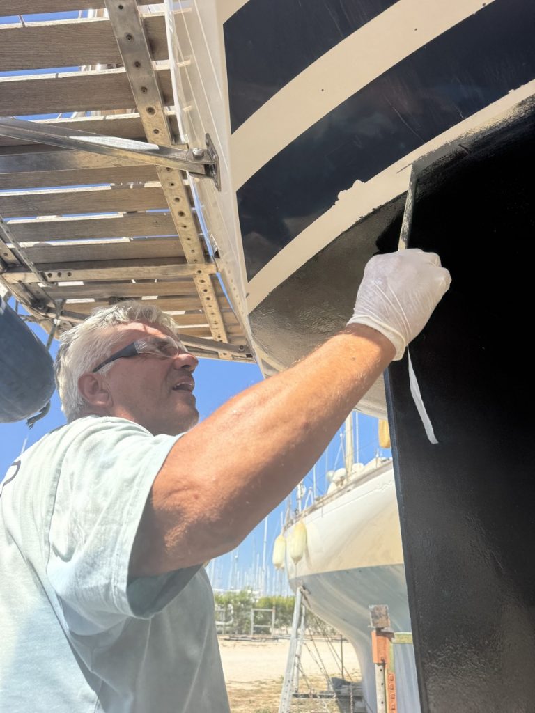 Im Anschluss widmen wir uns den Stützen, die wir nacheinander lösen, leicht verschieben und wieder festziehen. Dabei packen wir die Teppichpolster jeder Stütze mit Backpapier ein, damit der neue Anstrich geschont wird – eine Empfehlung des Händlers @sailing-insieme (https://sailing-insieme.com/products/f2-hullkit). Die Primerschicht hatten wir bereits unter den Stützen angebracht und müssen nun noch die Zwischen- und Endschicht aufbringen. Das ist Barbaras Job – Werner kümmert sich derweil um den Außenborder und den Propeller. Und dann kommt der große Augenblick, an dem wir den Kleber zum Überwasserschiff entfernen und das Endresultat bewundern können – sieht sehr schön aus! Und hat jetzt auch noch an allen Stellen die empfohlenen 36 Stunden Zeit zum Aushärten vor dem Einwassern. Erschöpft geht es zurück nach Preveza zur Abendroutine: Baden – Duschen – Taverne.