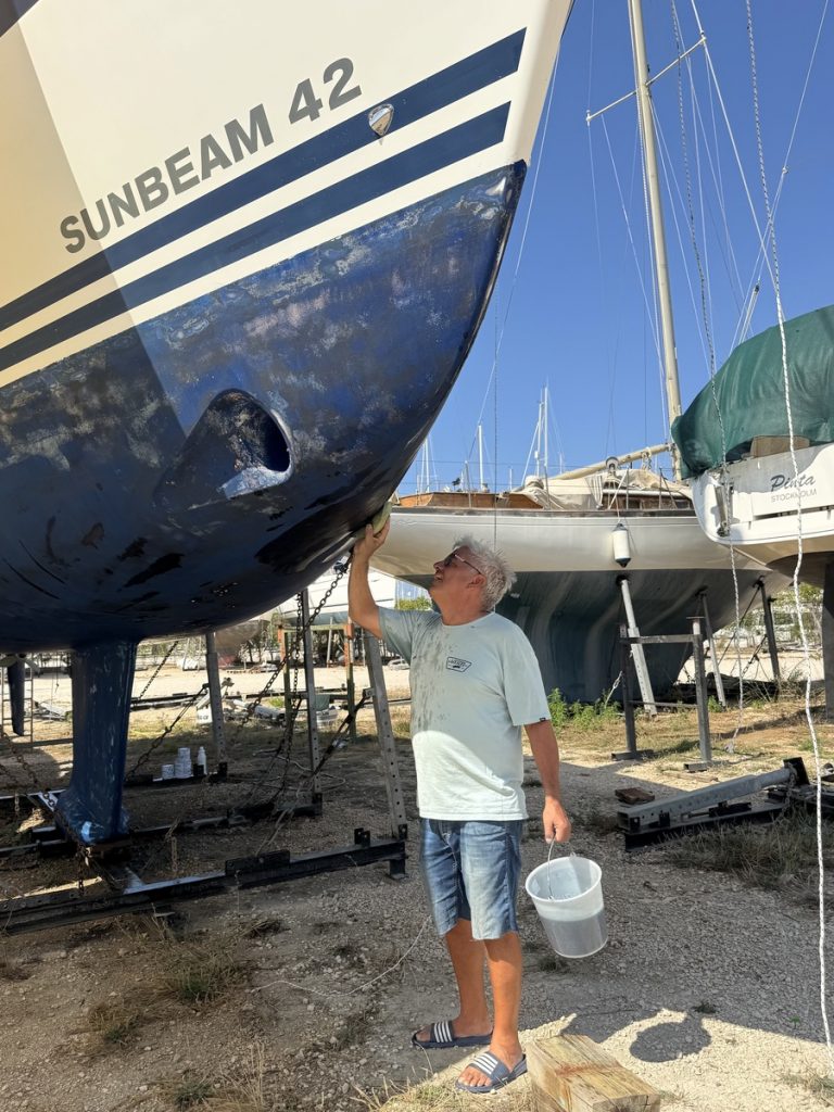 Wir haben uns für die neuartige, biozid- und silikonfreie Beschichtung „F2 Eco“ entschieden, die mindestens 5 Jahre halten soll. Diese besteht aus drei Schichten, die nacheinander aufgebracht werden müssen. Wir beginnen mit dem Primer. Uns wurde empfohlen, das alte Antifouling komplett zu entfernen – was die Werft nun leider nicht gemacht hat. Wir sind nicht darauf vorbereitet zu schleifen, weder zeitlich noch materialmäßig. Daher freut es uns zu lesen, dass der Primer auch auf alte haftende Antifoulingschichten aufgebracht werden kann. Vorher soll der Rumpf gewaschen und entfettet werden. Diese beiden Arbeitsschritte erledigen wir gemeinsam, bevor Barbara sich der Reinigung des Covers widmet und Werner mit dem Streichen des Primers beginnt. Schon nach wenigen Minuten kleben die ersten Placken alten Antifoulings an der Rolle – Werner ist frustriert. Also Abbruch, mit einem Spachtel den Primer wieder abkratzen und Schwingschleifer und Schleifpapier suchen. Wie sich herausstellt, ist es nur der Streifen zum Wasserpass, der nicht tragfähig ist. Werner schleift diesen Bereich gründlich nach und startet dann den zweiten Versuch. Diesmal saugt sich der Primer regelrecht am Rumpf fest und ist in kürzester Zeit grifftrocken. Leider ist es aber über die Schleiferei bereits später Nachmittag geworden und somit zu spät für die zweite Schicht. Wir packen zusammen und fahren nach Preveza, wo es erstmal zum Baden (einweichen) im herrlich warmen Wasser, dann zum Duschen (gründlich Schrubben) und anschließend in unsere Taverne geht. Völlig erschlagen fallen wir danach in die bequemen Betten – gute Entscheidung das Zimmer zu verlängern!!!