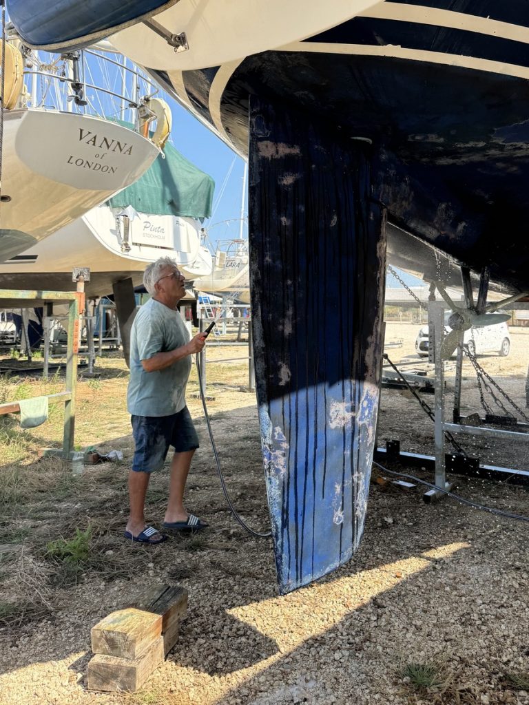 Gemäß Empfehlung wässern wir das Unterwasserschiff mit dem Schlauch. Das soll die Aushärtung des Anstrichs beschleunigen. Es ist beeindruckend, wie glatt die Oberfläche geworden ist und das Wasser perlt so hübsch ab!