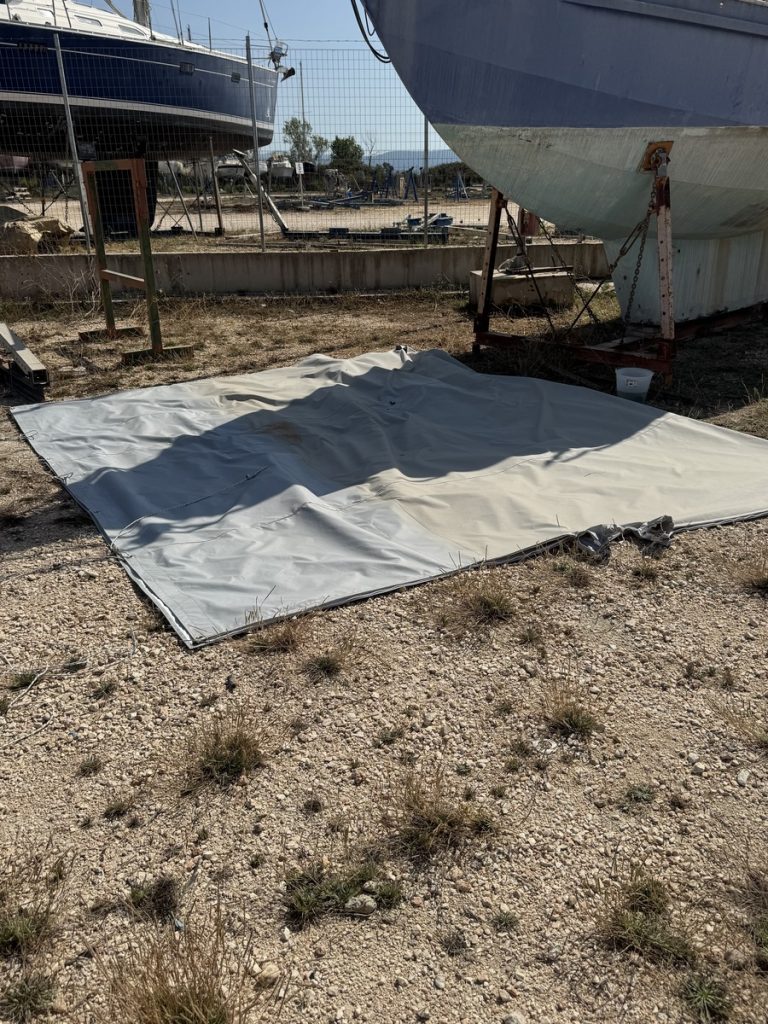 Auf der Werft erwartet uns Venga! genauso gut verpackt, wie wir sie verlassen haben. Aber es muss mehrmals der Calima (Südwind mit Saharastaub) gewütet haben, denn das Cover ist oben mit einer orangefarbenen Schmutzschicht überzogen. Offensichtlich gab es auch ein paar kräftige Regenschauer, denn über dem Achterdeck haben sich Wassersäcke gebildet. Da müssen wir uns beim nächsten Mal etwas einfallen lassen, denn sonst droht das (nicht ganz billige) Cover dort zu reißen.