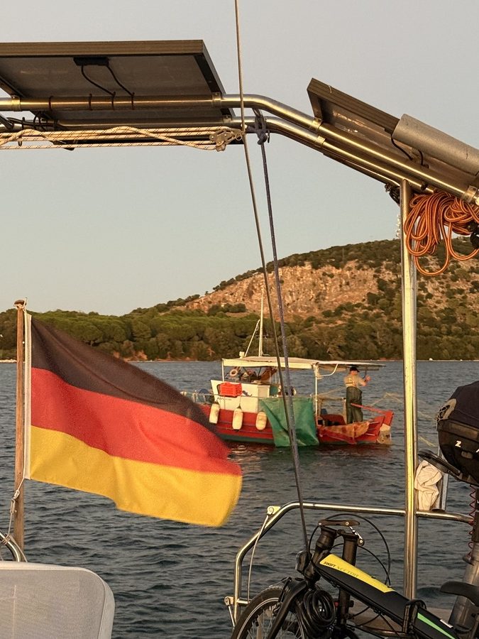 Schon nach 1,5 Seemeilen fällt der Anker vor Agios Thomas. Wir sind erleichtert, alles hat geklappt. Nun wird erstmal gebadet, gefrühstückt und „gewohnt“. Noch haben wir auch das Bimini (Cockpit Sonnenschutz) nicht aufgebaut und spannen daher einen Sonnenschutz, der natürlich bei drehendem Wind und schwoiendem Boot nur manchmal das Cockpit beschattet. Aber wir haben heute beide keine Lust mehr auf Action und müssen uns erstmal ausruhen. Barbara beginnt mit dem Studium des Revierführers zum Ambrakischen Golf und wird durch ein Platschen abgelenkt. Was war das? Sie steigt auf das Dach des Salons, um einen besseren Überblick zu haben und entdeckt einen großen Schatten unter Wasser, der in geringem Abstand am Boot entlangschwimmt. Als er sich der Wasseroberfläche nähert wird klar: es ist eine Meeresschildkröte. Kurz taucht ein mehr als faustgroßer Kopf auf, dann taucht sie wieder ab – so eine schöne Begrüßung!