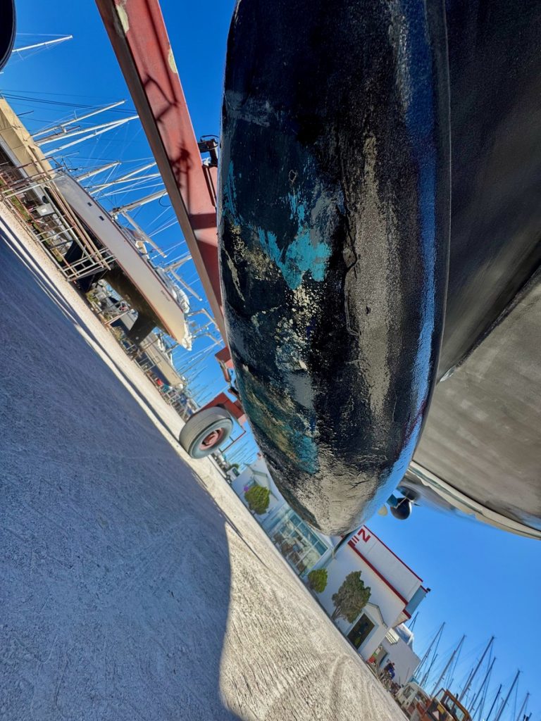 Nun beginnt die Fahrt über den Boatyard bis zur Einwasserung – gut 800 Meter im Schneckentempo. Wir haben uns vergewissert, dass die Auflagen auf dem Wagen sauber und weich sind – das übersteht der Anstrich ohne Schäden. Die Gurte des Traveller Liftes werden mit sauberer Plastikfolie eingepackt. Das empfohlene Backpapier ist viel zu windempfindlich und weht uns um die Ohren. Nun haben wir etwas Zeit, um die Kielbombe von unten mit herkömmlichem Antifouling zu streichen. Auch eine kleine Stelle vor der Welle wird so behandelt. Dort lag der Rumpf auf einer Stütze auf, die wir nicht entfernen konnten. Wir sind gespannt, ob man beim nächsten Auswassern hier den Unterschied sieht. Dann geht es auch schon ins Wasser. Die Fahrräder werden an Bord gereicht, die Maschine gestartet und schon geht es los. Wir haben uns für eine Ankerbucht ganz in der Nähe entschieden, denn es sind noch lange nicht alle ToDos der Liste abgearbeitet, nur die, die an Land zu erledigen waren.