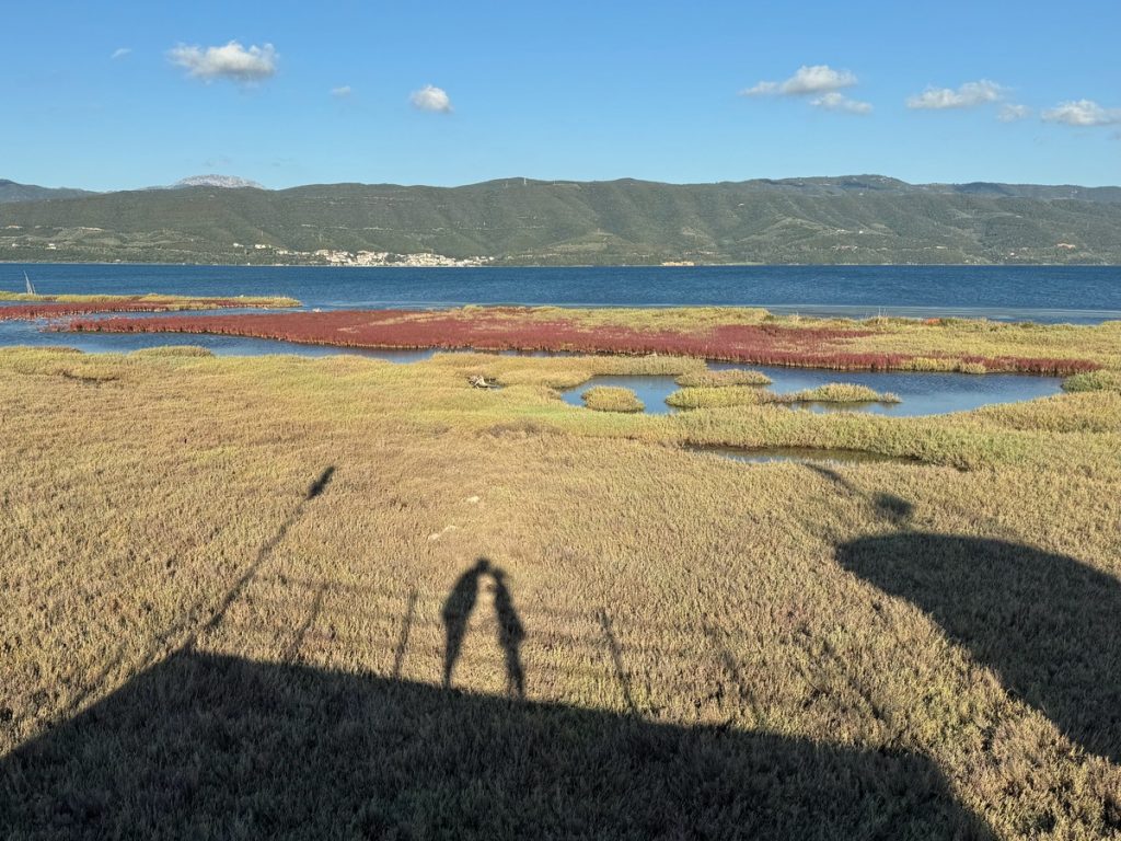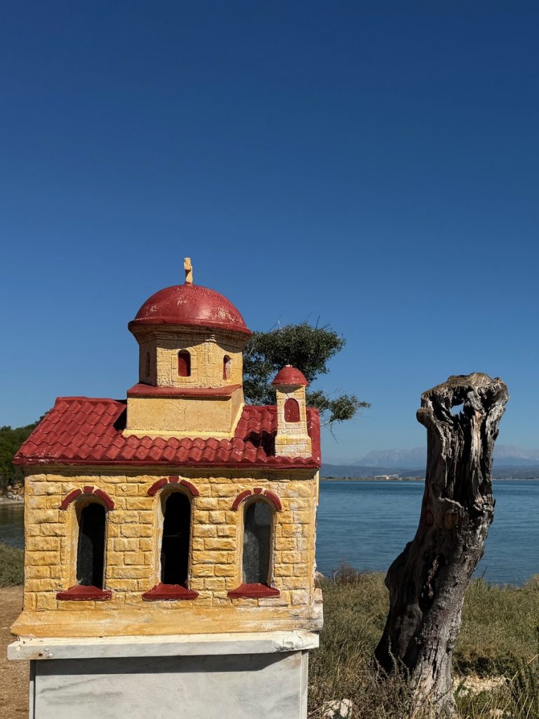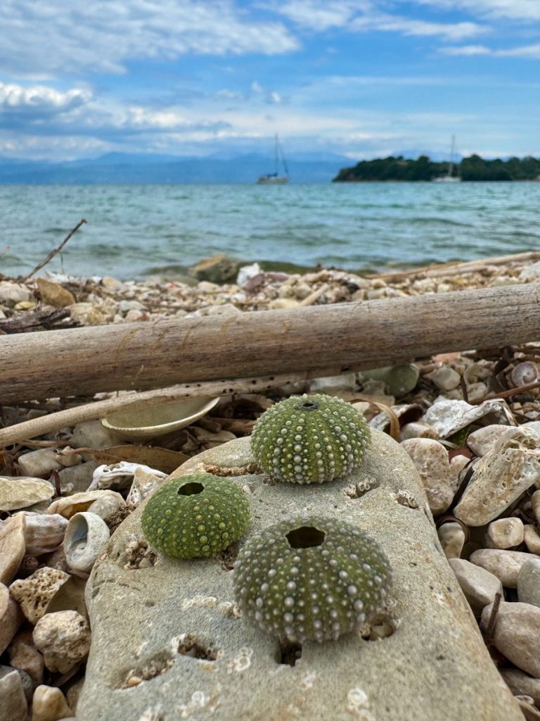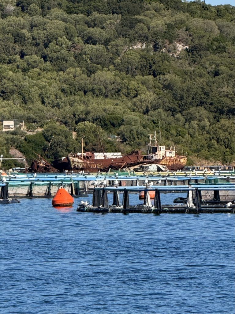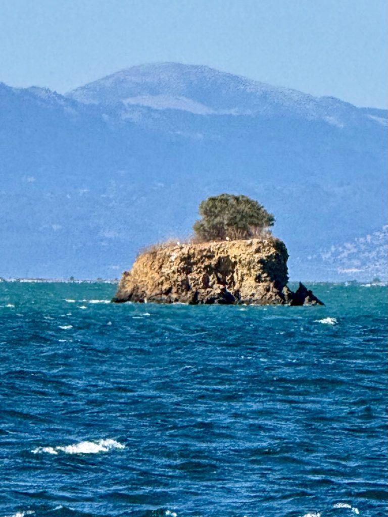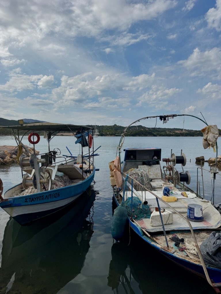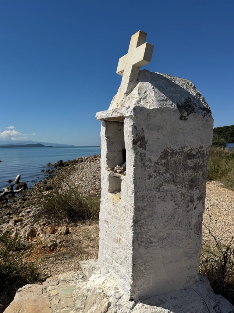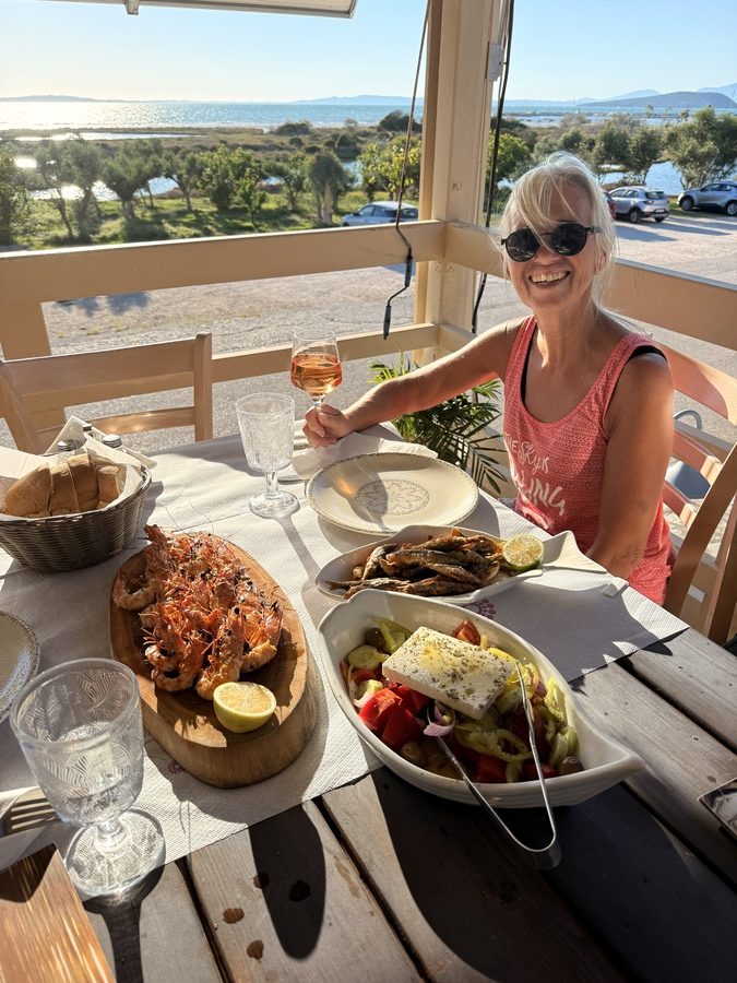 Unser heutiges Ziel heißt Koronisi und ist eine ehemalige Insel im Mündungsdelta der Flüsse Louros und Arachtos. Wir haben gelesen, dass man hier am besten die Ambrakischen Scampi essen kann. Heute ist der Ort auch mit dem Auto über den Damm erreichbar. Der kleine zur Vwrsandung neigende Hafen liegt auf der Westseite des Ortes. Davor zu ankern empfiehlt sich bei Westwind nicht. Daher umrunden wir den Ort und die vorgelagerten kleinen Inselchen und Felsen weiträumig. Die Inseln wirken fast wie aus dem chinesischen Meer hierher vertrieben mit ihren steilen Felsen mit Baumbewuchs obendrauf. Auf der Ostseite finden wir einen schönen Ankerplatz auf 3,5 Metern Tiefe ganz für uns alleine. Nach einem erneuten erfrischenden Bad samt kleiner Wohneinheit, setzen wir mit dem Dinghi zur Ortserkundung über. Wir ziehen das Dinghi an einem flachen Badestrand mit Strandbar (leider saisonal bereits geschlossen) an Land. Zum Ort führt eine kleine Straße. Nach einem Kilometer stehen wir auf der anderen Seite am Hafen. Ein paar Segelboote (wahrscheinlich mit Hubkiel) liegen hier. Außerdem sehen wir Kitesurfer, für die der auflandige Wind und das flache Gewässer ideal sind. Sie gehören zu einigen Wohnmobilen, die am Strand stehen. Die Tavernen am Hafen haben geschlossen, ob aufgrund der Uhrzeit, des Wochentages oder des Saisonendes ist nicht erkennbar. Wir folgen der Straße, um den Ort südlich zu umwandern und treffen dabei doch noch auf eine geöffnete Taverne. Zur Auswahl des Fisches werden wir in die Küche gebeten. Wir entscheiden uns für ein Duzend der Scampi und eine Portion frittierte Sardinen – dazu griechischen Salat und Brot. Es ist ein Gedicht! Zwar mit 55€ (inkl. 0,5L Rosewein und 1,5L Wasser) für griechische Verhältnisse nicht gerade günstig, aber wenn die Leistung stimmt, zahlen wir das gerne!