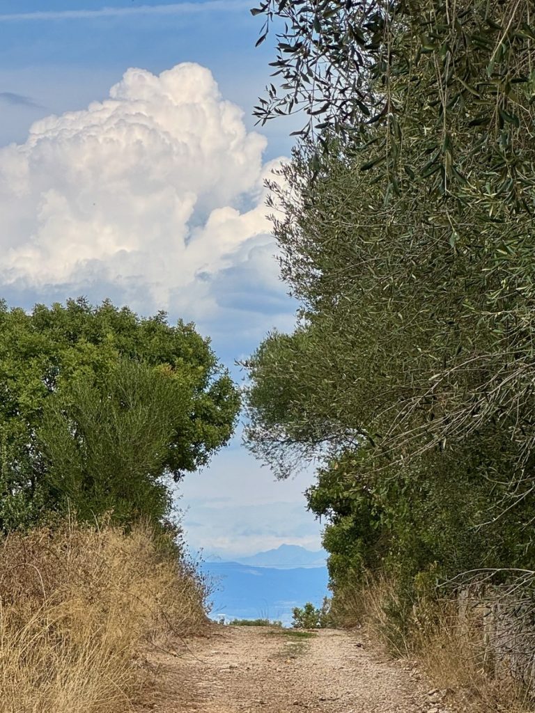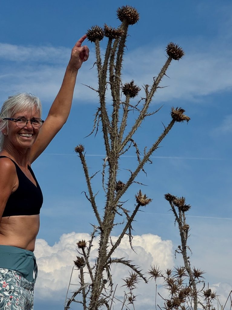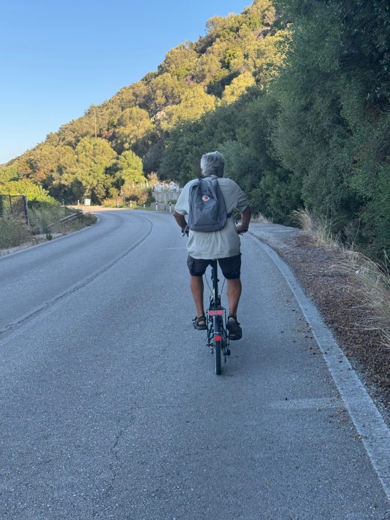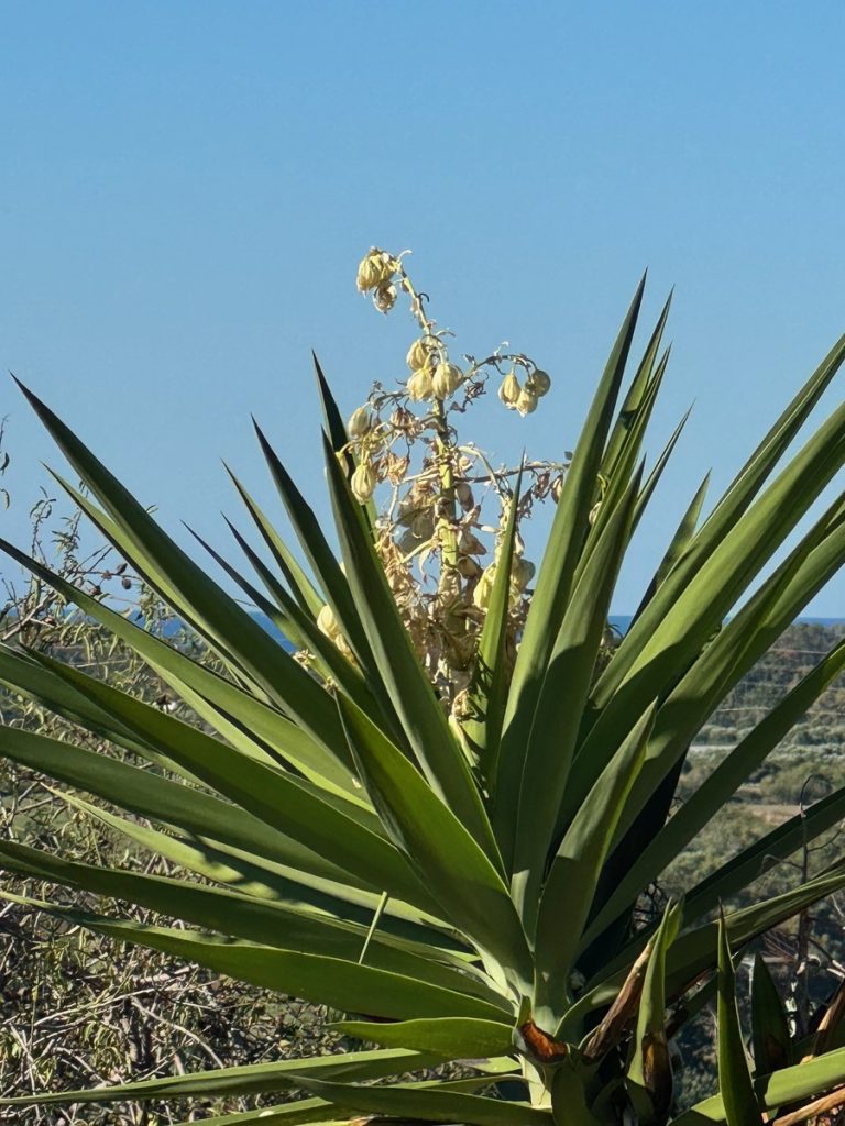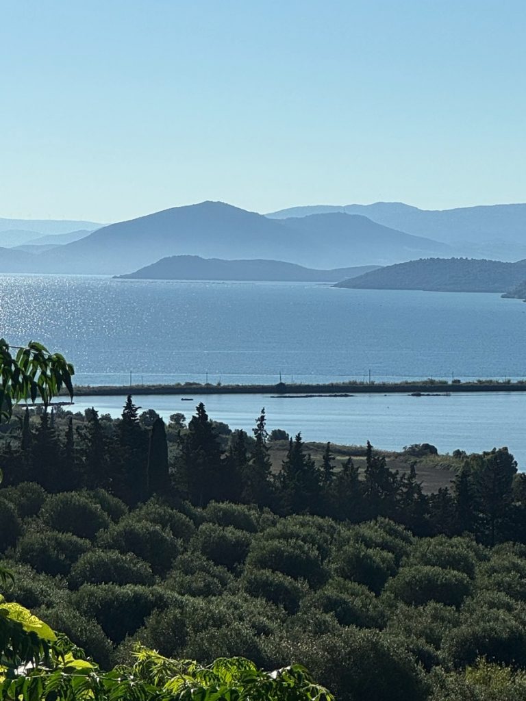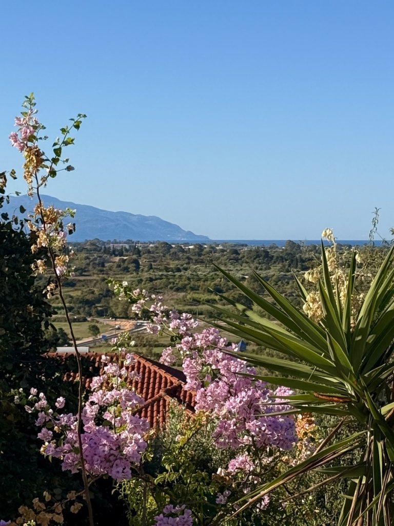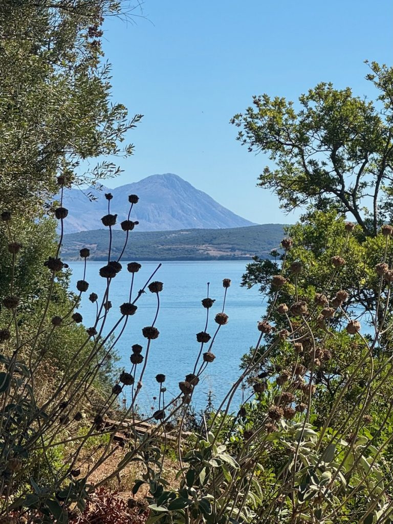 Unterwegs öffnen sich ein paar hübsche Blickachsen auf Golf, Berge und Ankerbucht und es geht vorbei an beeindruckend hohen vertrockneten Diesteln. Zurück an der Ankerbucht sieht sie zwei Schildkröten dicht vor dem Ufer – leider zu kurz, um auf ein Foto gebannt zu werden. Stattdessen gibt es zum Abschluss einen Frappé in der Strandtaverne, bevor „Taxi Werner“ sie wieder abholt.
