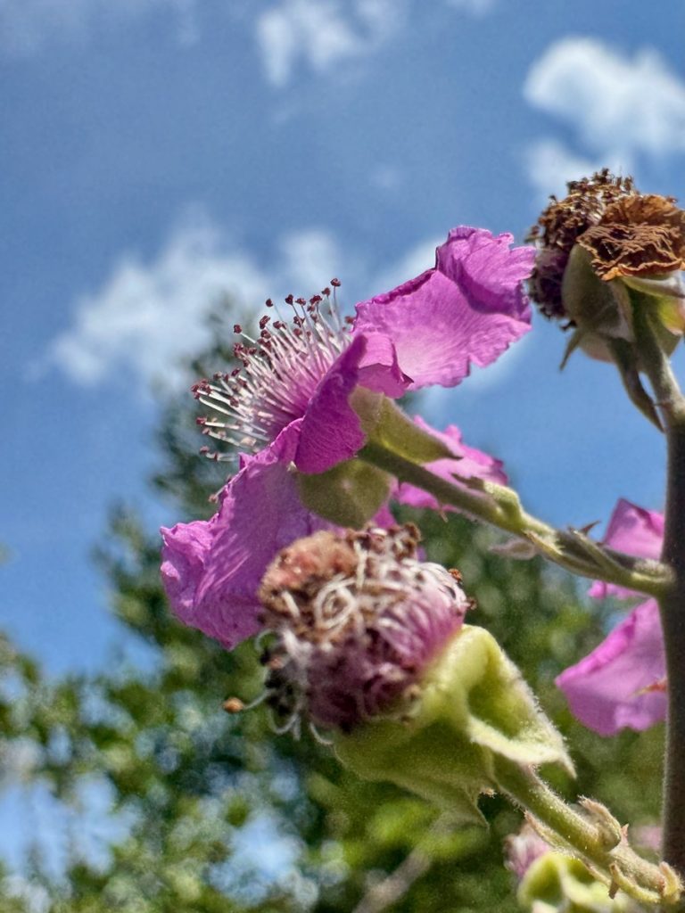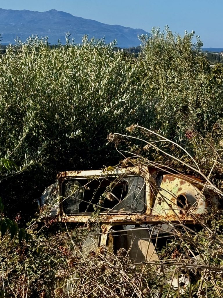 Hier ist alles wieder sehr trocken, ganz anders als am Nordufer des Ambrakischen Golfes, wo einige Flüsse Nordwest Griechenlands münden. Am Strand gibt es eine etwas schmuddelig wirkende Taverne mit einer Wohnwagen Ansammlung, in der anscheinend die Eigentümer wohnen. Leider findet sich auch wieder reichlich Müll entlang der Straße. Barbaras geplante Rundwanderung um einen kleinen See endet vor einem undurchdringlichen Brombeergestrüpp. Mit nackten Beinen, in Flipflops und ohne Machete ist hier kein Durchkommen. Auffällig ist an ihnen, dass sie neben vertrockneten Früchten auch Blüten und pralle unreife Früchte tragen. Bei uns zuhause ist die Brombeersaison bereits vorbei – Barbara kochte ihre Marmelade dort schon im August!