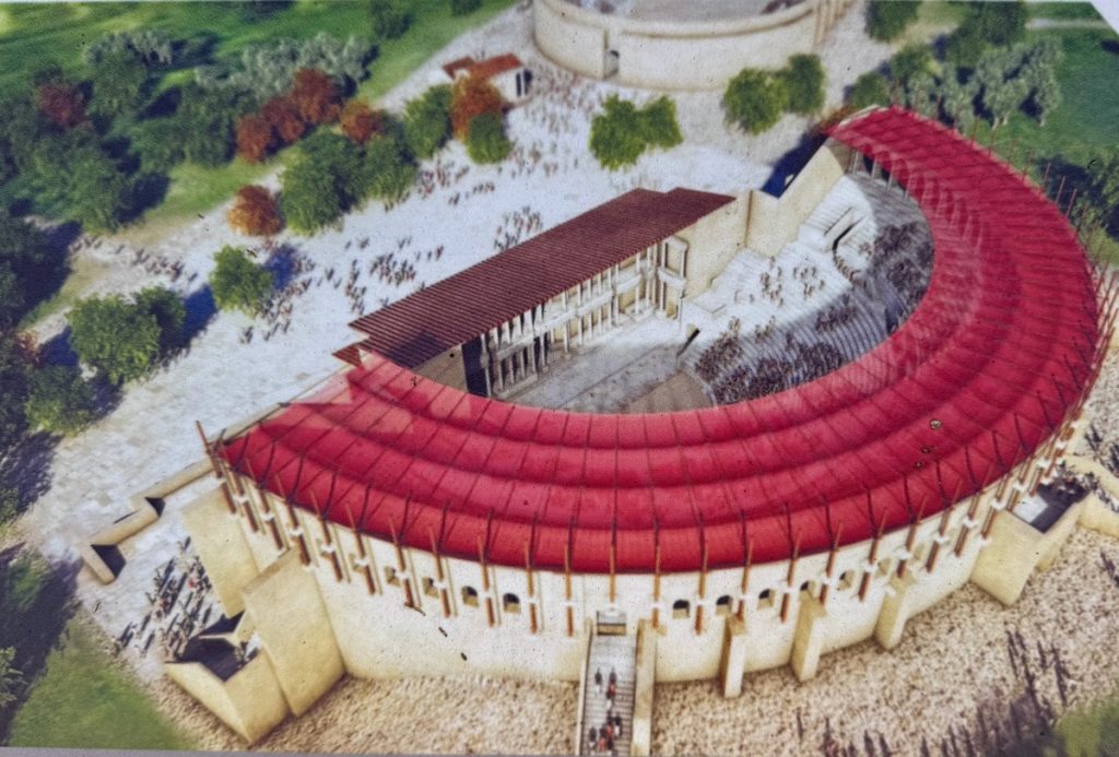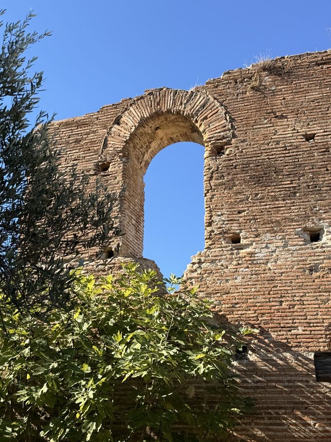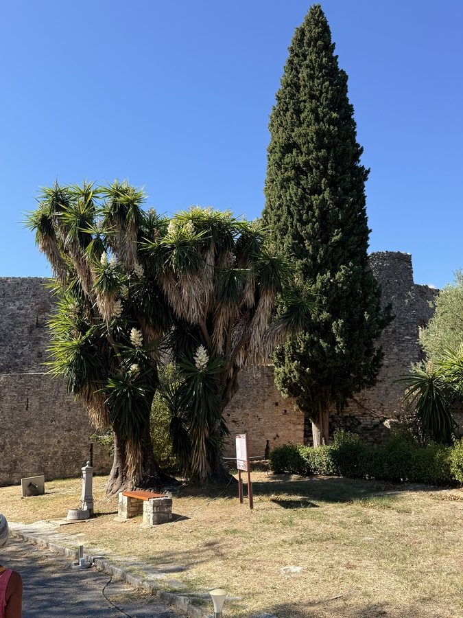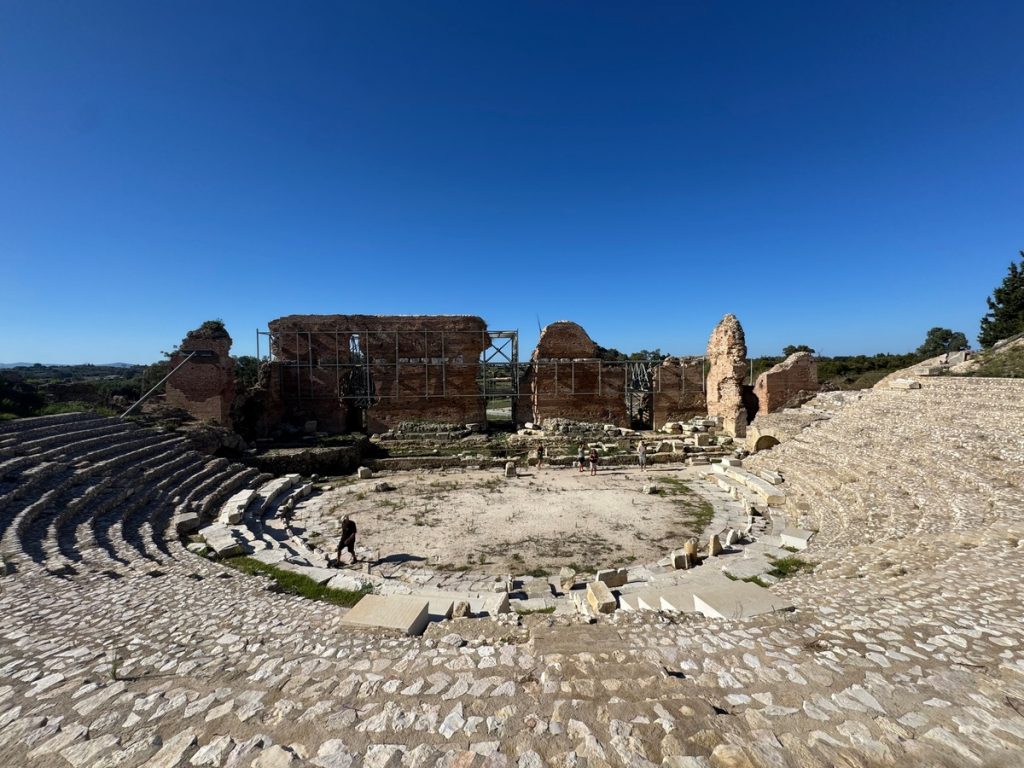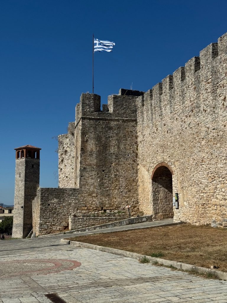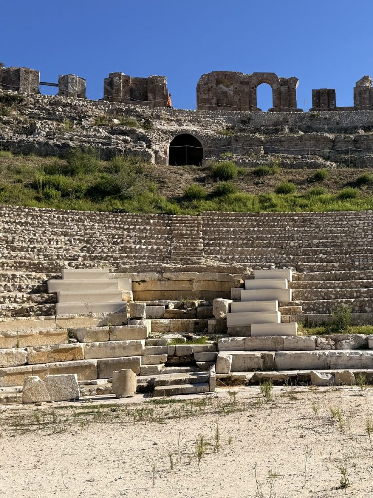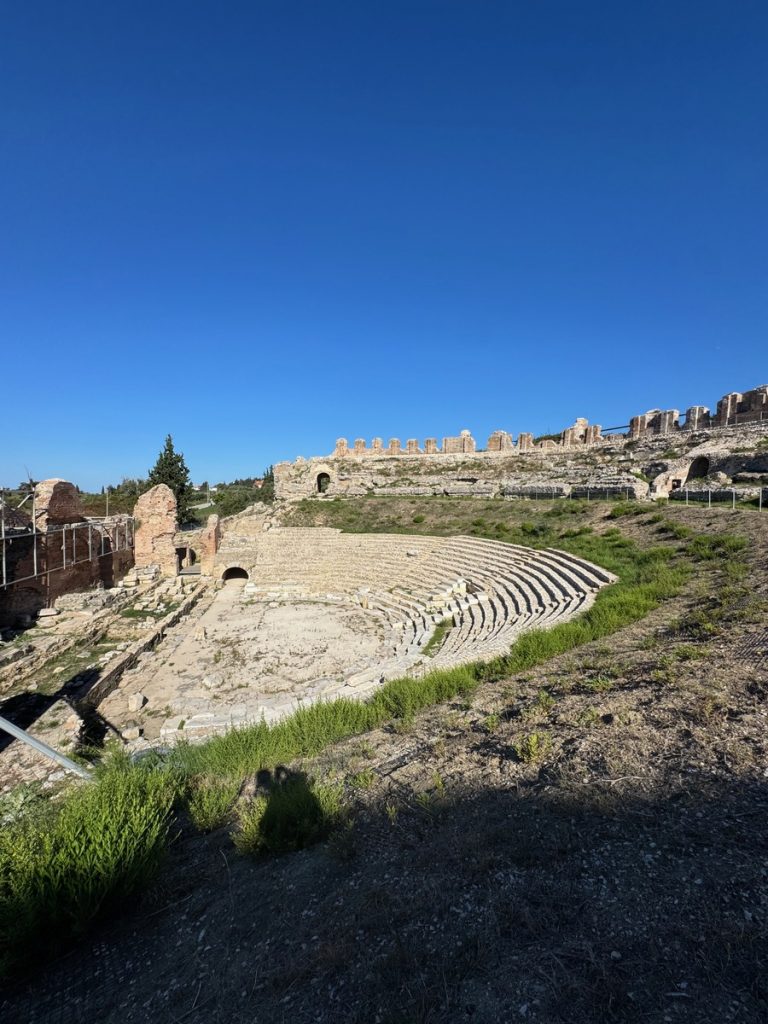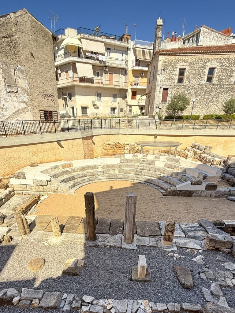 Nun geht es zur Markthalle. Der Weg dorthin führt über eine Straße, deren Belag komplett erneuert wird. Statt sie zu sperren, wird hier zwischen Menschen und Fahrzeugen gebaut – in Deutschland nicht vorstellbar. Allerdings fällt uns auch sofort ins Auge, dass die in der Mitte schon vor einiger Zeit gelegte Entwässerungsrinne durch die weitere Straßennutzung bestimmt auf einem Drittel bereits beschädigt ist. Wie man es macht… Rechts und links sehen wir Lebensmittelgeschäfte, überwiegend Fisch. Die Preise sind sehr moderat. Für uns kommt ein Einkauf hier aber nicht in Frage – zu weit ist der Rückweg in der prallen Sonne. Die Markthalle ist eine Ernüchterung. Nur etwa die Hälfte der Stände sind belegt. Vielleicht sind wir am falschen Tag oder zur falschen Zeit hier? Wir wenden uns der Festungsanlage zu. Eintritt wird nicht erhoben, zu sehen gibt es aber auch wenig. In den Ruinen steht als einziges intaktes Gebäude ein Gotteshaus, in dem sich aktuell eine Kunstausstellung befindet. Leider sind alle Schautafeln ausschließlich auf griechisch und den Exponaten können wir (Kunstbanausen?) nichts abgewinnen. Also wenden wir uns wieder der Innenstadt zu, um irgendwo zu frühstücken. Letztlich enden wir auf einer schattigen Treppenstufe mit Wasser und je einer griechischen Pastete vom Bäcker. Die Cafés boten alle nur Getränke. Als letzte Sehenswürdigkeit steht nun noch das kleinste Amphitheater Griechenlands auf dem Programm. Es wurde zufällig bei Bauarbeiten im Stadtzentrum 1976 gefunden und nun mit EU-Mitteln 2014 bis 2020 restauriert und hergerichtet. Für Wegweiser dorthin hat das Geld dann aber wohl nicht mehr gereicht. Aber dank digitaler Medien haben wir es dennoch gefunden.