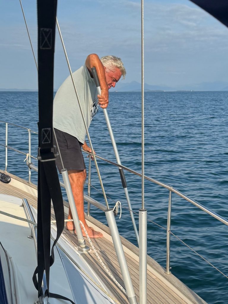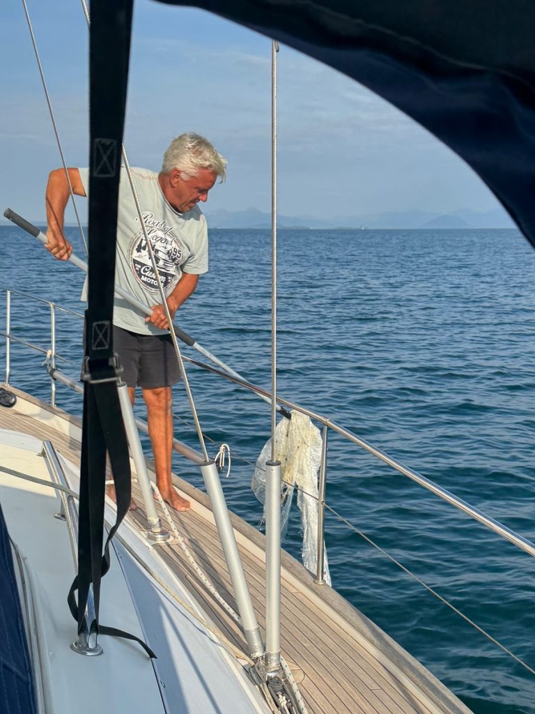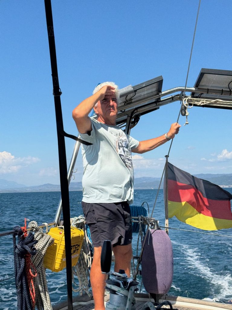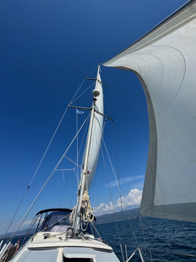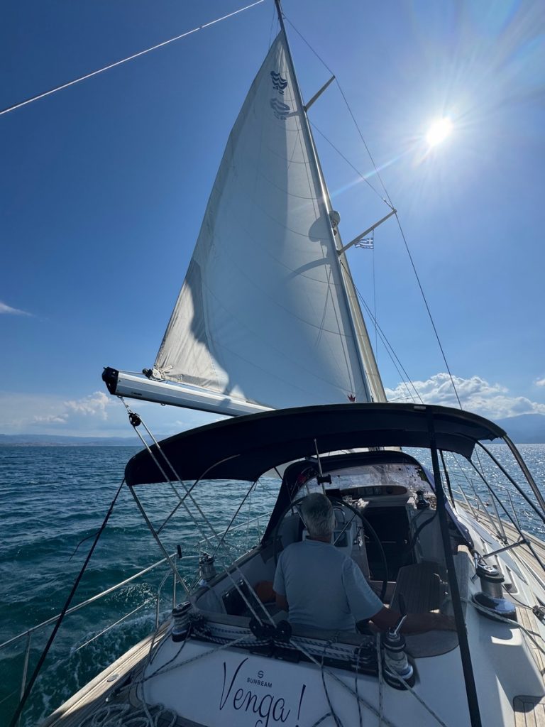 Auf Empfehlung unseres schwedisch-niederländischen Freundes Johan, wollen wir heute in der Bucht von Loutraki ankern. Die App Navili verspricht uns dort heute gute Ankerbedingungen. Doch vorher soll Werner noch einmal in den Mast. Weil wir das Antennenkabel allein nicht eingezogen bekamen, hatten wir es als Notlösung außen am Mast festgeklebt. Das Kabel haben die Profis beim Einbau zwar wieder abgenommen, aber die Klebereste sind noch am Mast. Bei der hiesigen UV-Einstrahlung wollen wir sie abpuhlen, bevor sie sich eingebrannt haben. Danach können wir auch unsere beiden Leinen (Spifall und Dirk), an denen Barbara – mit Hilfe der elektrischen Winsch – Werner in den Mast gezogen hat, wieder zurückbauen. Eigentlich gehören in die Führungen nämlich der Baumniederholer und der Unterliekstraffer des Großsegels. Nach dem Rückbau ist jetzt auch das Großsegel wieder einsatzfähig. Da wir heute eher einen Halbwindkurs erwarten und morgen möglicherweise sogar kreuzen müssen, liegt uns die Einsatzfähigkeit des Großsegels am Herzen. Werner wird dann noch von unserem Nachbarn um Hilfe gebeten. Er ist Einhandsegler und braucht für eine Verschraubung eine Hand unter Deck und eine am Oberdeck, allein unmöglich zu schaffen. Danach geht es dann aber wirklich los. Das setzen des Rollgroßes ist für uns noch immer aufregend. Hoffentlich verklemmt sich nichts und das Segel rollt sauber aus – es klappt! Bei anfänglichen 6 Knoten Wind gleitet Venga! mit 4 Knoten über das glatte Wasser. Wind und Fahrt nehmen zu – am Ende sehen wir 18 Knoten Wind und 7,5 Knoten Fahrt über Grund.