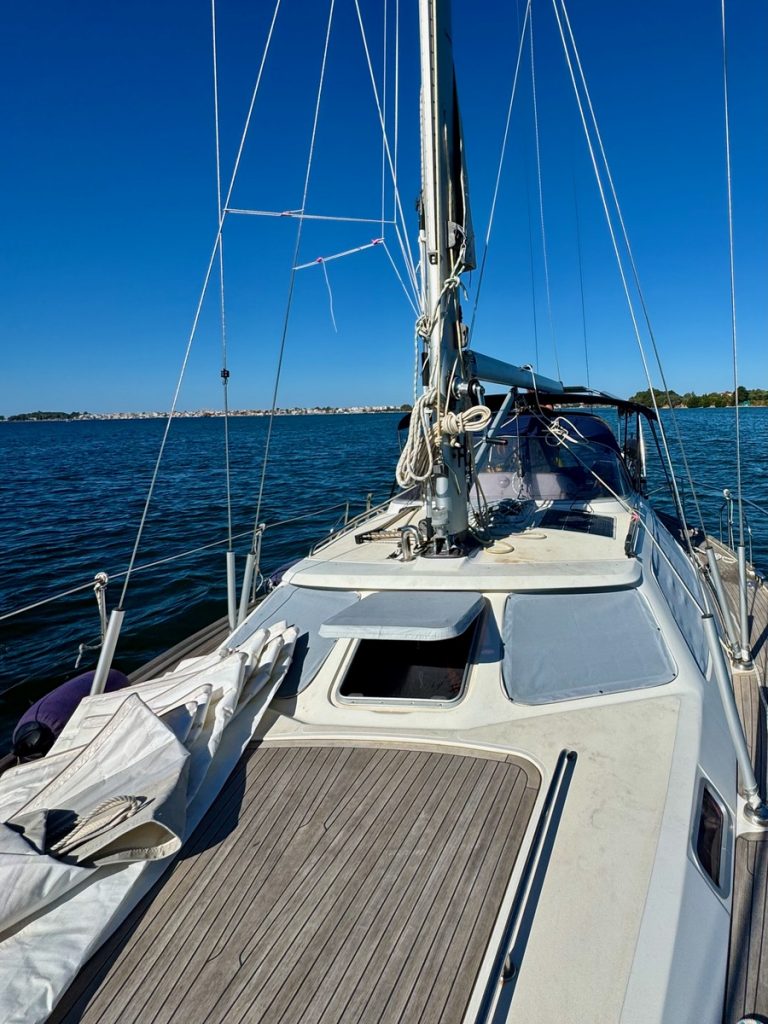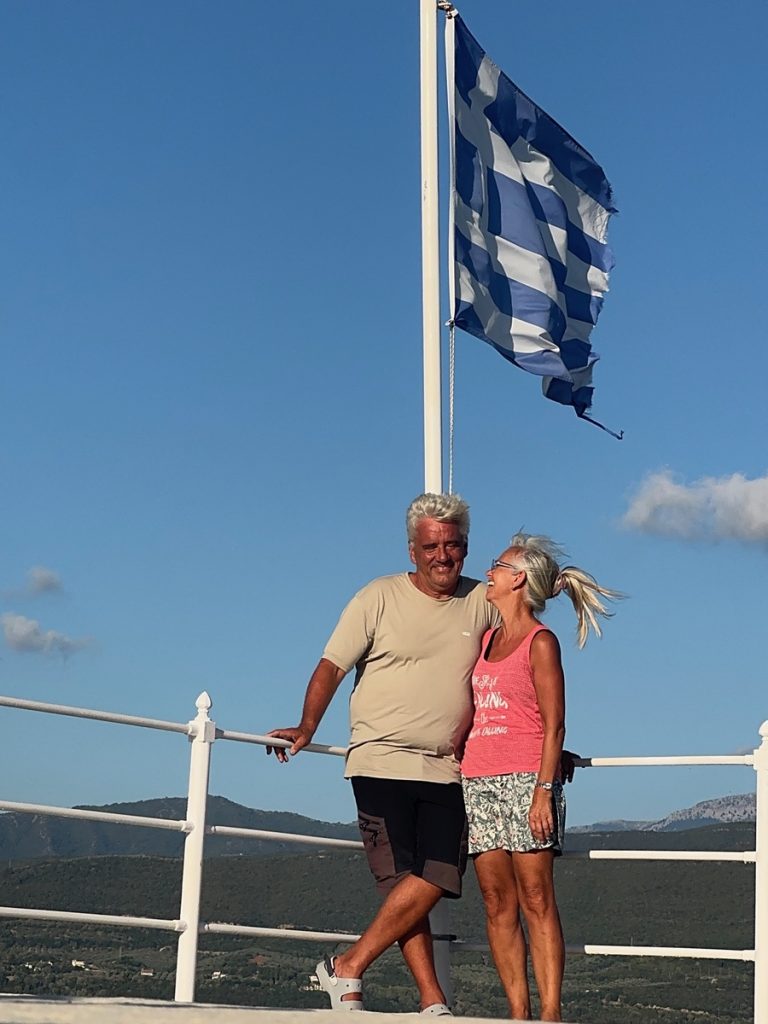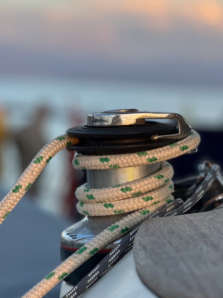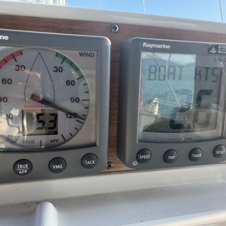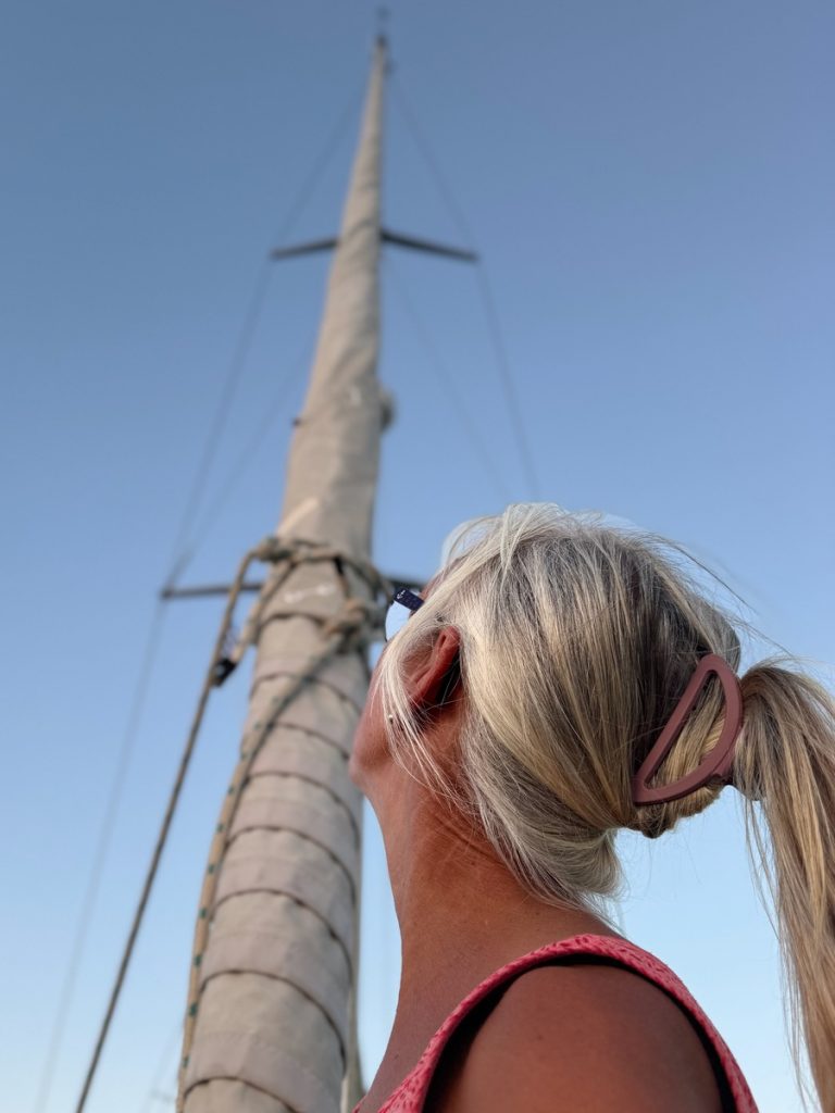 Auf Empfehlung unseres schwedisch-niederländischen Freundes Johan, wollen wir heute in der Bucht von Loutraki ankern. Die App Navili verspricht uns dort heute gute Ankerbedingungen. Doch vorher soll Werner noch einmal in den Mast. Weil wir das Antennenkabel allein nicht eingezogen bekamen, hatten wir es als Notlösung außen am Mast festgeklebt. Das Kabel haben die Profis beim Einbau zwar wieder abgenommen, aber die Klebereste sind noch am Mast. Bei der hiesigen UV-Einstrahlung wollen wir sie abpuhlen, bevor sie sich eingebrannt haben. Danach können wir auch unsere beiden Leinen (Spifall und Dirk), an denen Barbara – mit Hilfe der elektrischen Winsch – Werner in den Mast gezogen hat, wieder zurückbauen. Eigentlich gehören in die Führungen nämlich der Baumniederholer und der Unterliekstraffer des Großsegels. Nach dem Rückbau ist jetzt auch das Großsegel wieder einsatzfähig. Da wir heute eher einen Halbwindkurs erwarten und morgen möglicherweise sogar kreuzen müssen, liegt uns die Einsatzfähigkeit des Großsegels am Herzen. Werner wird dann noch von unserem Nachbarn um Hilfe gebeten. Er ist Einhandsegler und braucht für eine Verschraubung eine Hand unter Deck und eine am Oberdeck, allein unmöglich zu schaffen. Danach geht es dann aber wirklich los. Das setzen des Rollgroßes ist für uns noch immer aufregend. Hoffentlich verklemmt sich nichts und das Segel rollt sauber aus – es klappt! Bei anfänglichen 6 Knoten Wind gleitet Venga! mit 4 Knoten über das glatte Wasser. Wind und Fahrt nehmen zu – am Ende sehen wir 18 Knoten Wind und 7,5 Knoten Fahrt über Grund.