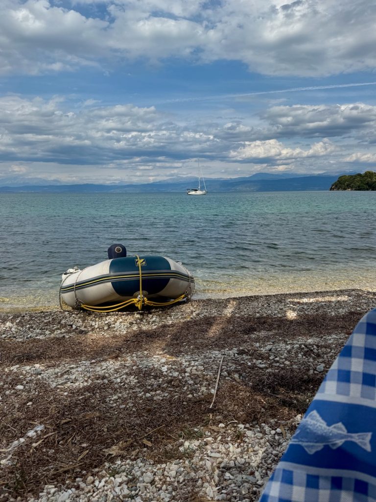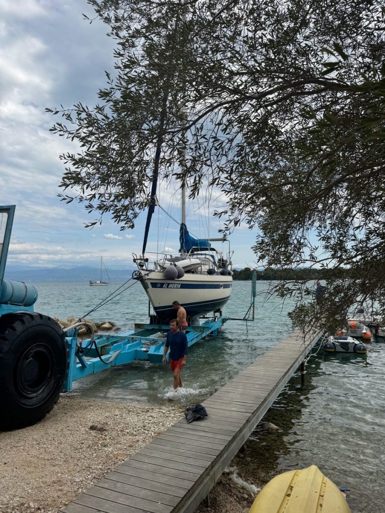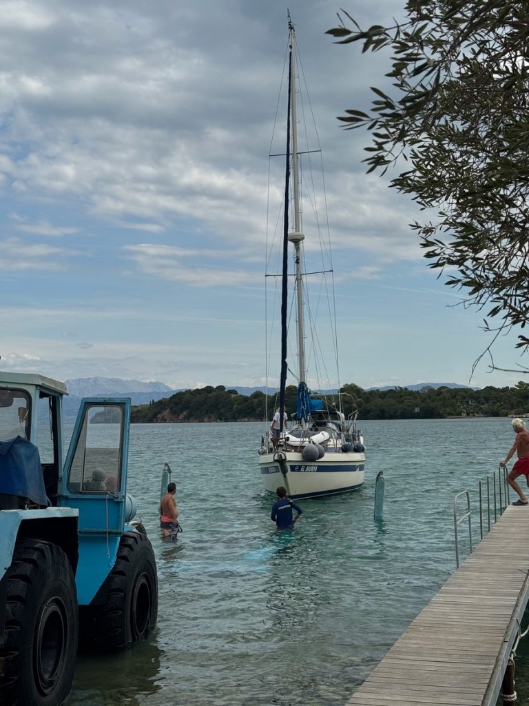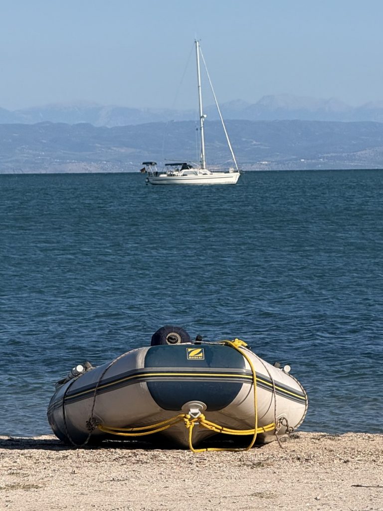 Die Nacht ist ruhig geblieben – kein Starkwind. Nach dem Morgenkaffee mit fantastischem Blick auf hübsche, sich überlagernde Bergsilhouetten am Horizont, nutzen wir die morgendliche Ostbrise und machen uns unter Vorsegel auf den Weg. Eigentliches Ziel ist eine Bucht vor Vonitsa. Unterwegs entdecken wir eine auf dem Wasser schwimmende Plastikplane, die Werner mit dem Bootshaken einsammelt und passieren dann aber die einladend aussehende „Roúgas Bucht“ , in der bereits ein paar Boote ankern. Diese Bucht ist sowohl gegen Ost, als auch gegen Westwinde geschützt. Nur Nordwind kommt herein. Navily spricht zudem von Schildkröten und Rochen, die man hier antreffen kann. Also biegen wir kurzentschlossen ab und suchen uns einen Platz auf Sand. Der Anker greift sofort. Nach dem Frühstück macht Werner den Taxifahrer und bringt Barbara an Land. Sie möchte zuschauen, wie hier bei einer kleinen, von Österreichern geführten Werft, die Boote aus dem Wasser geholt werden und anschließend etwas wandern.