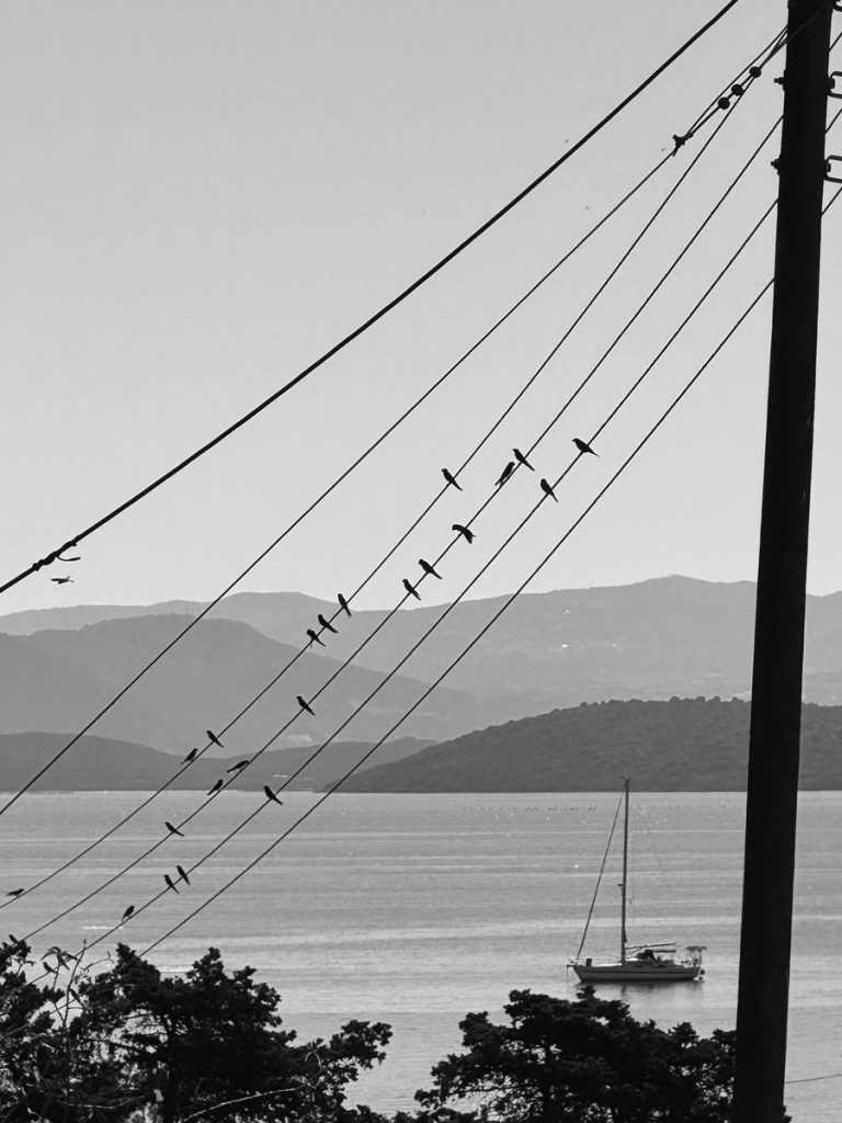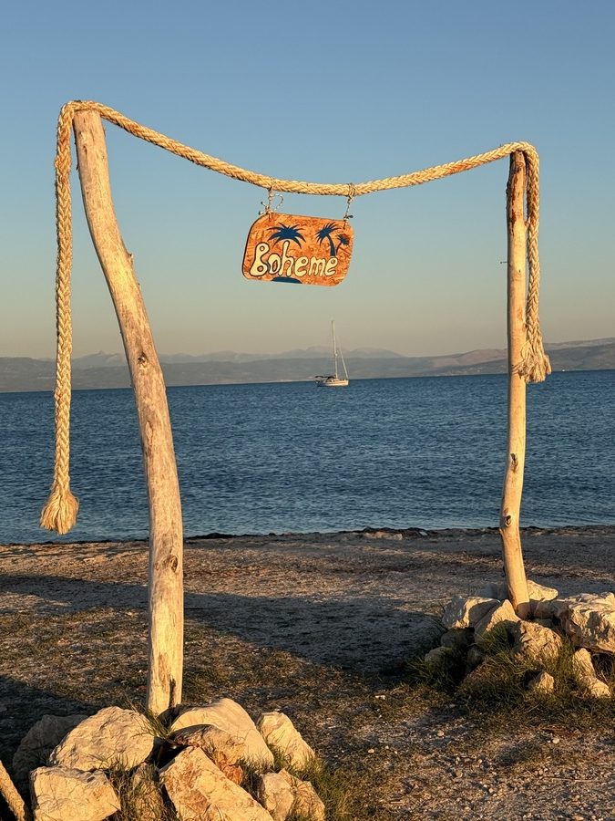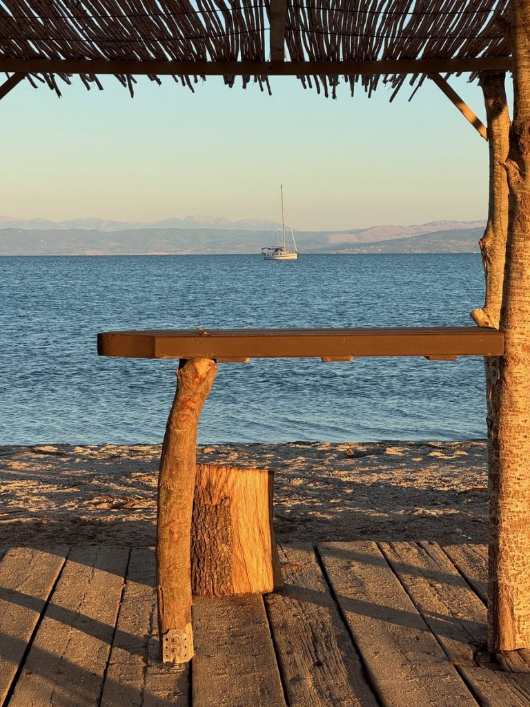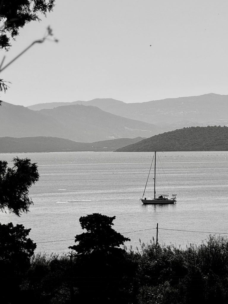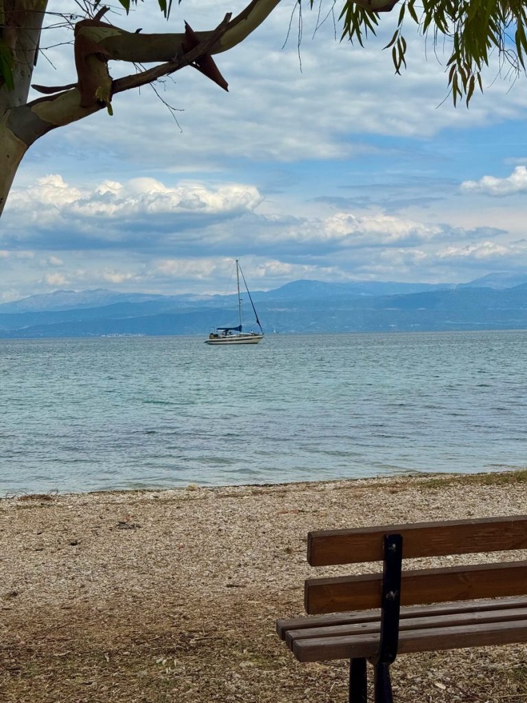 Die Nacht ist ruhig geblieben – kein Starkwind. Nach dem Morgenkaffee mit fantastischem Blick auf hübsche, sich überlagernde Bergsilhouetten am Horizont, nutzen wir die morgendliche Ostbrise und machen uns unter Vorsegel auf den Weg. Eigentliches Ziel ist eine Bucht vor Vonitsa. Unterwegs entdecken wir eine auf dem Wasser schwimmende Plastikplane, die Werner mit dem Bootshaken einsammelt und passieren dann aber die einladend aussehende „Roúgas Bucht“ , in der bereits ein paar Boote ankern. Diese Bucht ist sowohl gegen Ost, als auch gegen Westwinde geschützt. Nur Nordwind kommt herein. Navily spricht zudem von Schildkröten und Rochen, die man hier antreffen kann. Also biegen wir kurzentschlossen ab und suchen uns einen Platz auf Sand. Der Anker greift sofort. Nach dem Frühstück macht Werner den Taxifahrer und bringt Barbara an Land. Sie möchte zuschauen, wie hier bei einer kleinen, von Österreichern geführten Werft, die Boote aus dem Wasser geholt werden und anschließend etwas wandern.