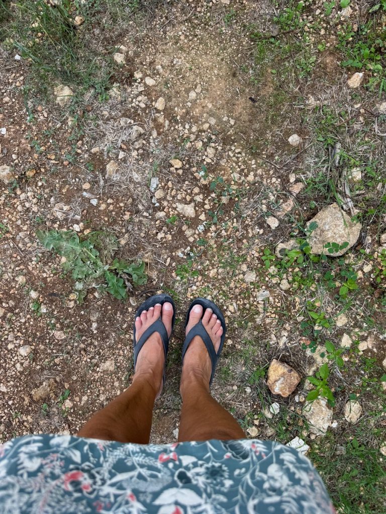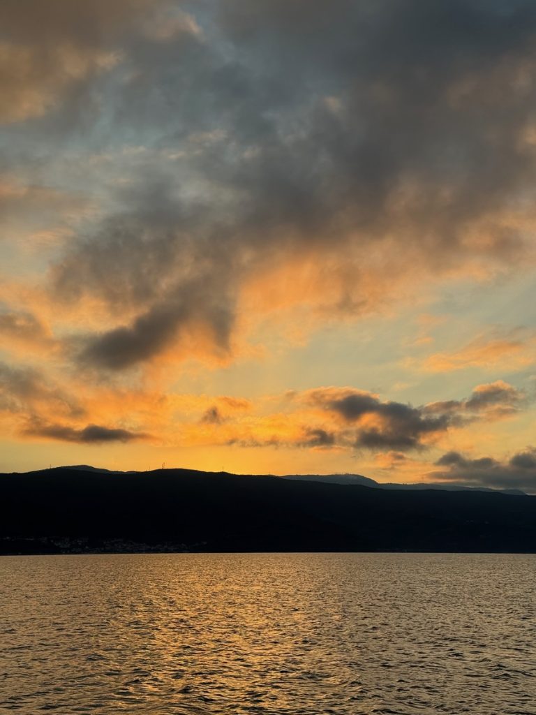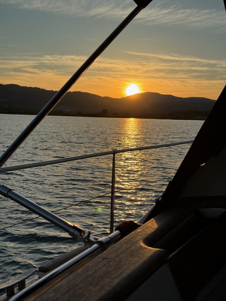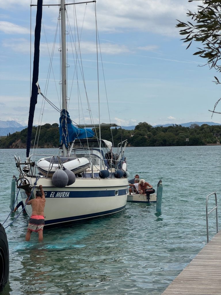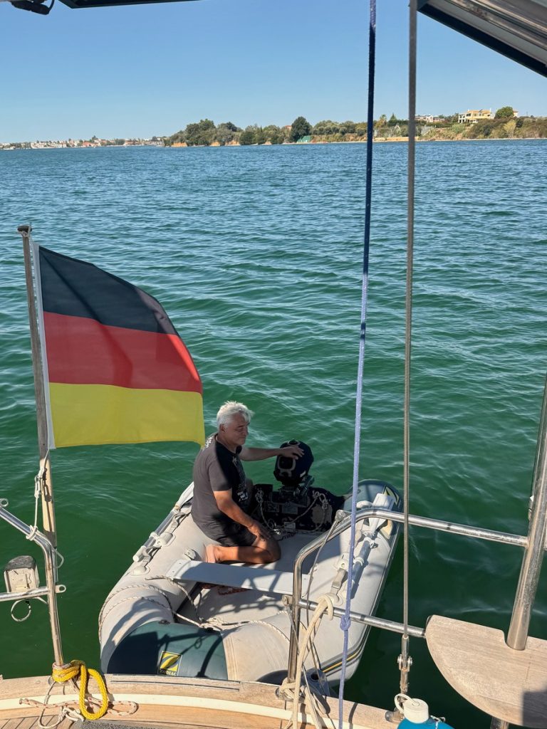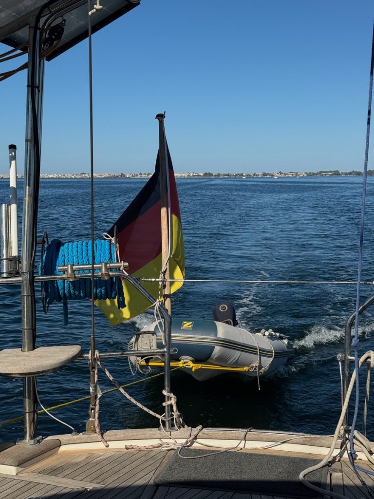 Heute müssen wir erstmal die Seele baumeln lassen! Wir springen ins (warme) Nass und umkreisen die Venga!, wir bauen das Bimini aus, um das Cockpit zu beschatten, schlagen die Genua an und starten nachmittags zum ersten Landgang. Dabei zahlen wir gleich mehrfach Lehrgeld. Zum einen ist es für eine Wanderung, noch dazu auf geteerter Straße, viel zu heiß, zweitens schickt uns Komoot in eine Sackgasse statt auf die geplante Rundwanderung, drittens treffen wir wieder auf freilaufende und sehr unfreundliche Hunde und viertens sorgt der aufkommende Westwind bei unserer Rückkehr für eine überaus nasse Überfahrt mit unserem Dinghi.