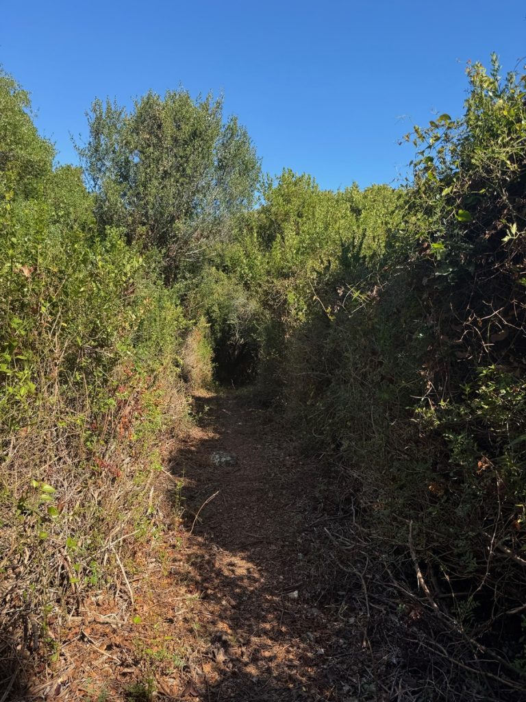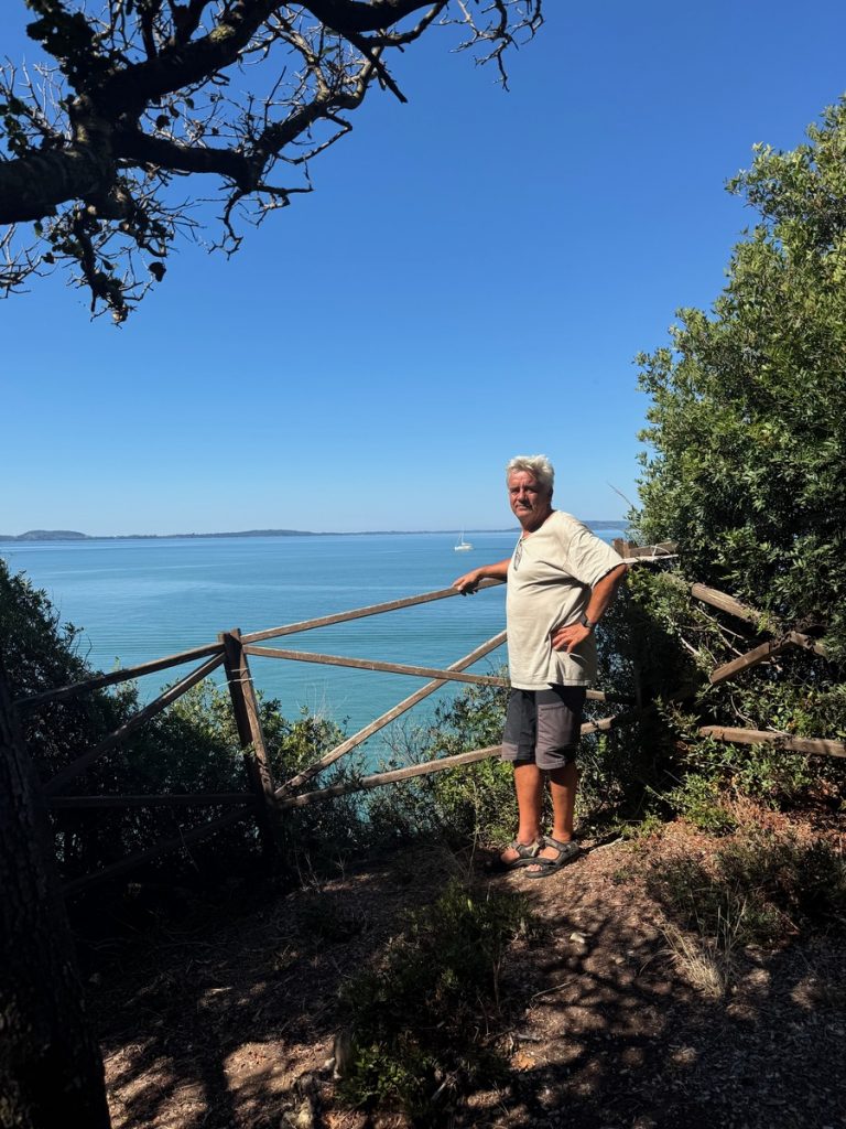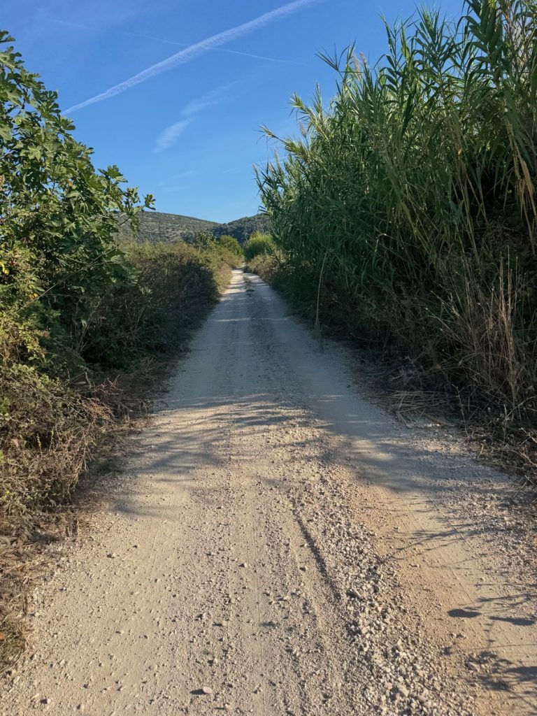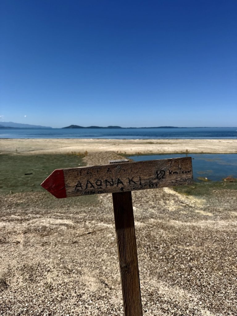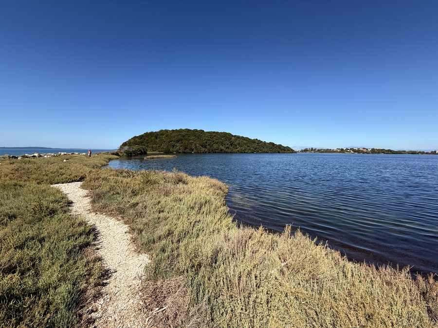 Da der Wind ja sowieso erst am Nachmittag kommt, beschließen wir den Vormittag für eine Wanderung rund um den Ort zu nutzen. Auch einen Abstecher zur Kirche im Ort darf da nicht fehlen. Die Sonne brennt wieder erbarmungslos vom blauen Himmel. Für den Rückweg hat Barbara daher einen Trampelpfad entlang des Strandes und durch einen Wald aus Steineichen ausgesucht. Auf Komoot sieht es zwar so aus, als sei der Weg nicht durchgängig vorhanden, aber dann gehen wir im Zweifel ein Stück im seichten Wasser! Am Strand entdecken wir dann jedoch erfreulicherweise einen Wegweiser, der genau auf diesen Pfad hinzuweisen scheint – noch besser.