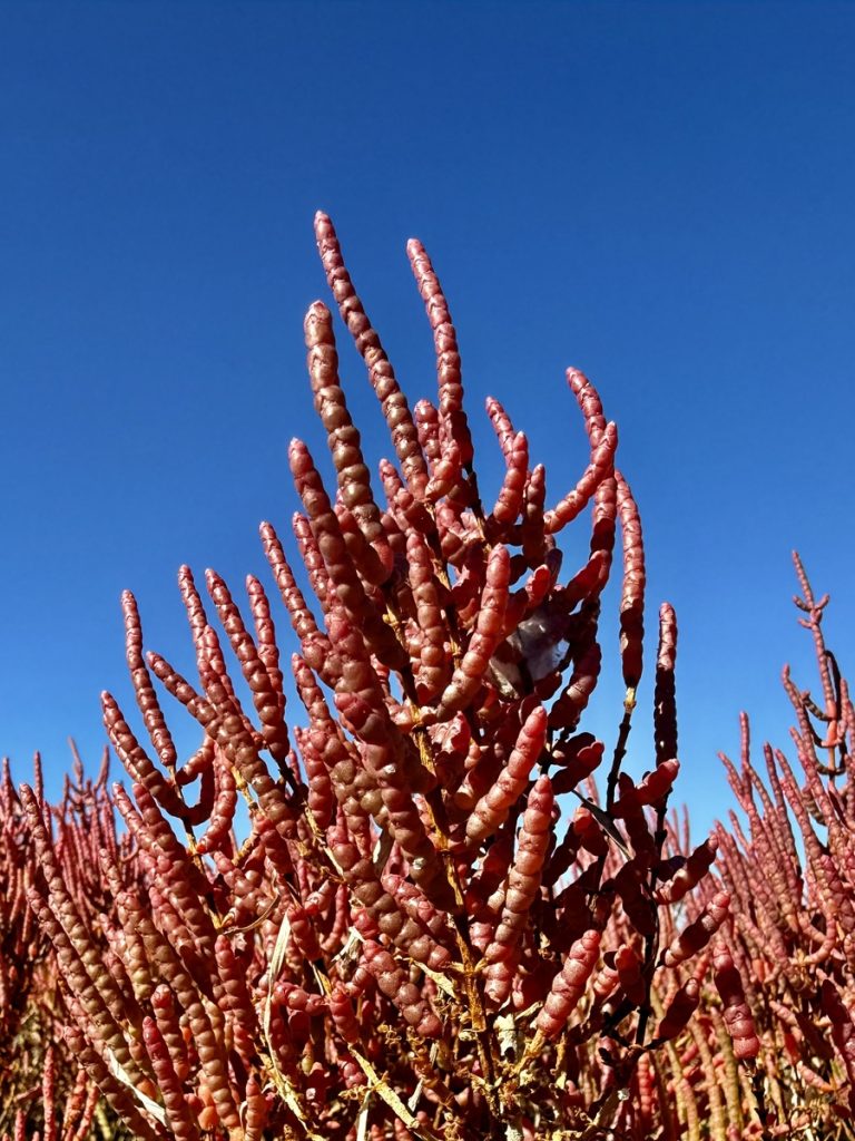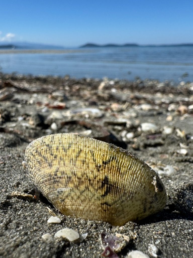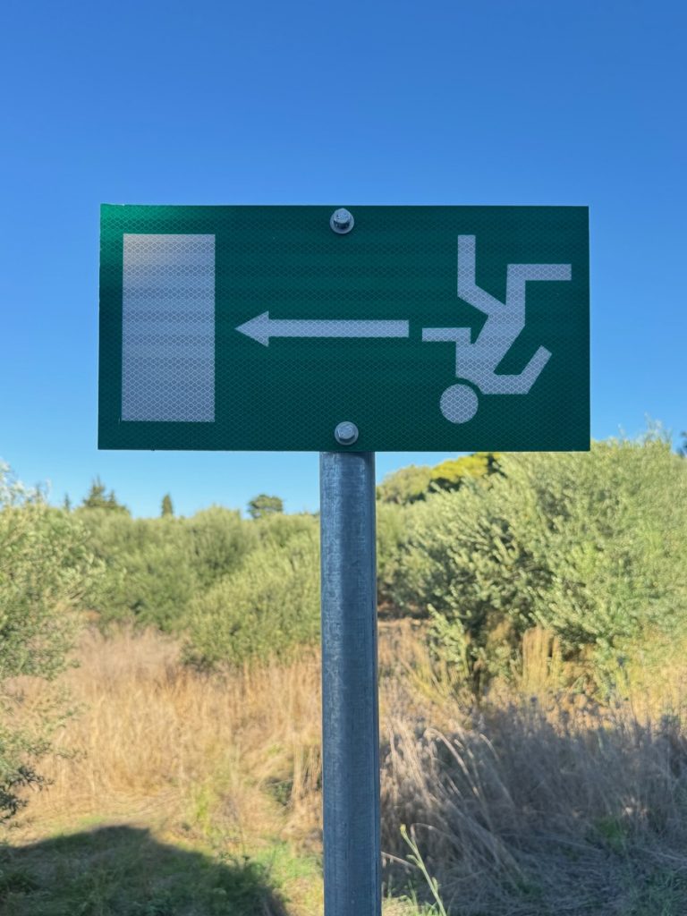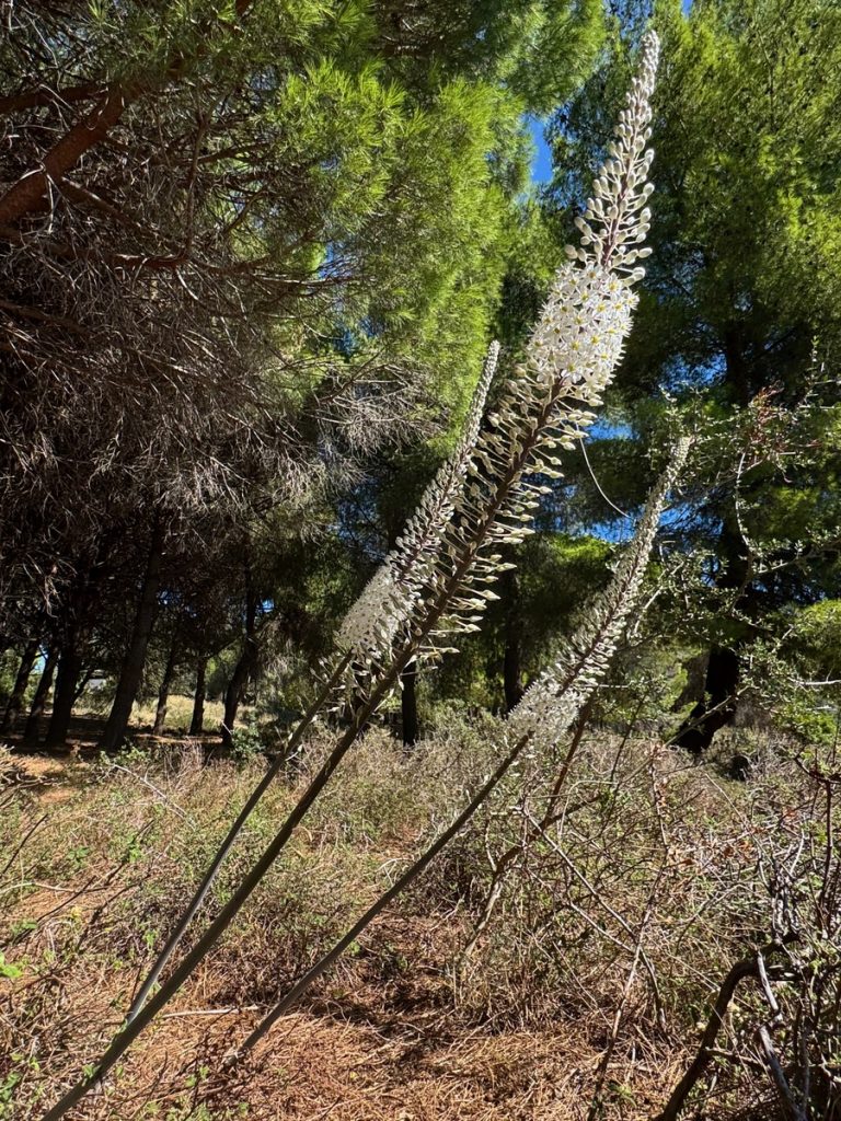 Da der Wind ja sowieso erst am Nachmittag kommt, beschließen wir den Vormittag für eine Wanderung rund um den Ort zu nutzen. Auch einen Abstecher zur Kirche im Ort darf da nicht fehlen. Die Sonne brennt wieder erbarmungslos vom blauen Himmel. Für den Rückweg hat Barbara daher einen Trampelpfad entlang des Strandes und durch einen Wald aus Steineichen ausgesucht. Auf Komoot sieht es zwar so aus, als sei der Weg nicht durchgängig vorhanden, aber dann gehen wir im Zweifel ein Stück im seichten Wasser! Am Strand entdecken wir dann jedoch erfreulicherweise einen Wegweiser, der genau auf diesen Pfad hinzuweisen scheint – noch besser.